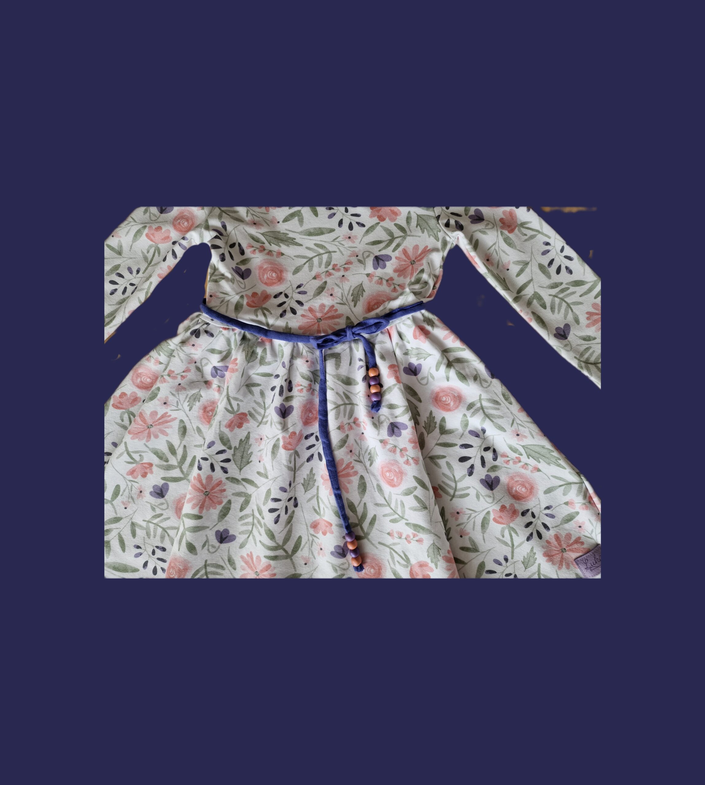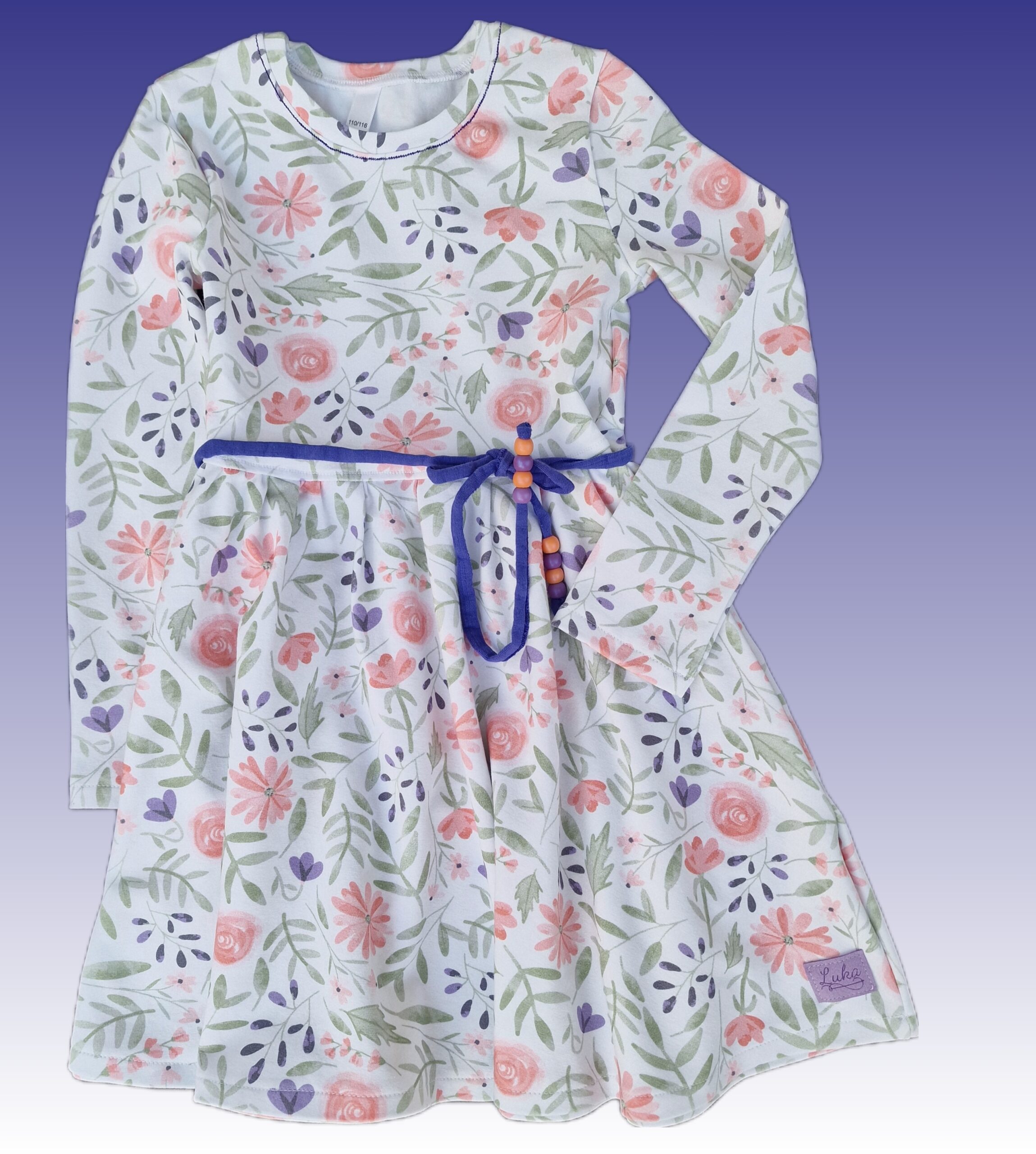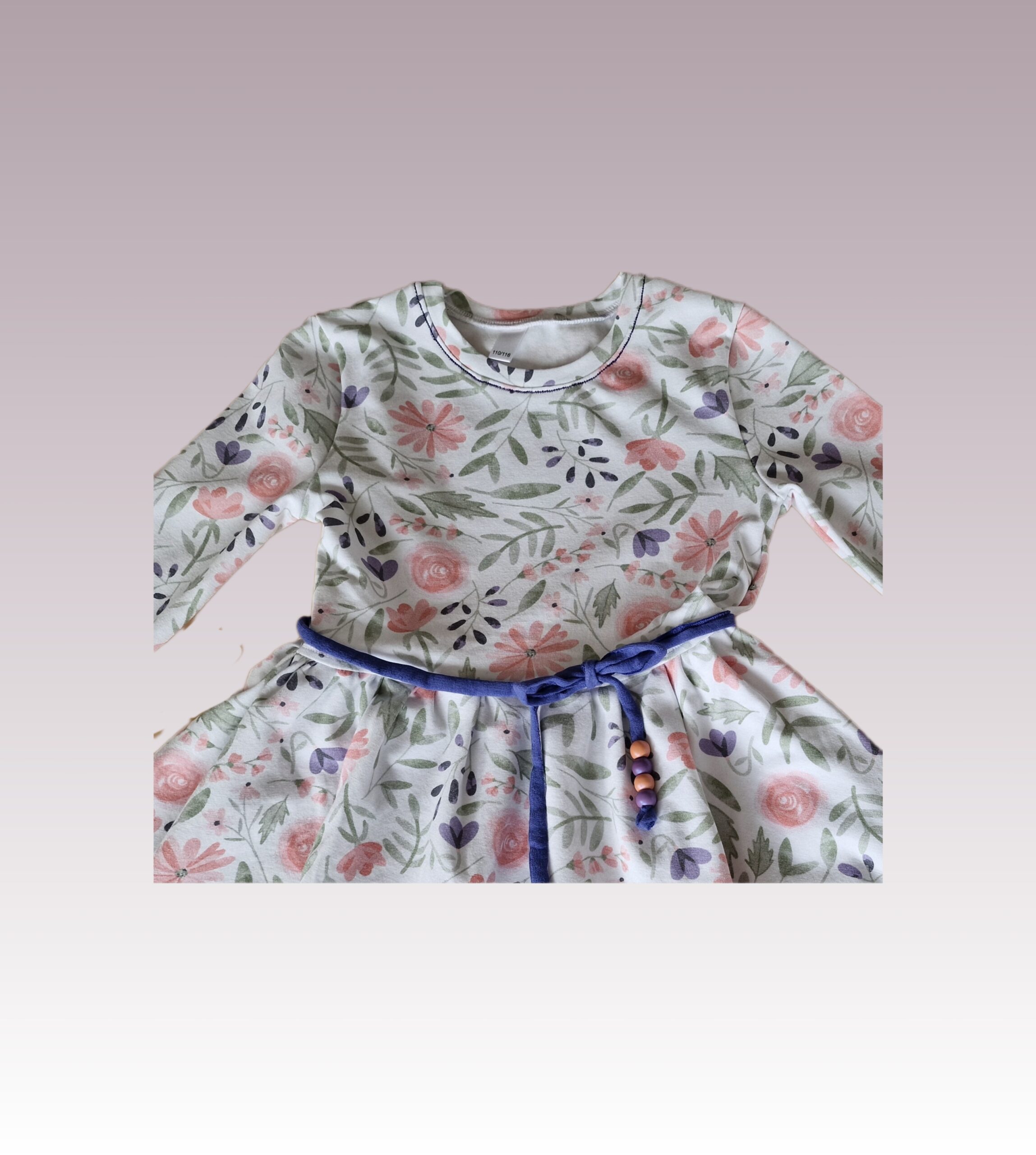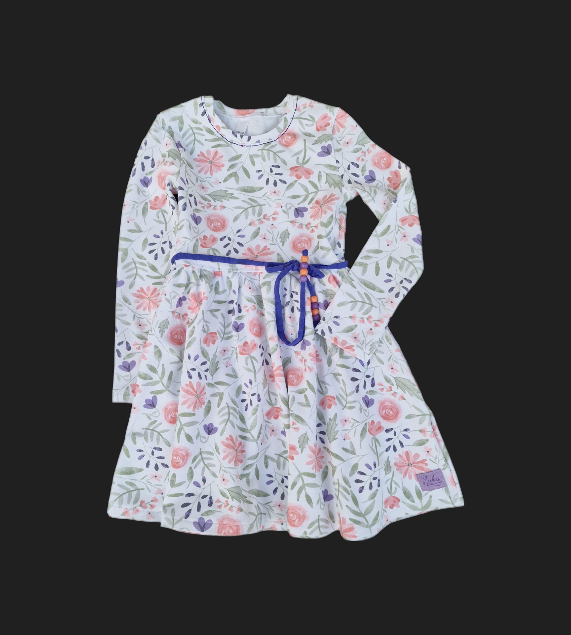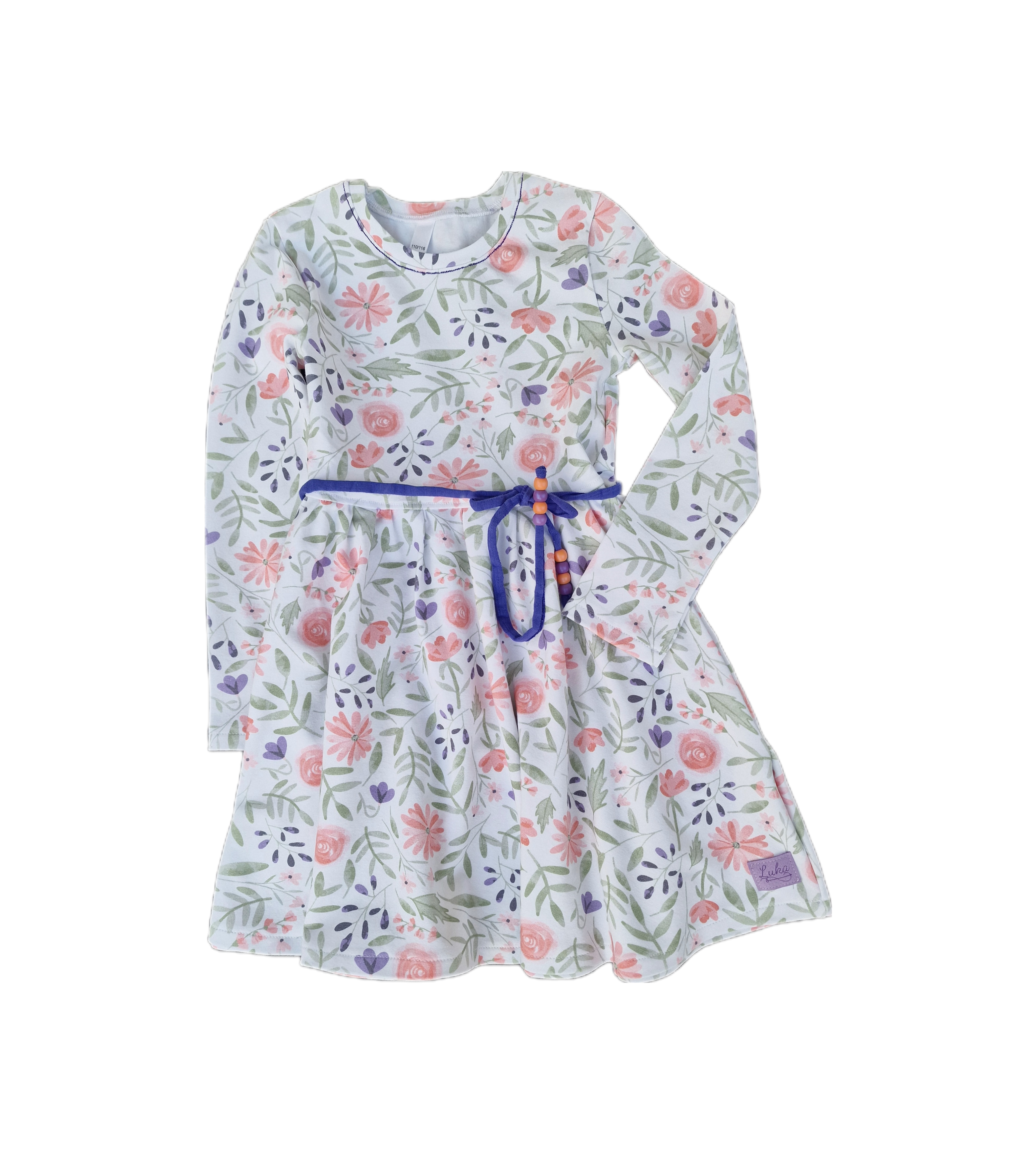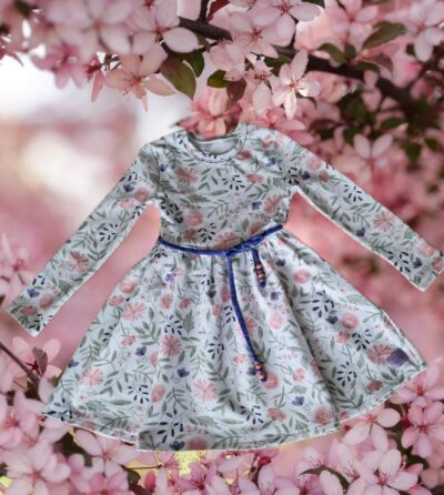 Dekliška obleka iz nežnega bombažnega pletiva ima dolge rokave, krilo, ki se zavrti v vrtavko in perlice na vrvici.