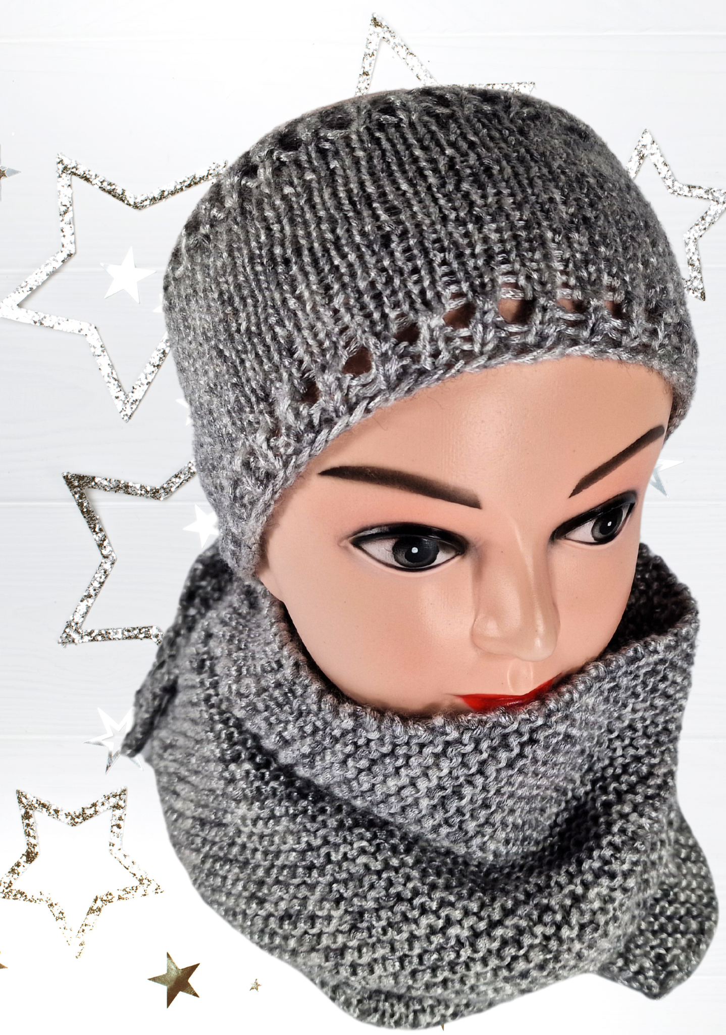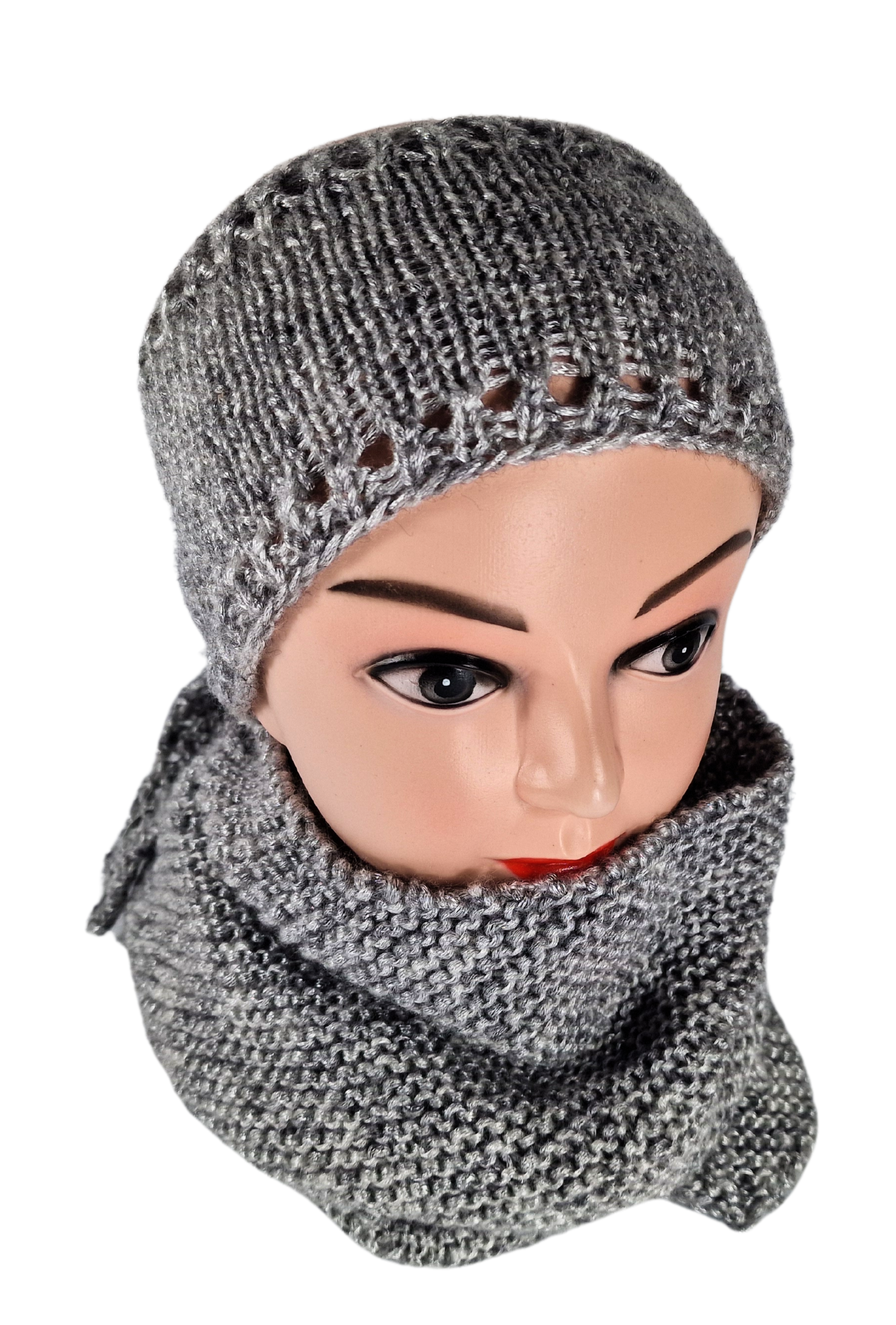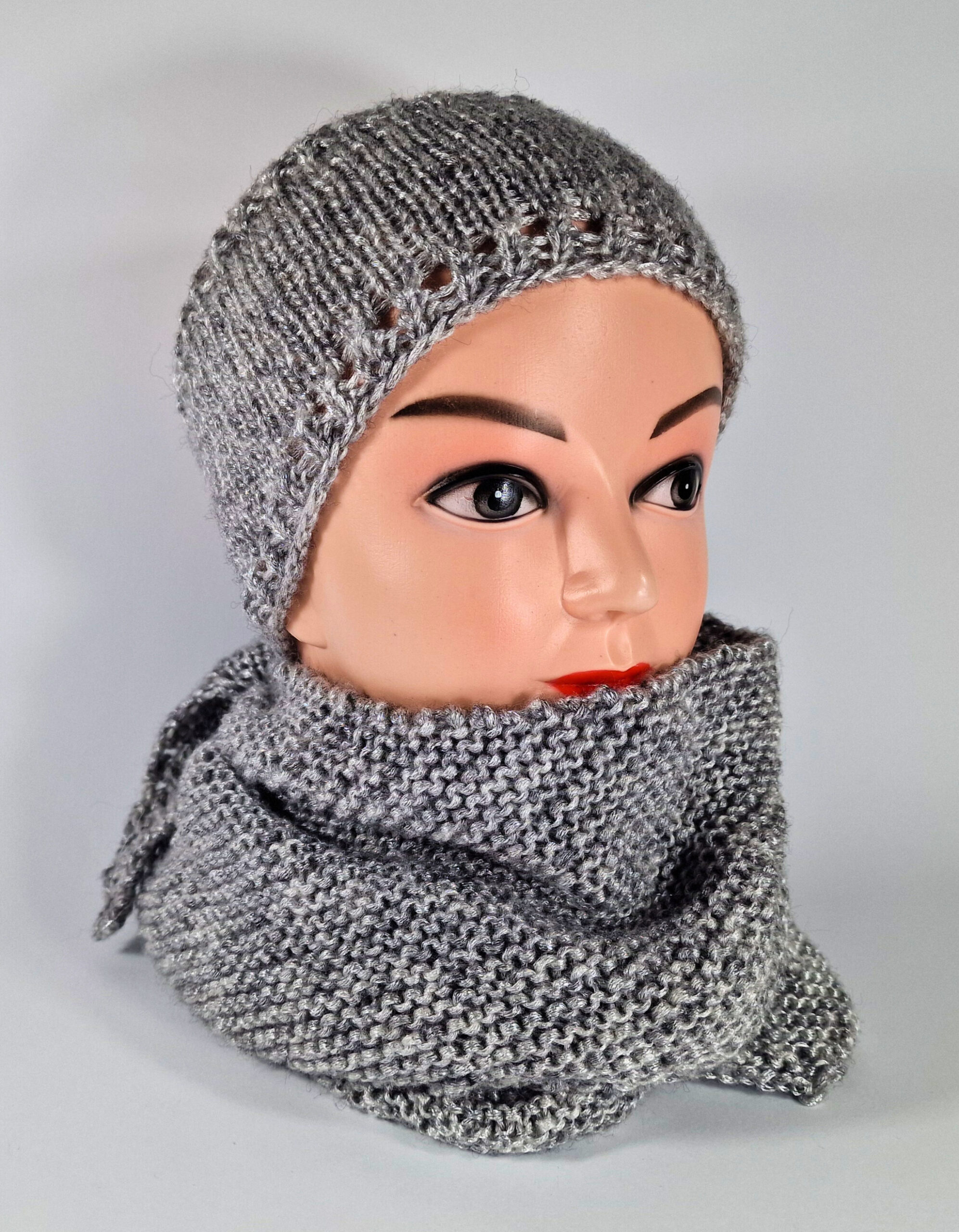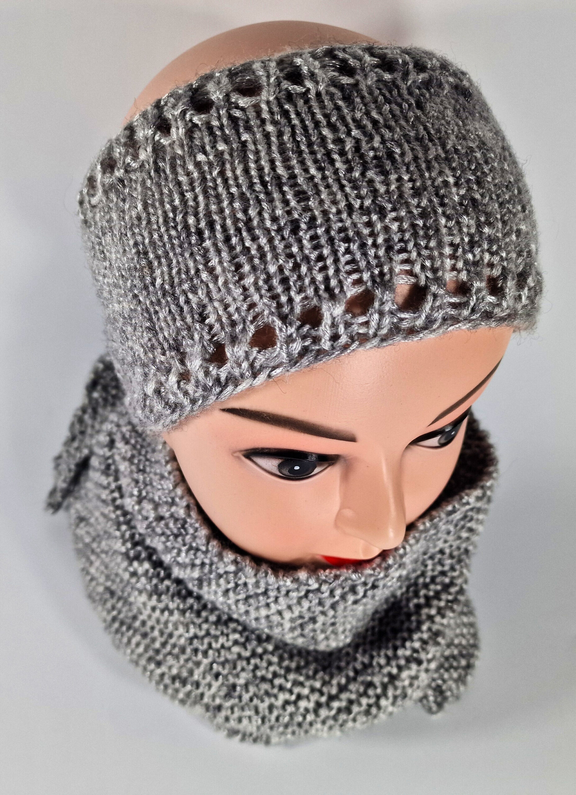 Kompletek je spleten iz nežne viskozne preje v srebrni barvi. Je topel in nežen do kože.