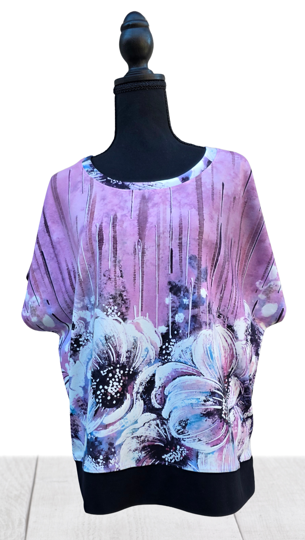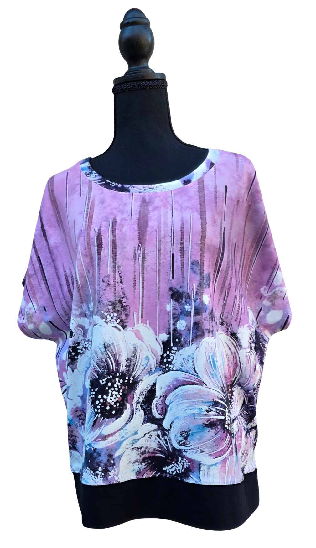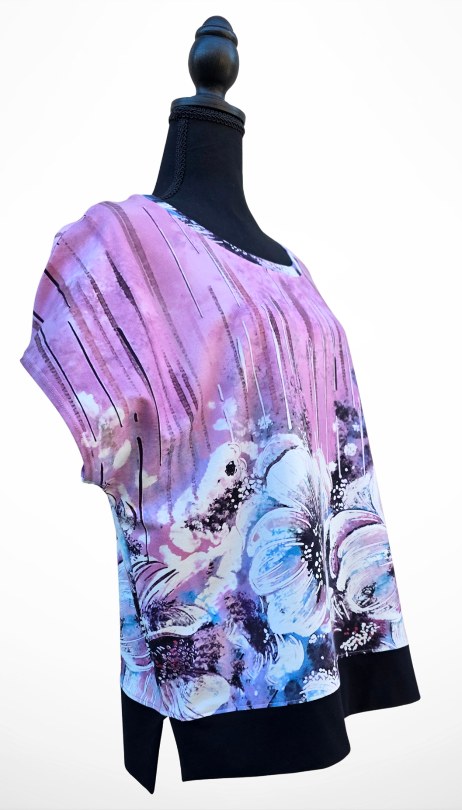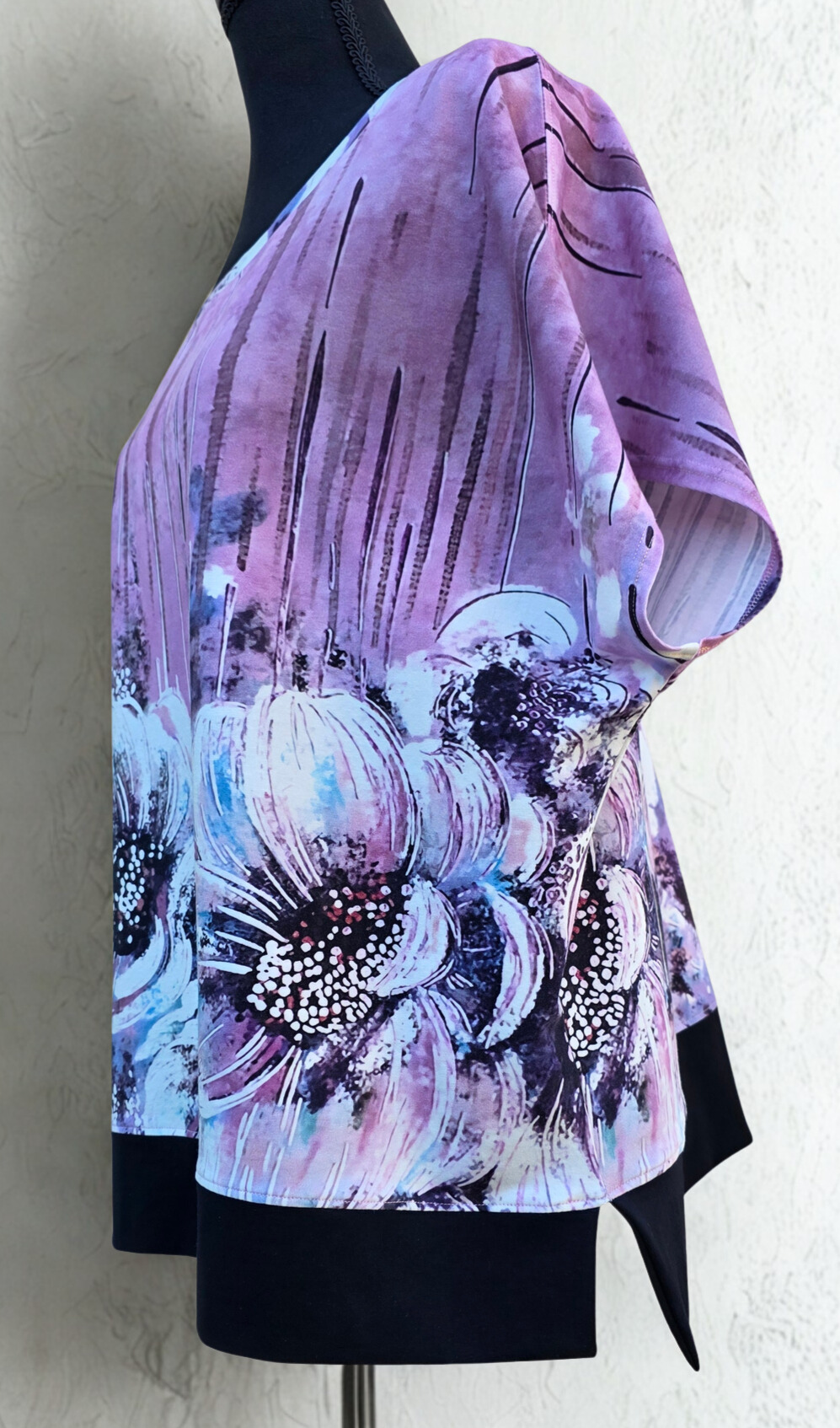 Majčka v čudoviti nežno vijola barvi, ki se na ramah podaljša v kretek rokav. Majica je sešita iz nežnega tankega jerseya v udobnem širokem kroju in zelo lepo stoji. Posebnost ji dajeta spodnja robova v črni barvi, sprednji je krajši od zadnjega, kar lepo poudari postavo.
