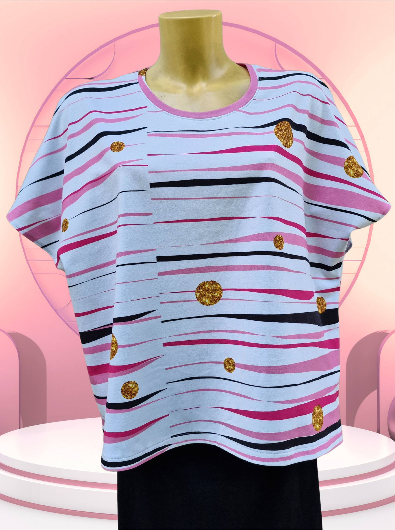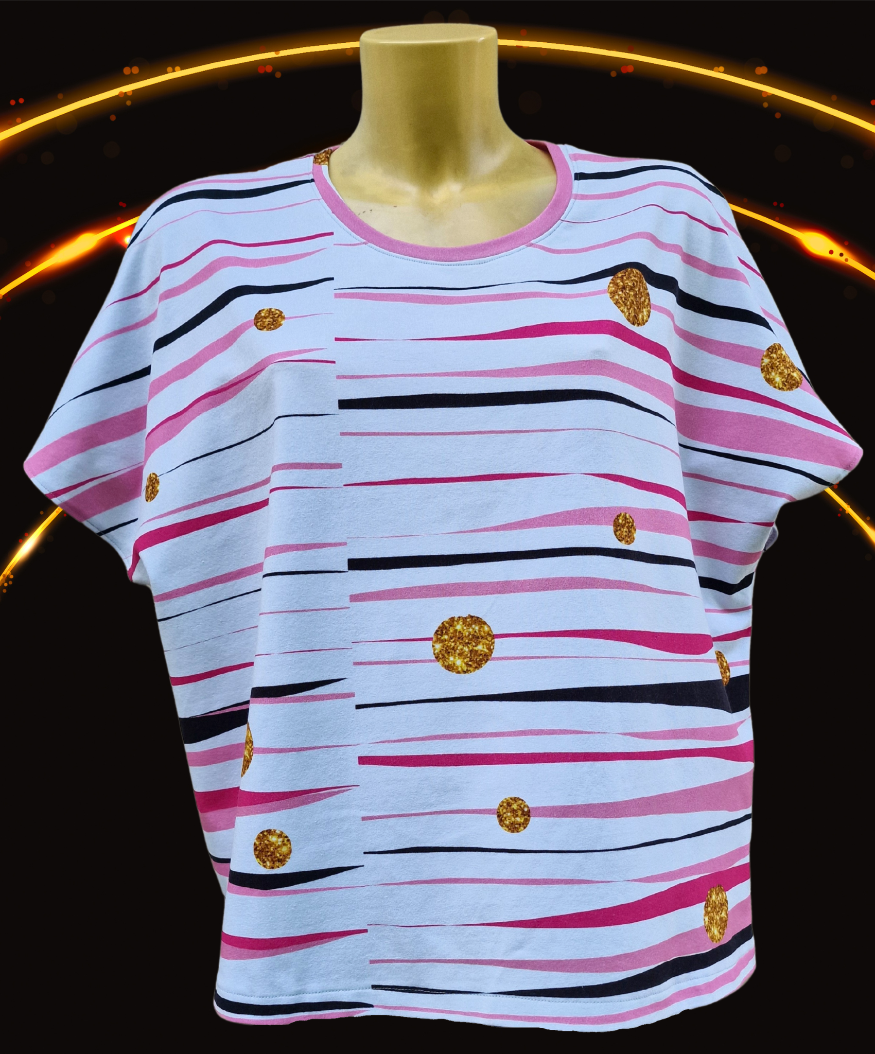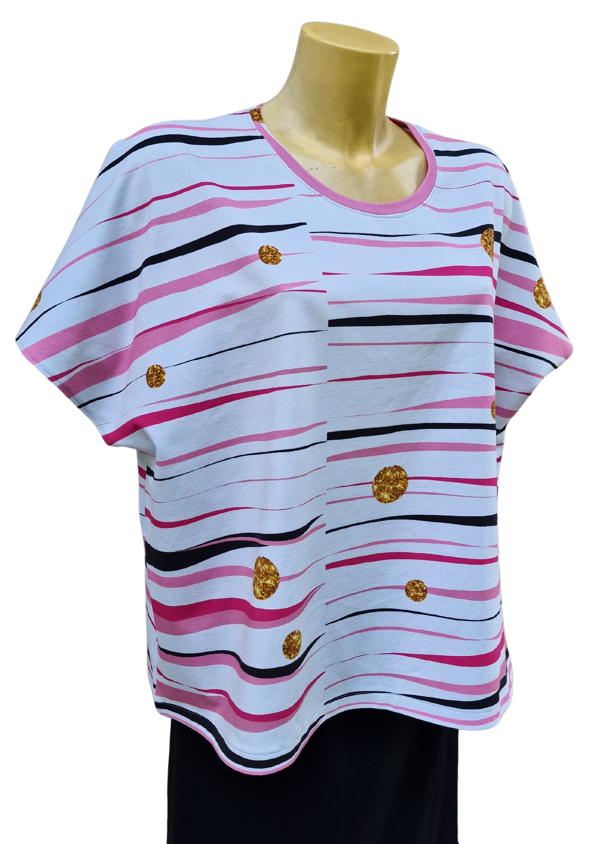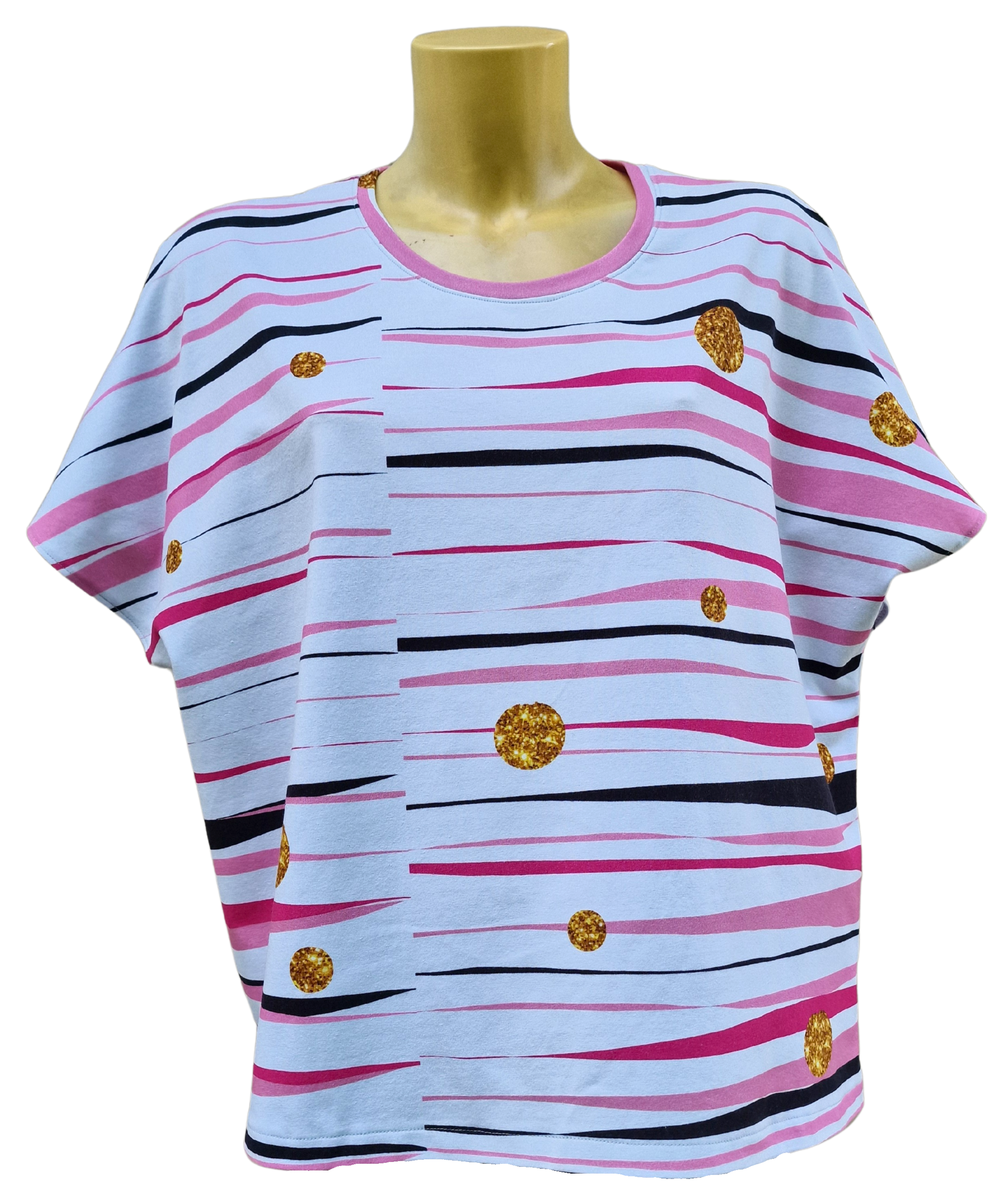 Majčka s kratkimi rokavi, z zanimivim vzorcem črt in zlatih krogov. Majica je sešita iz nežnega tankega jerseya v udobnem širokem kroju in zelo lepo stoji.