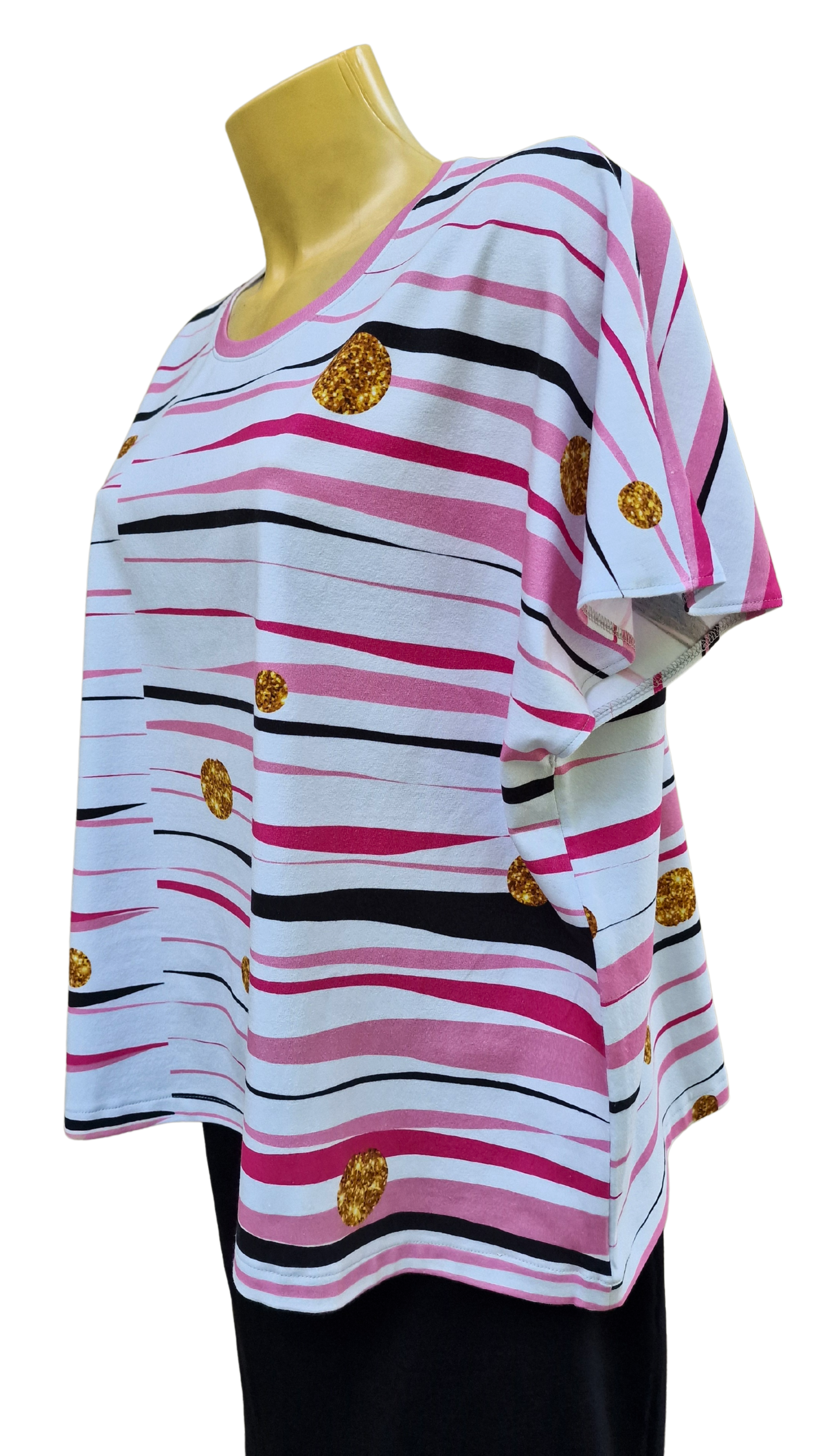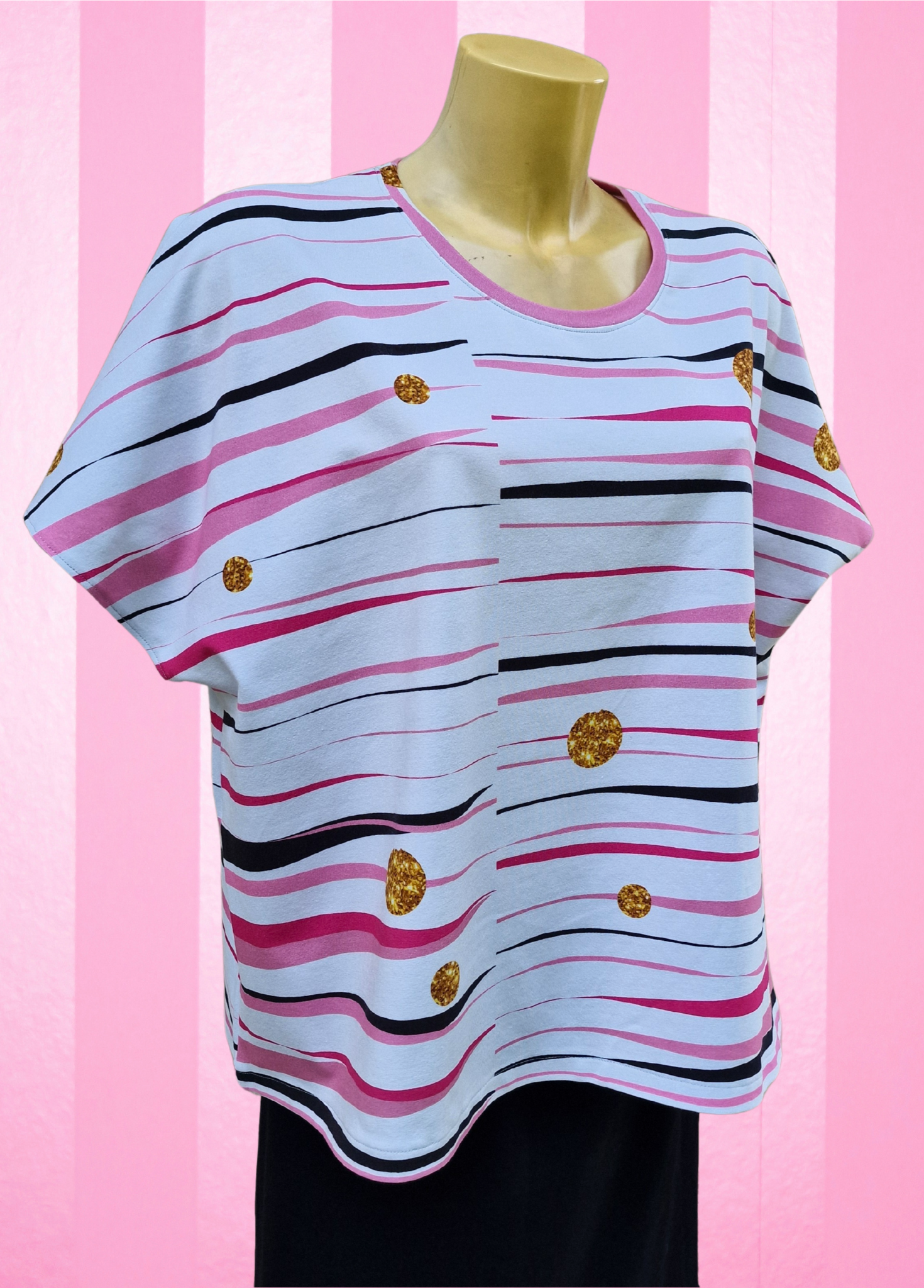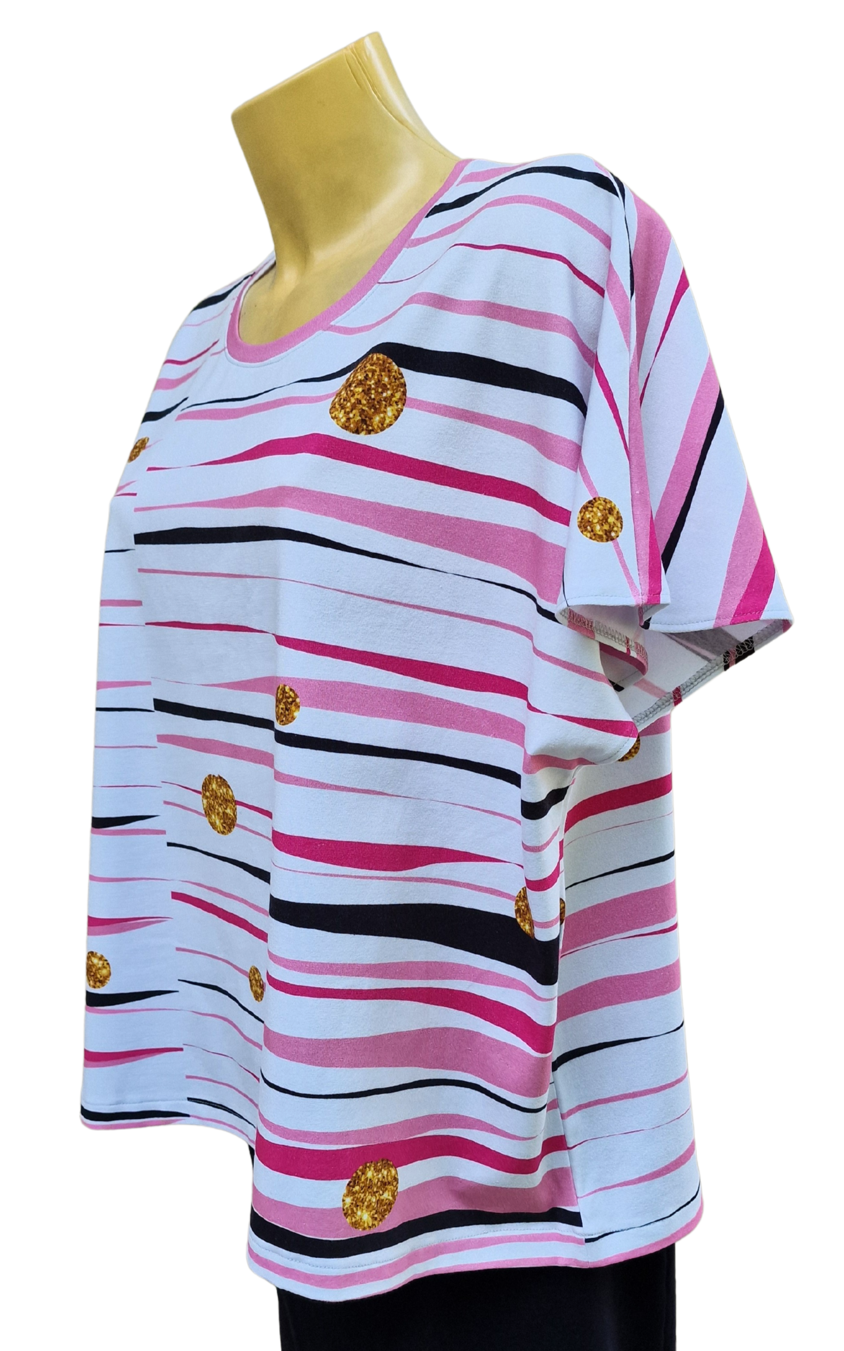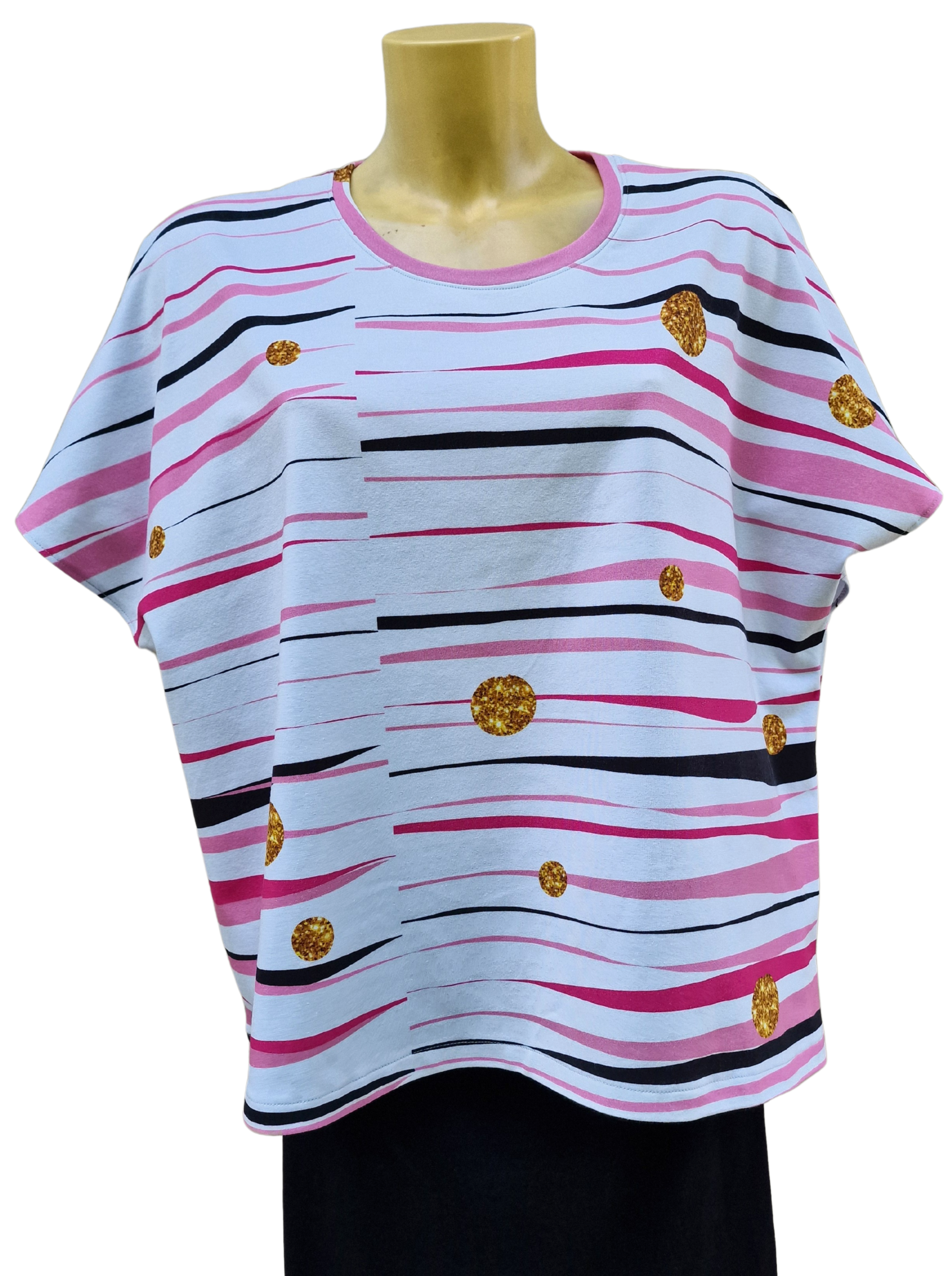 Majčka s kratkimi rokavi, z zanimivim vzorcem črt in zlatih krogov. Majica je sešita iz nežnega tankega jerseya v udobnem širokem kroju in zelo lepo stoji.