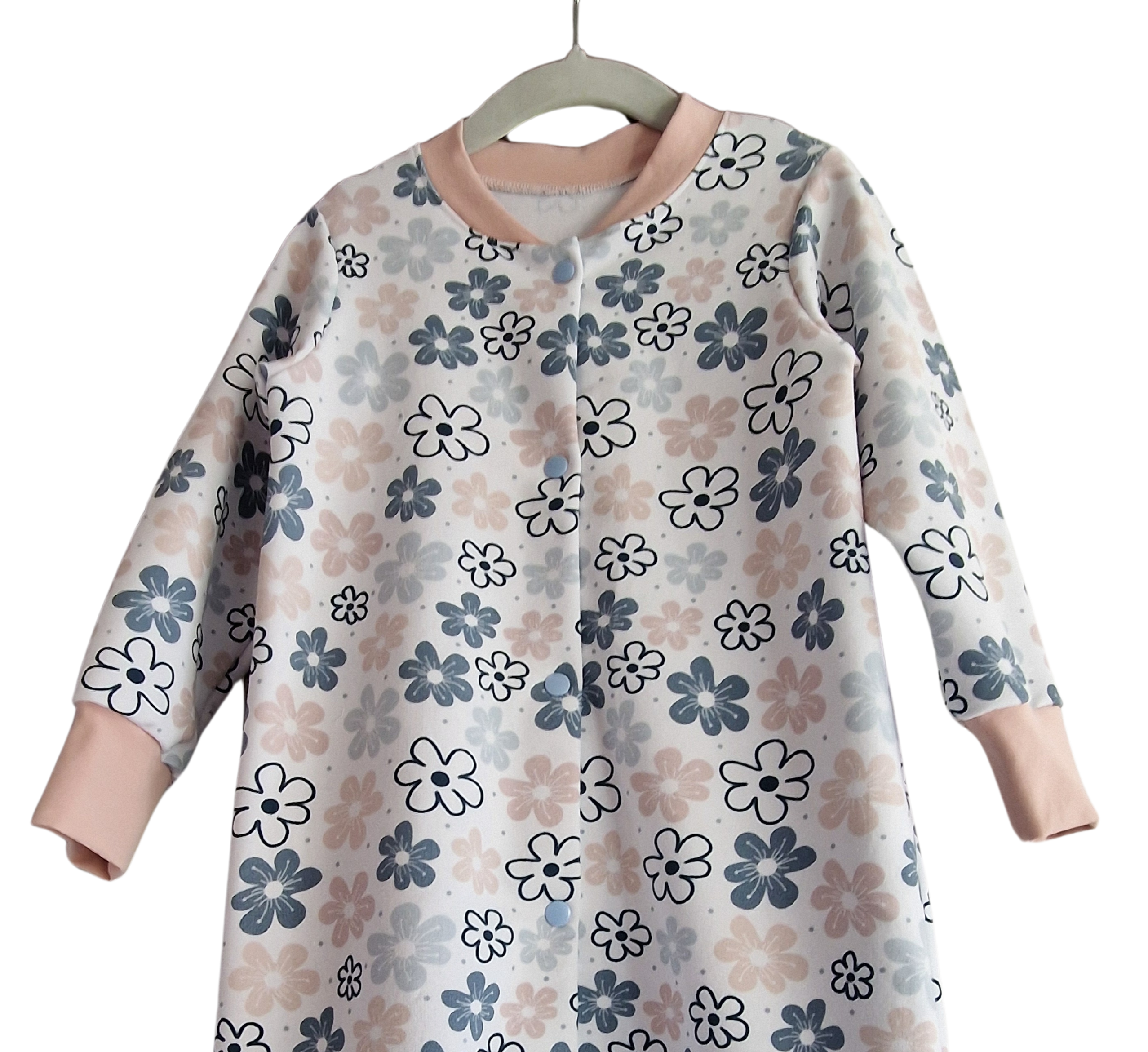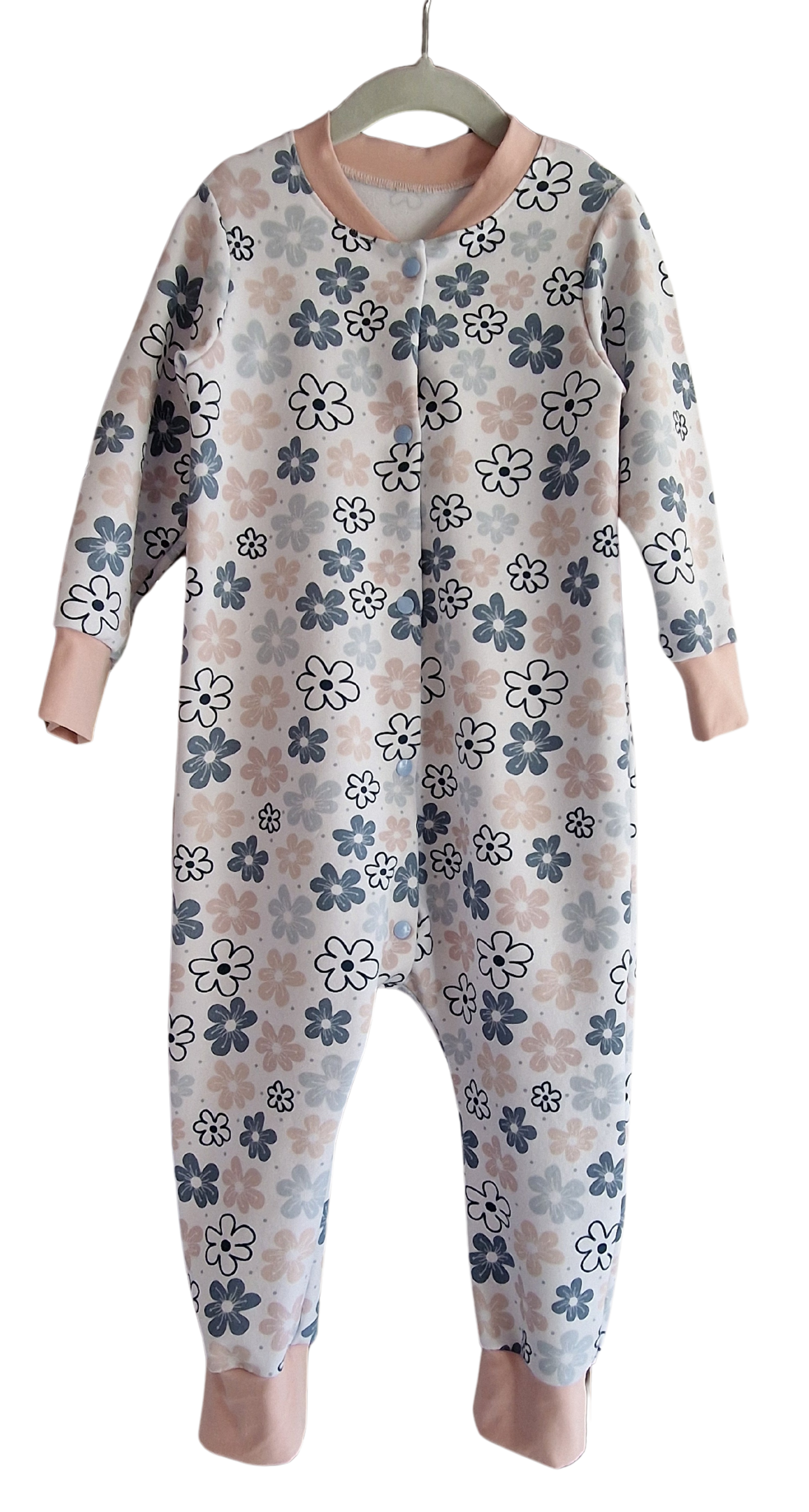 Pižama / pajacek je sešita iz bombažnega mehkega in udobnega jerseya. Pajacek se zapira s pritiskači.