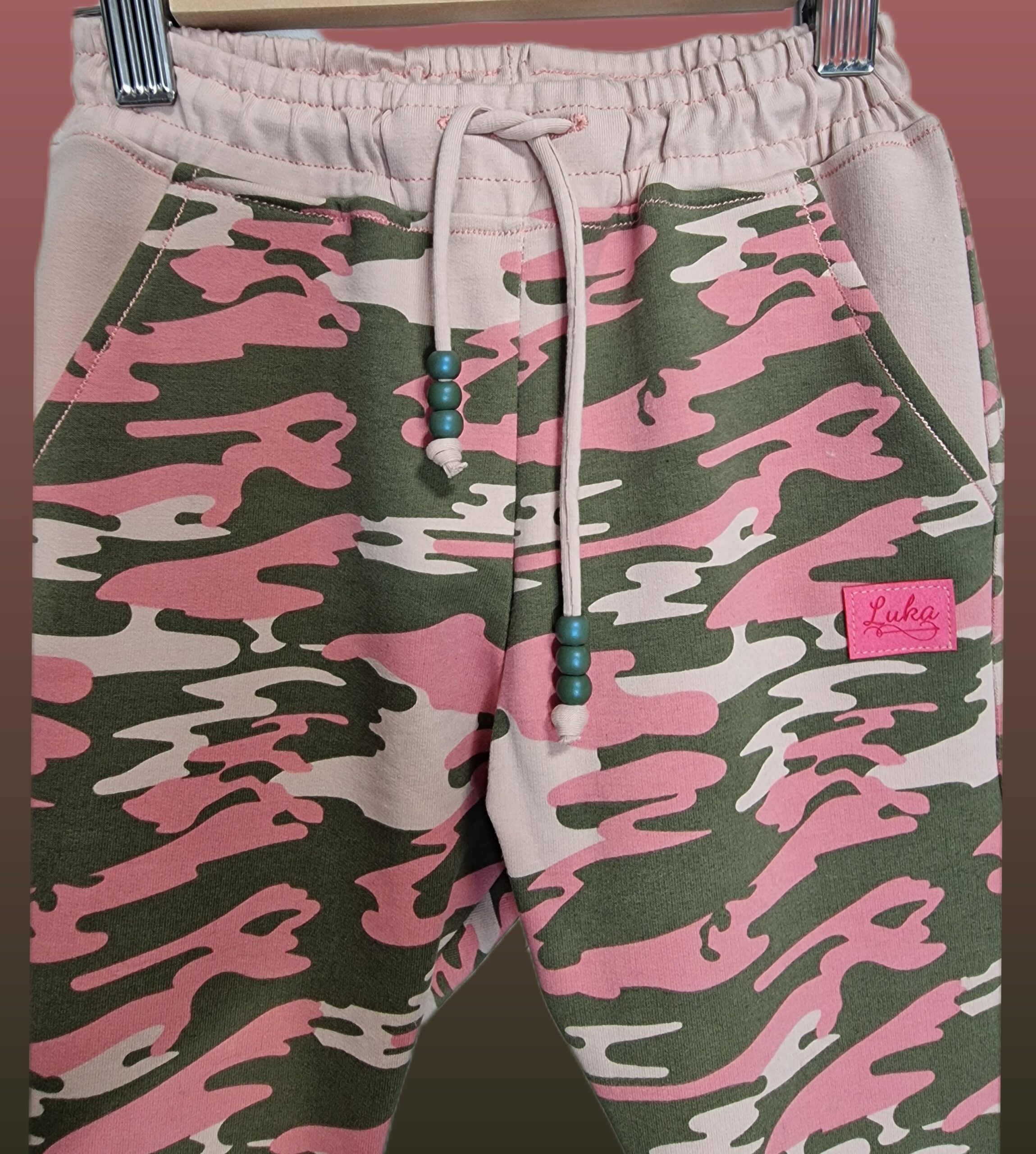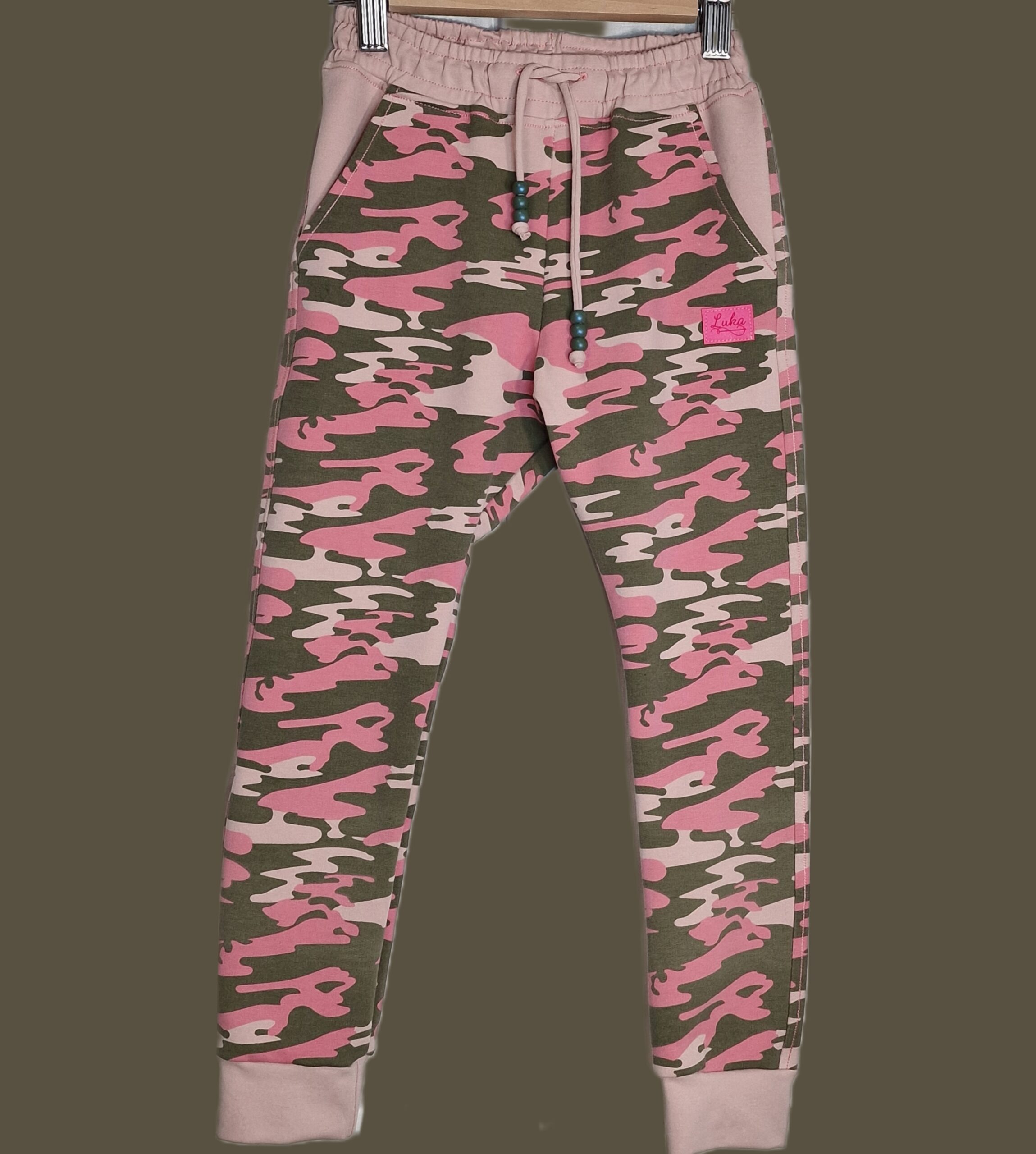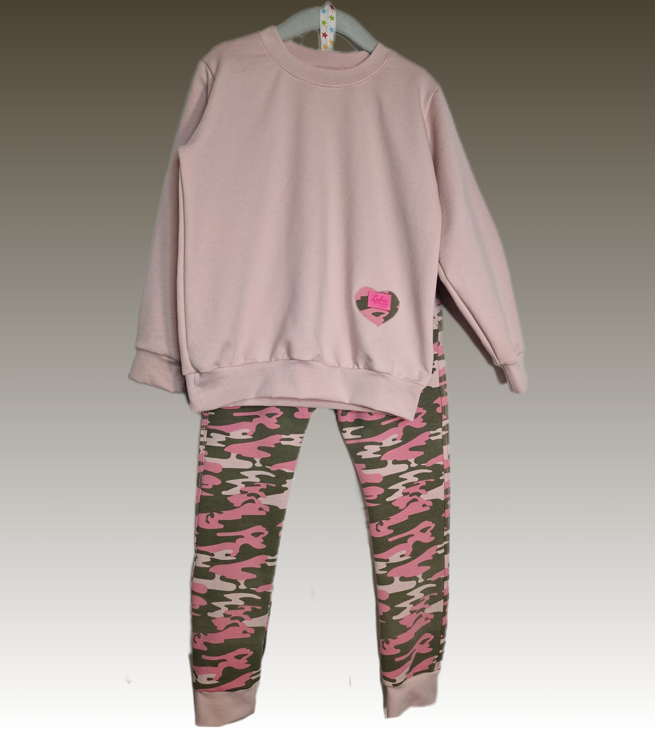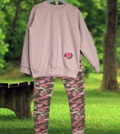 Trnirka je sešita iz lepega in udobnega materiala v kombinaciji roza barve in kamuflažnega roza vzorca. Na majčki se ponovi kamuflažni vzorec v našiti aplikaciji srčka. Hlače imajo dva žepa in funkcionalno vrvico v pasu.