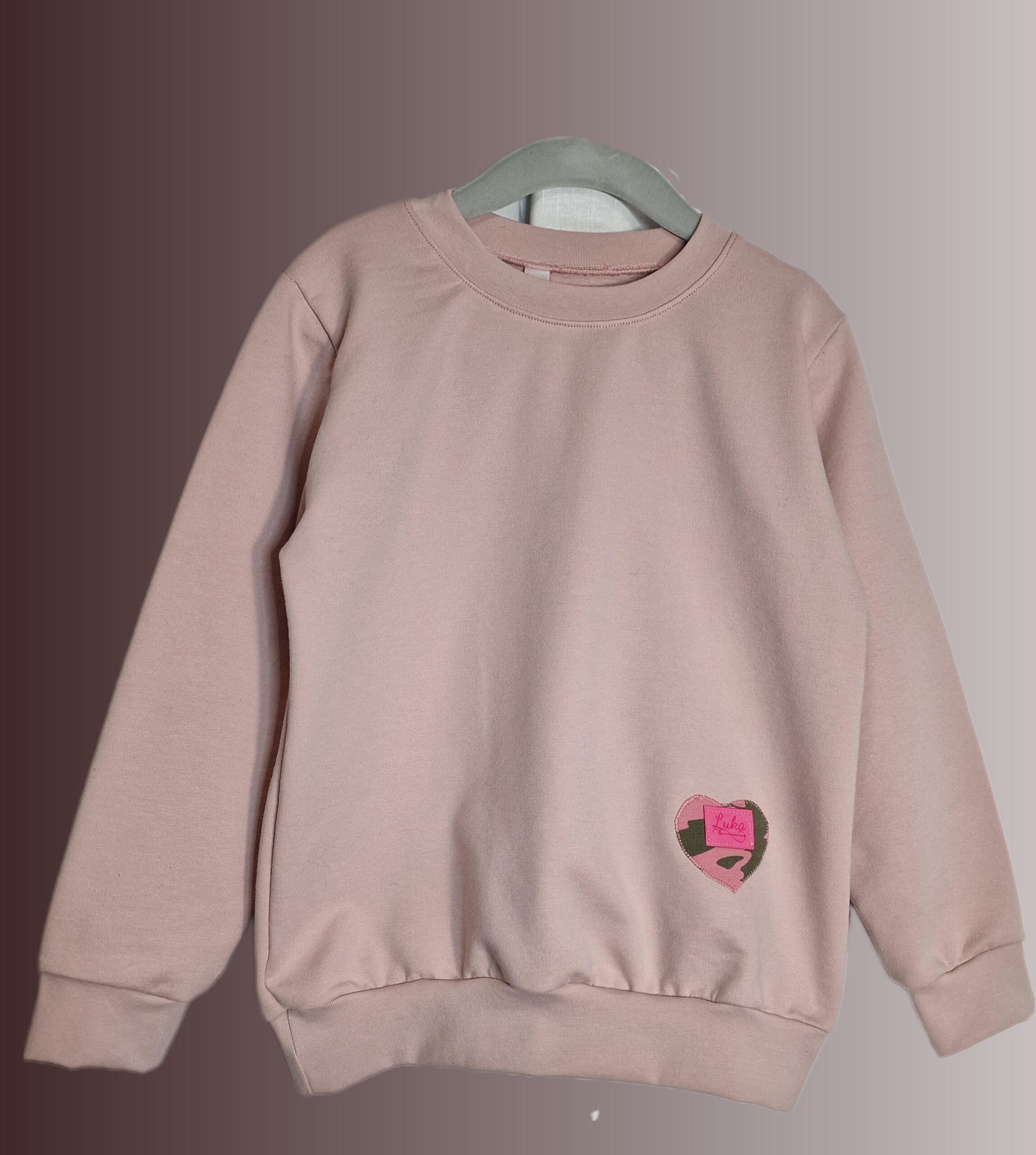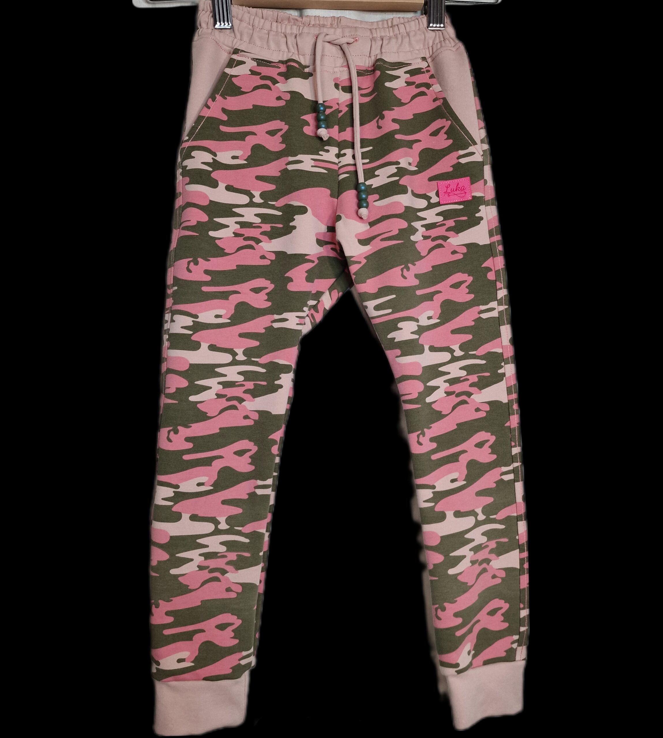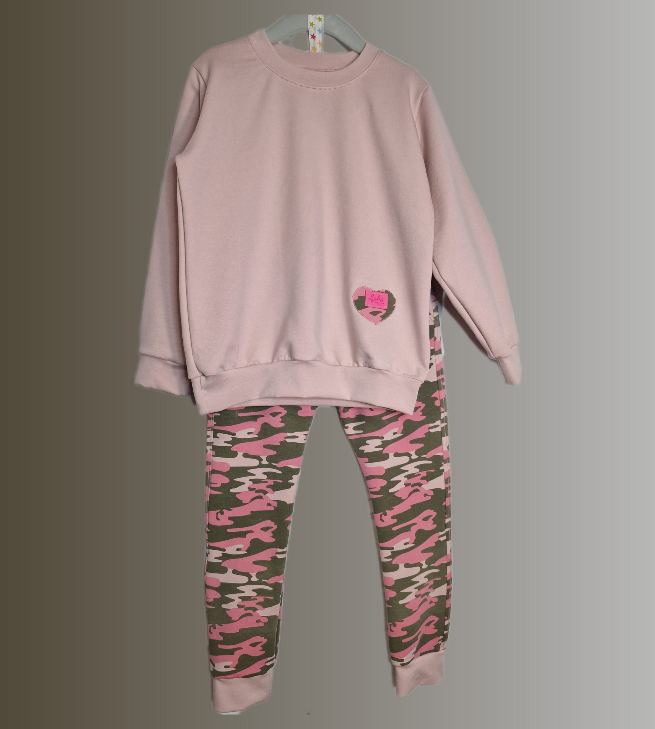 Trnirka je sešita iz lepega in udobnega materiala v kombinaciji roza barve in kamuflažnega roza vzorca. Na majčki se ponovi kamuflažni vzorec v našiti aplikaciji srčka. Hlače imajo dva žepa in funkcionalno vrvico v pasu.