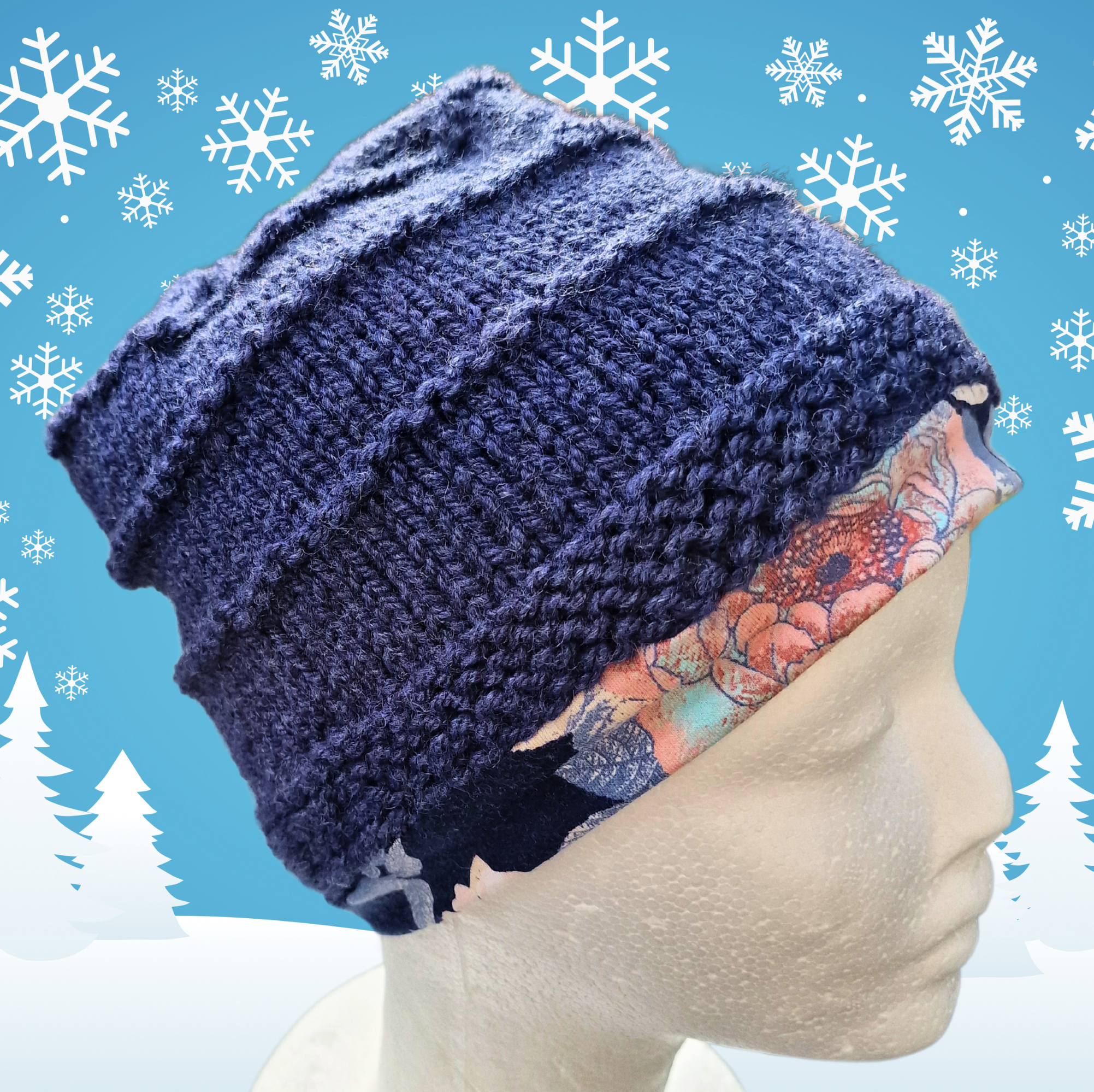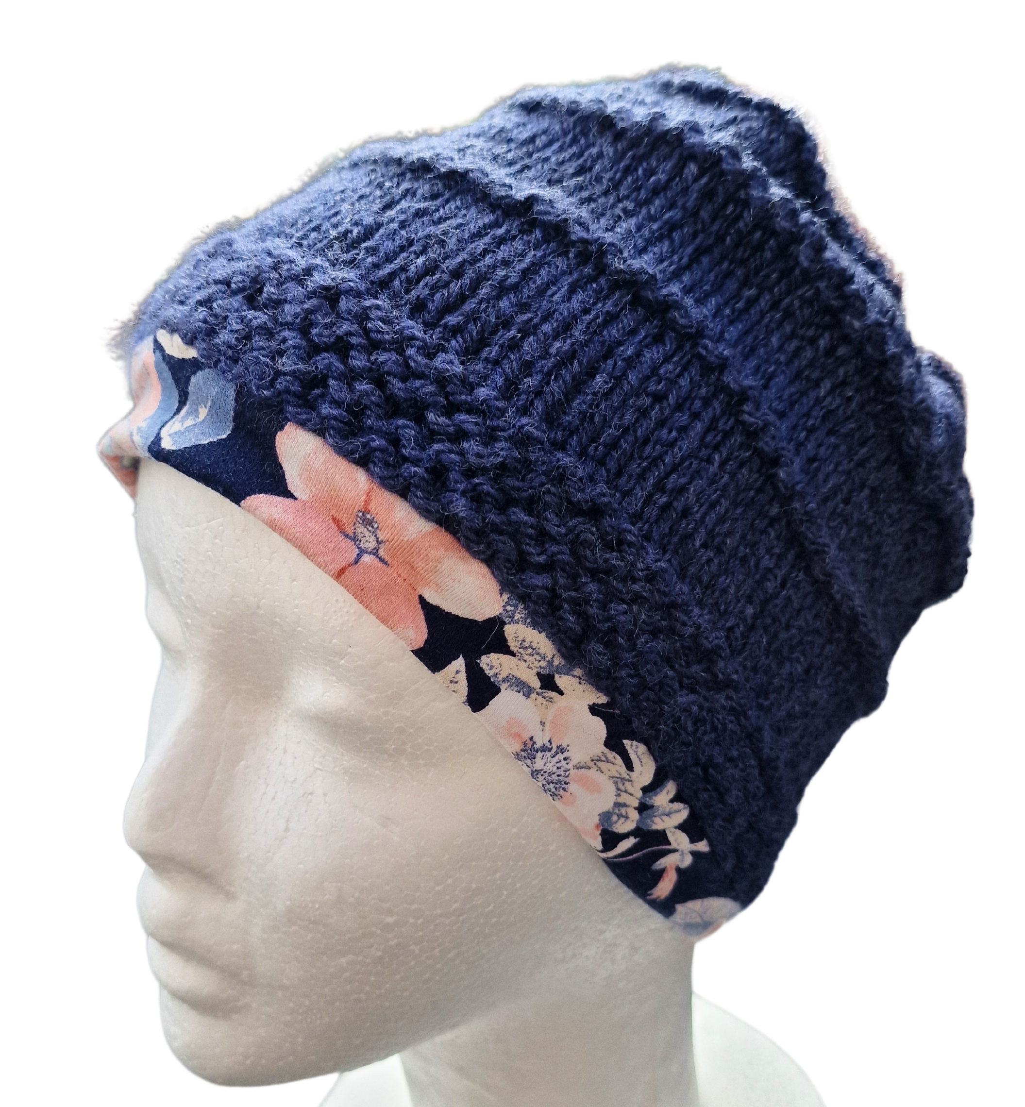 Kapa je spletena iz akrilne preje v modri barvi. Kapa je podložena.