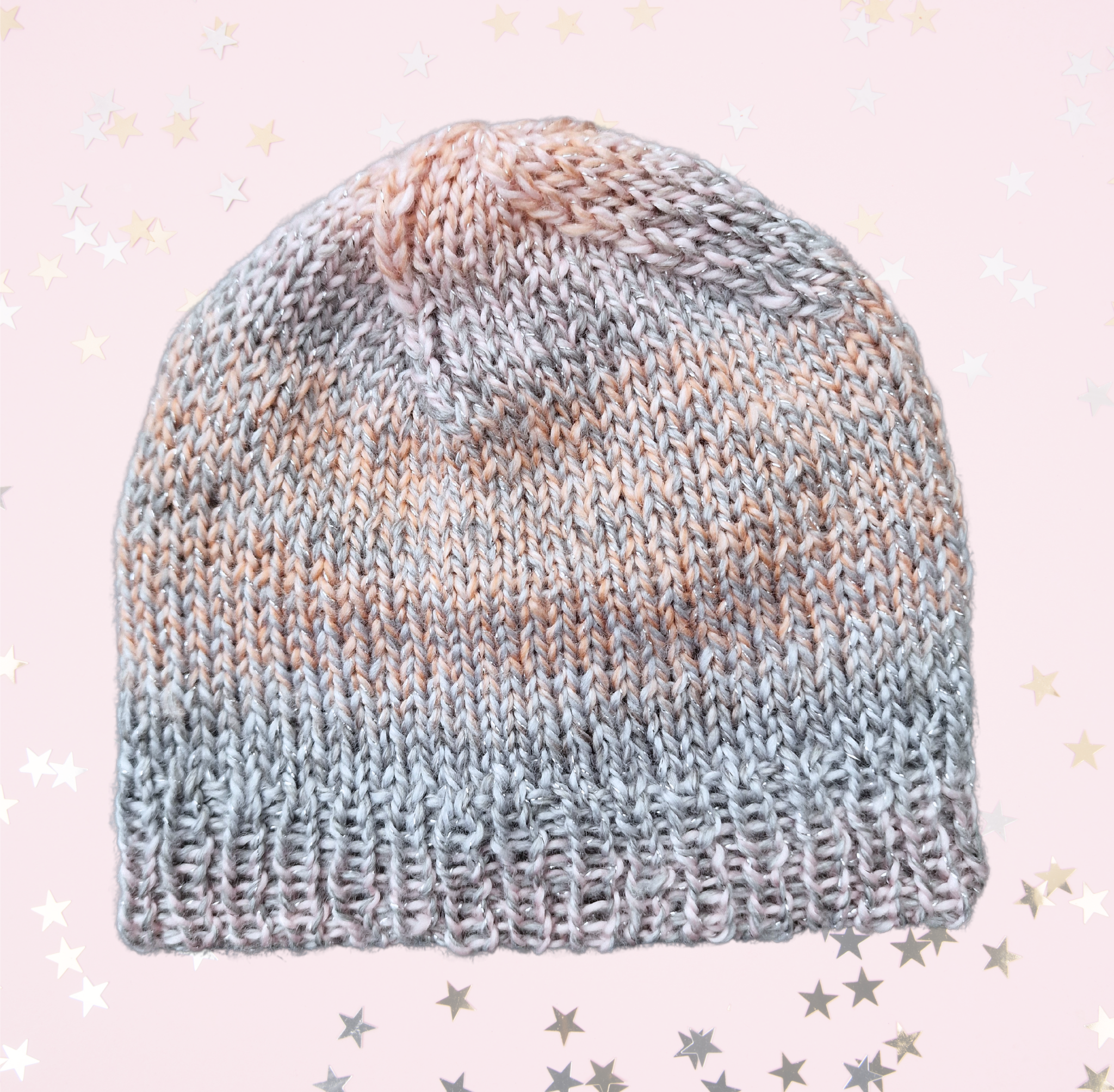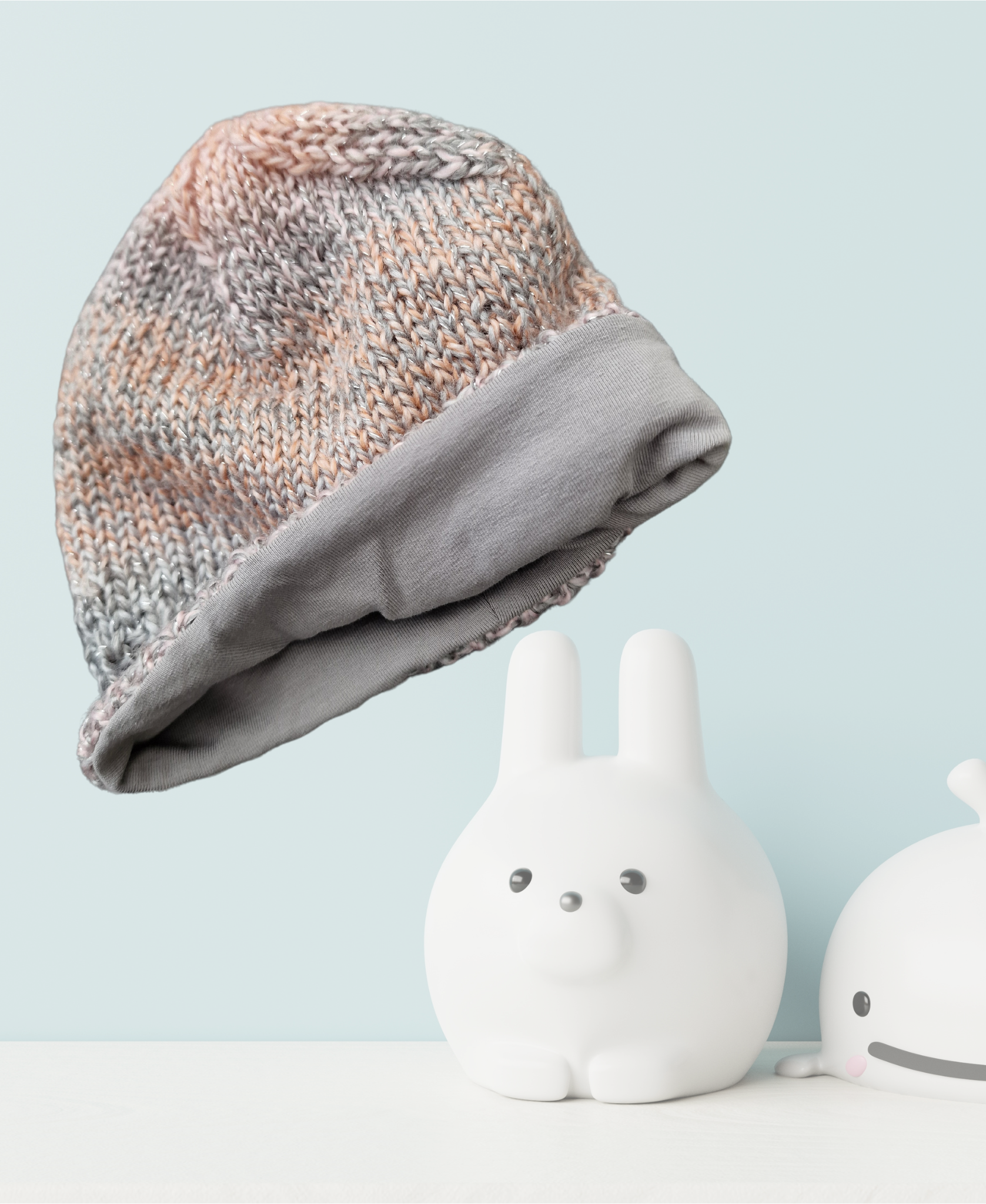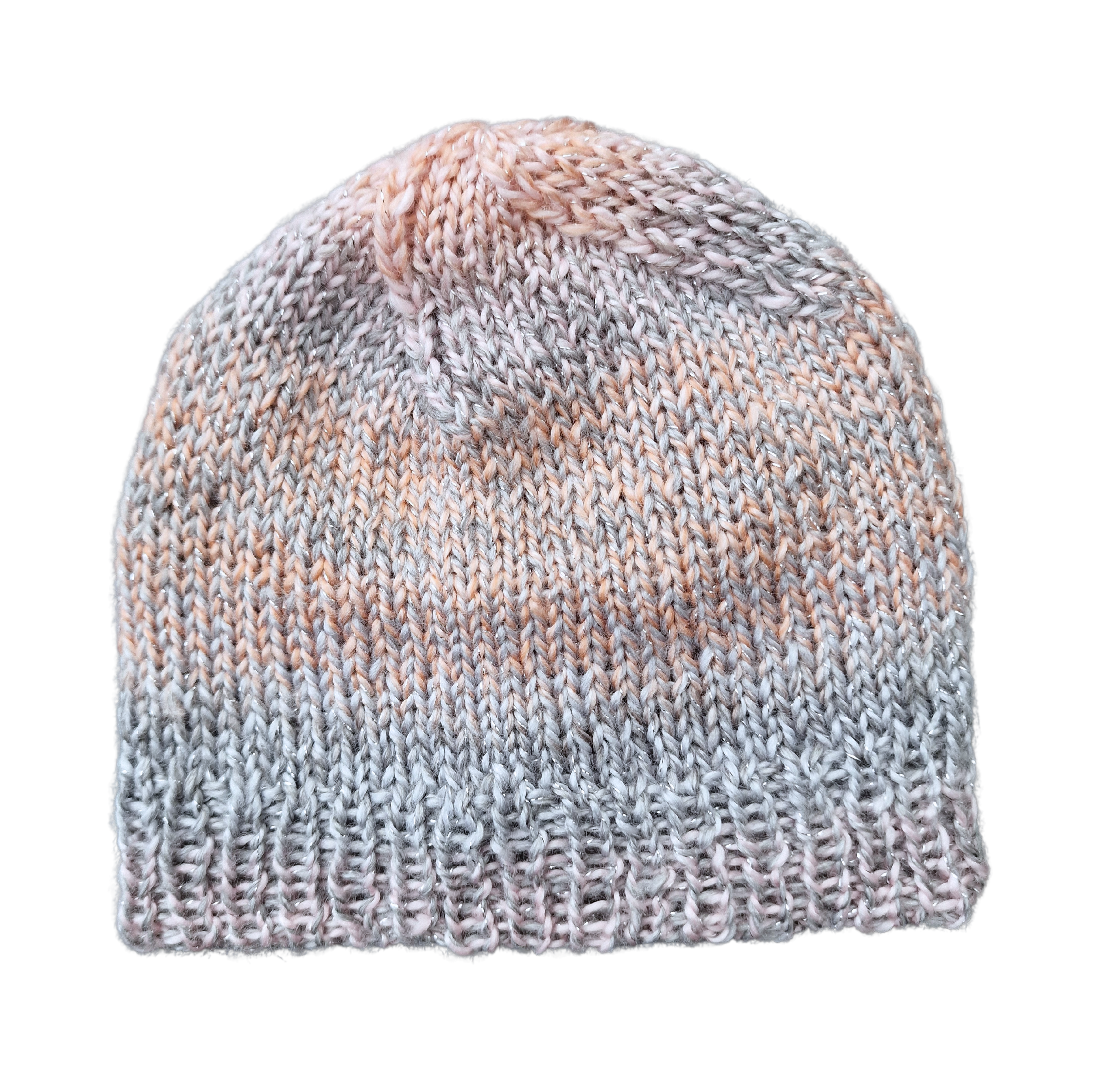Kapa je spletena iz nežne akrilne preje, ki se preliva v roza in sivih odtenkih, dodan ima lureks. Kapa je podložena.