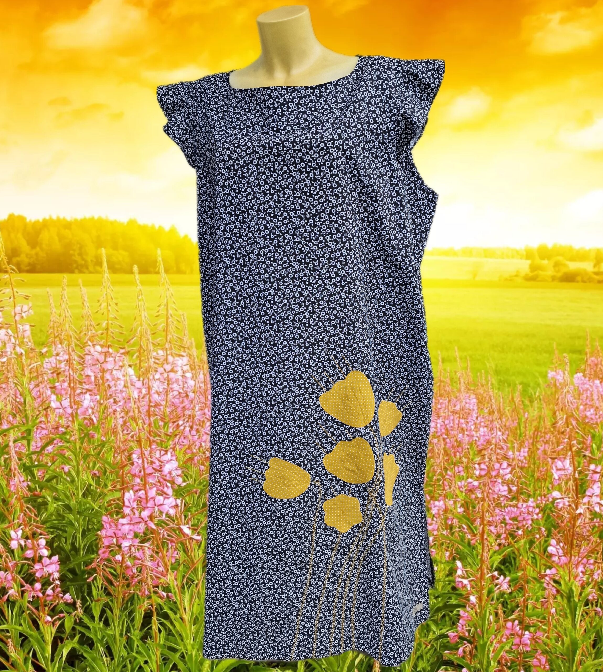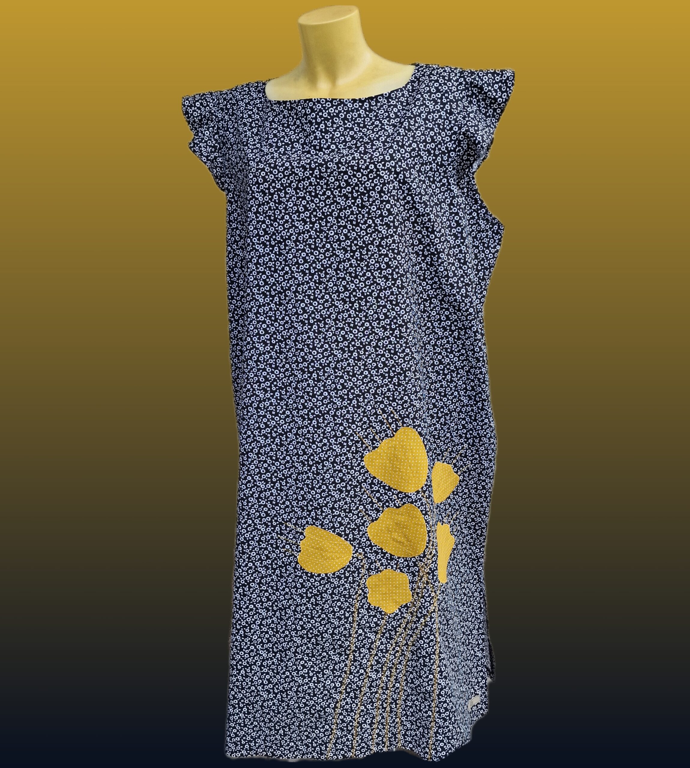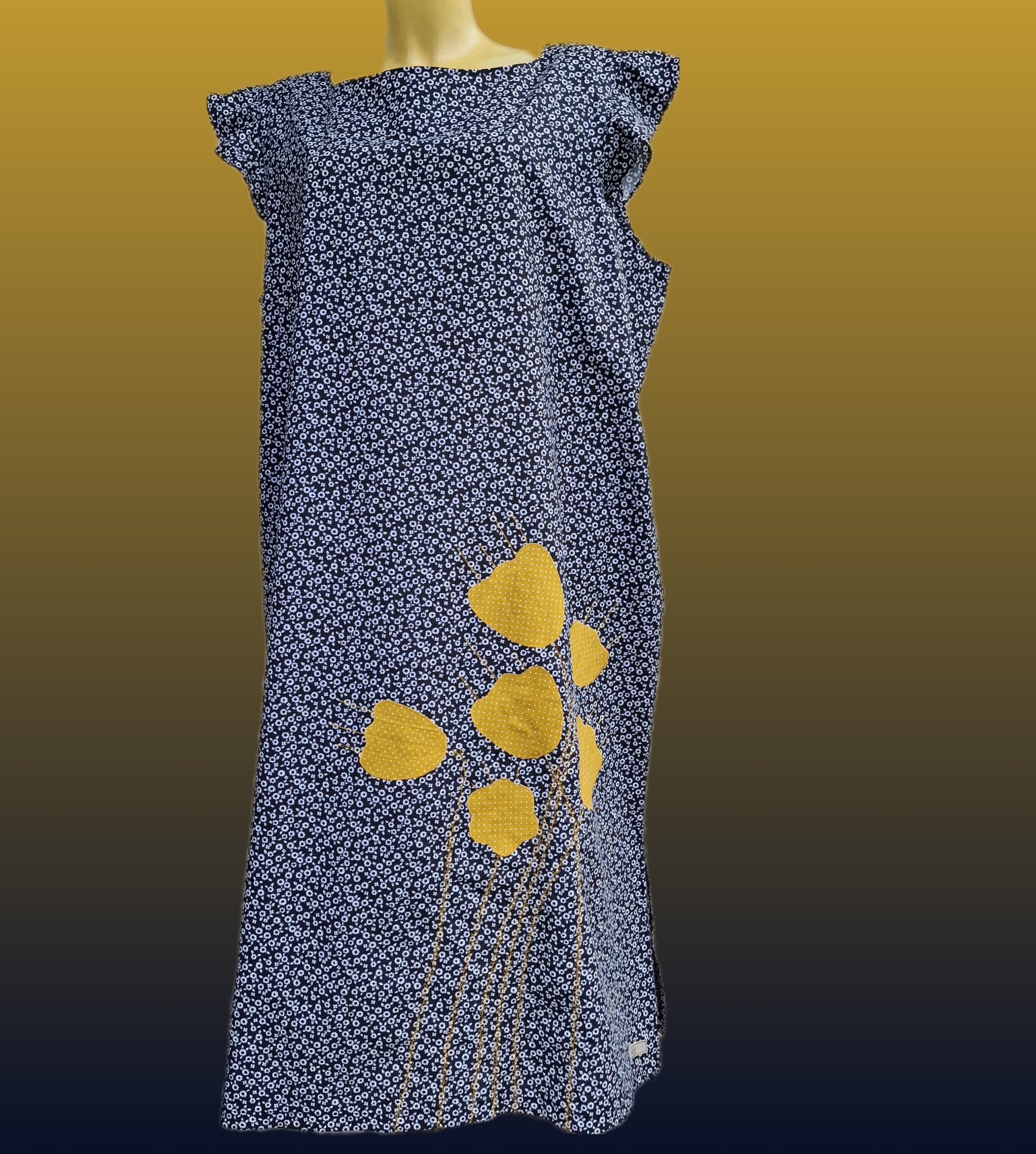 Poletna obleka z ročno našito aplikacijo v obliki rumenih cvetov. Odlična izbira za vroče poletne dni, saj je sešita iz bombažnega poplina v udobnem širokem kroju, ki – mimogrede – skrije tudi kakšno oblino.