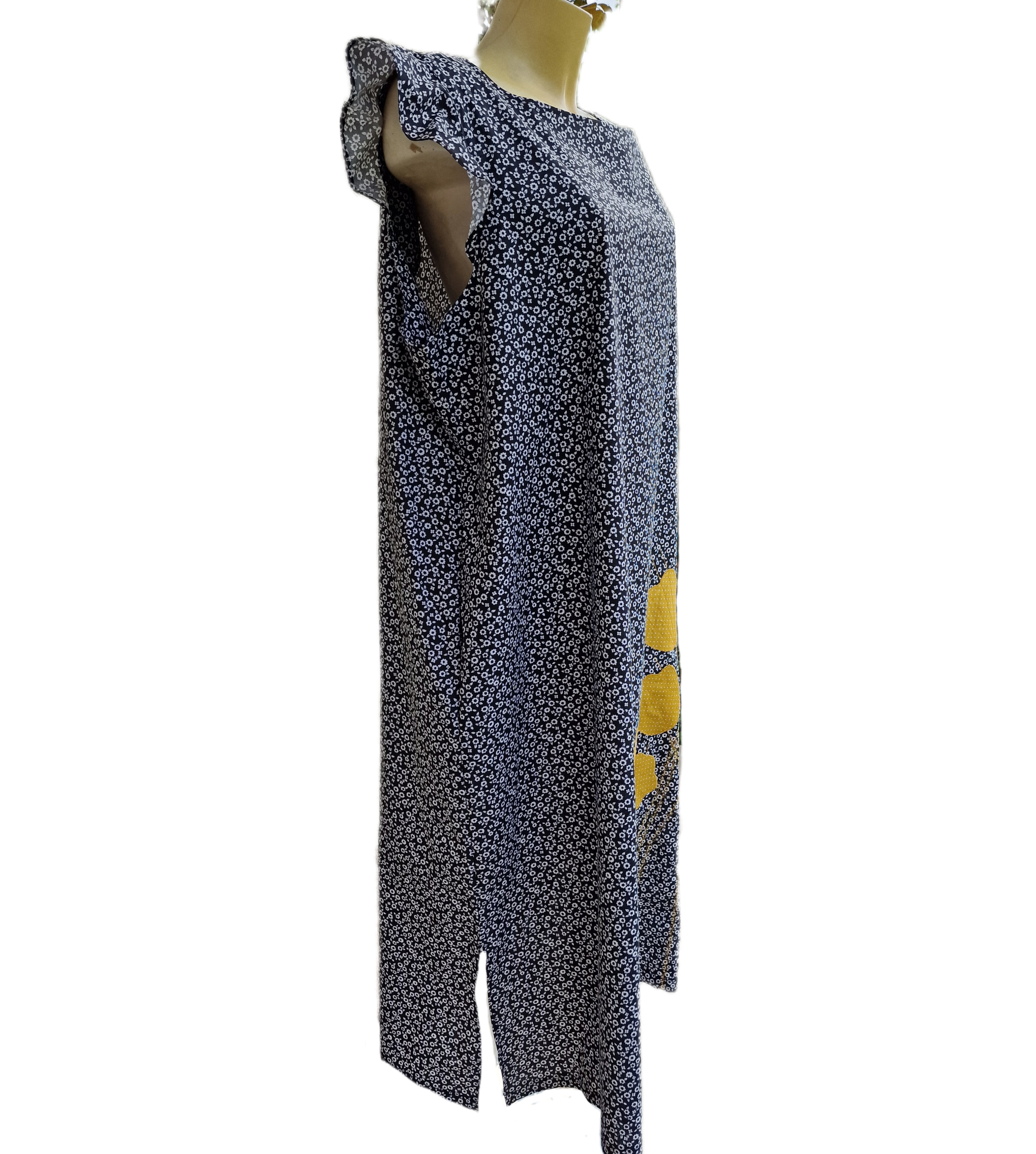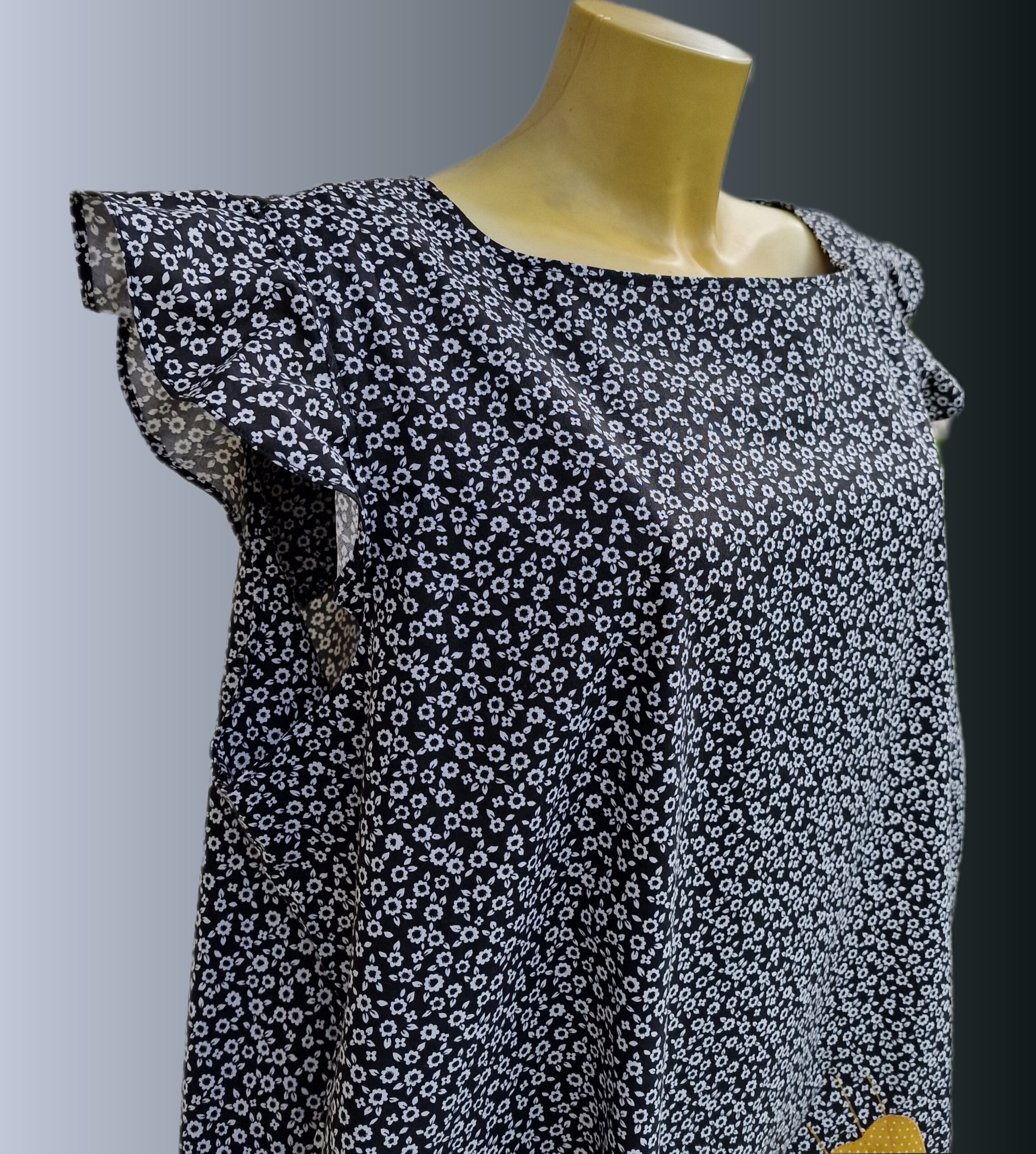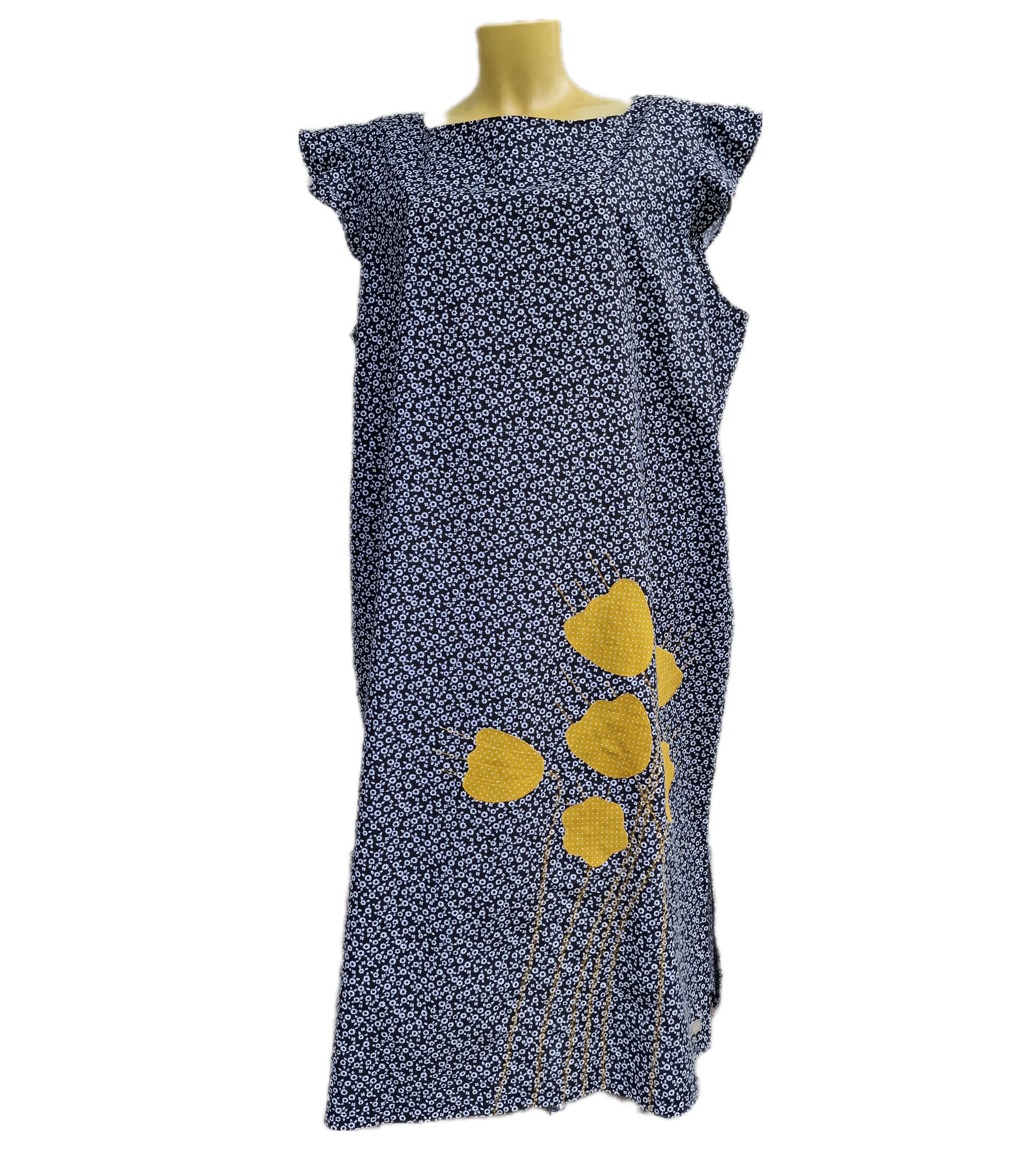 Poletna obleka z ročno našito aplikacijo v obliki rumenih cvetov. Odlična izbira za vroče poletne dni, saj je sešita iz bombažnega poplina v udobnem širokem kroju, ki – mimogrede – skrije tudi kakšno oblino.