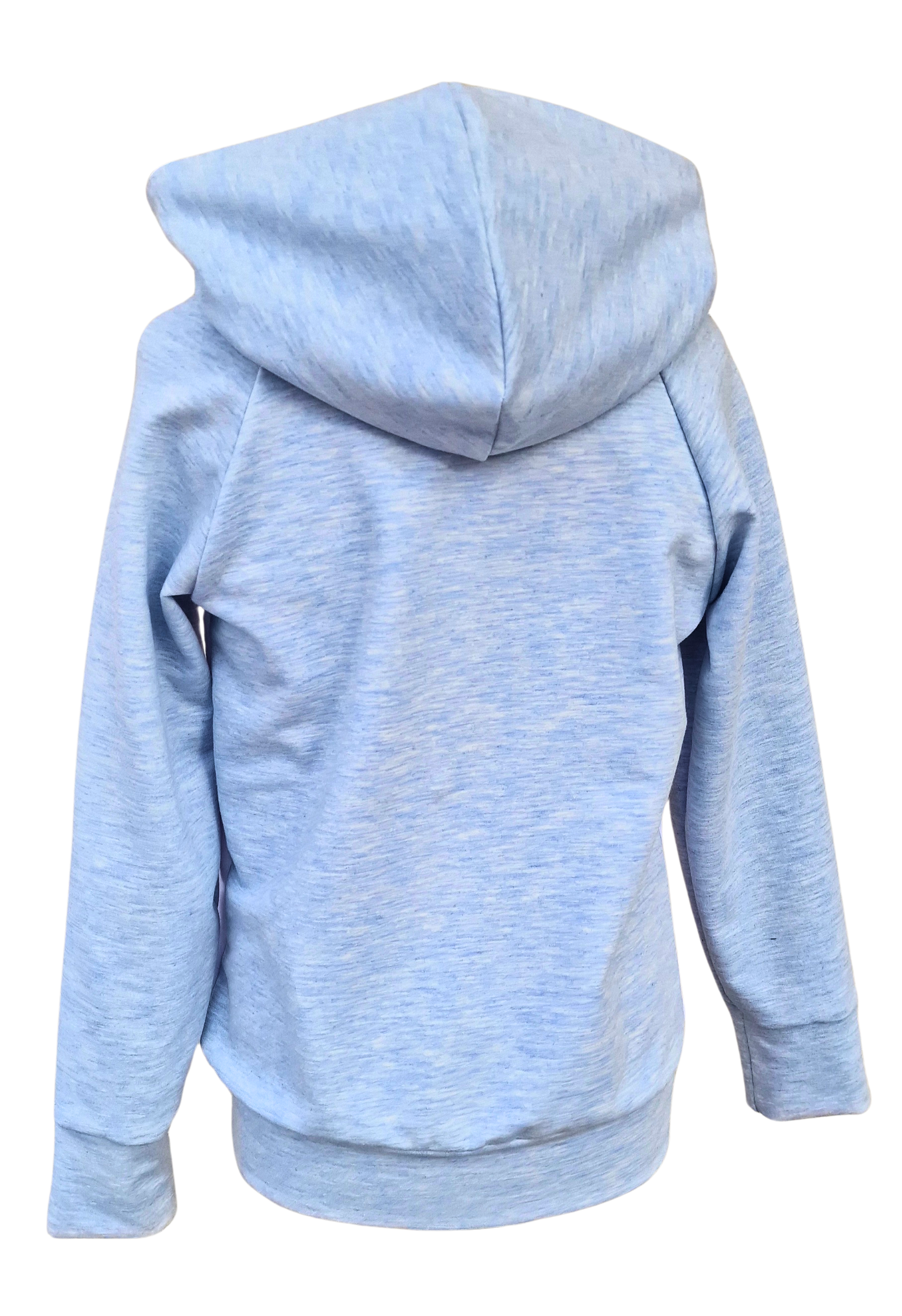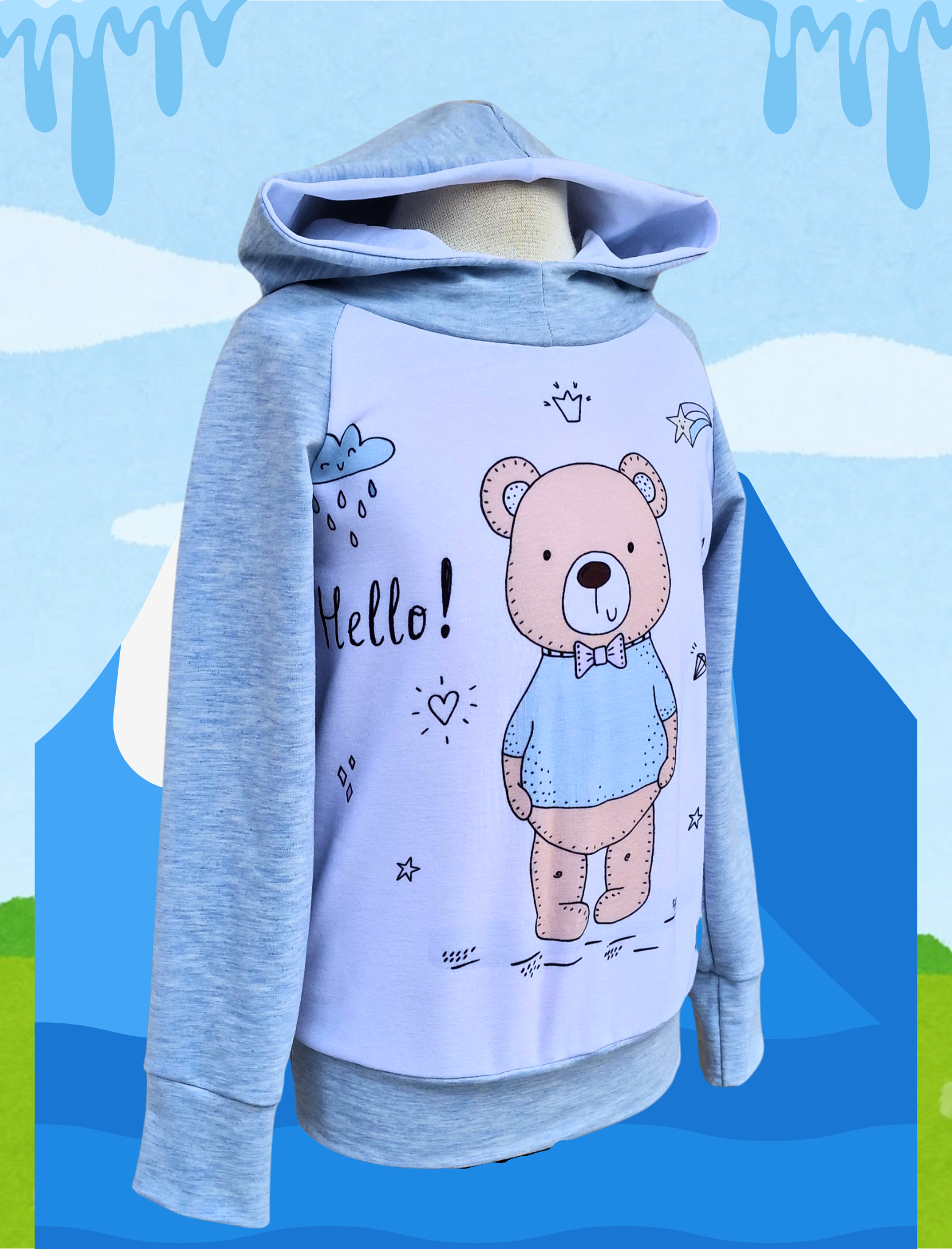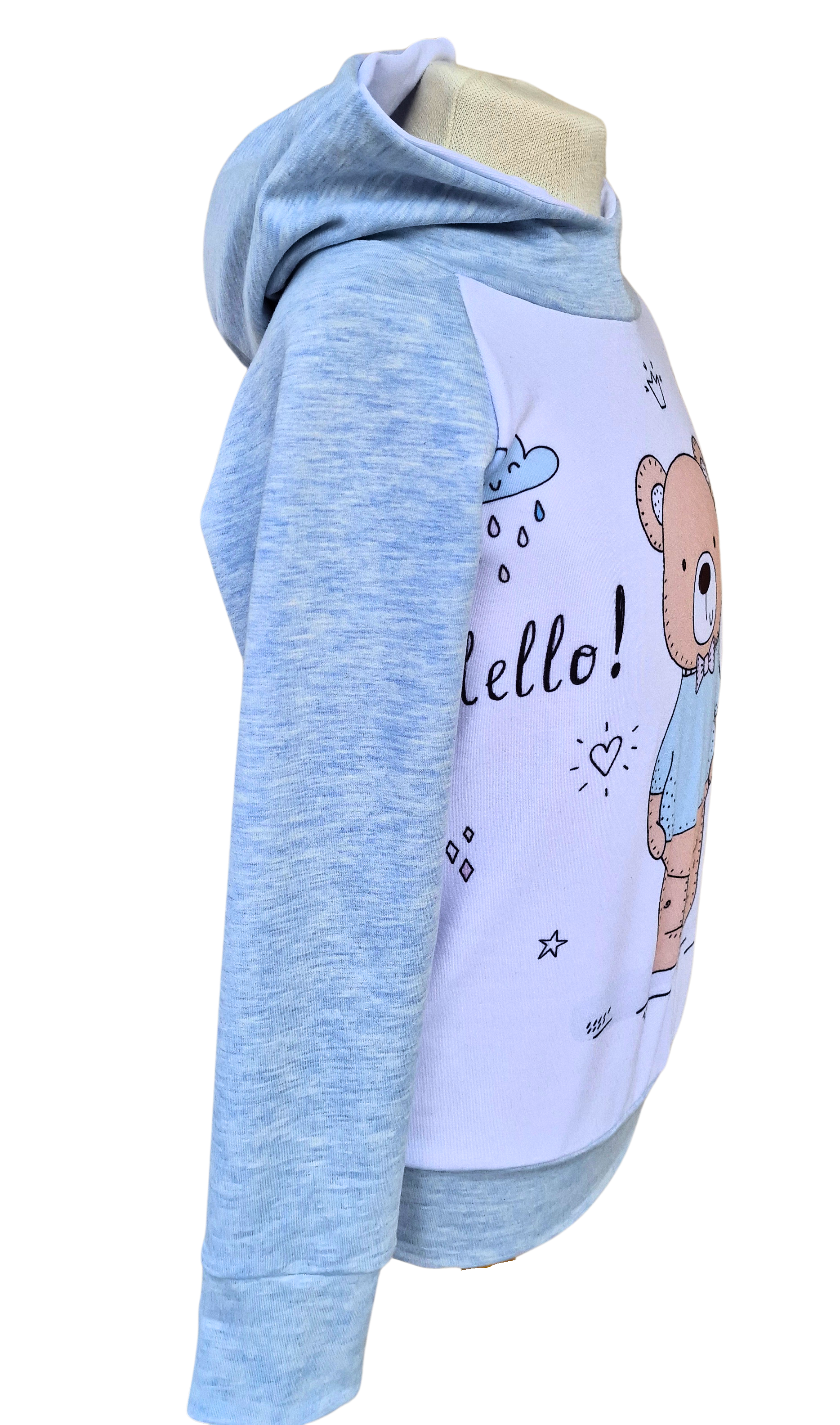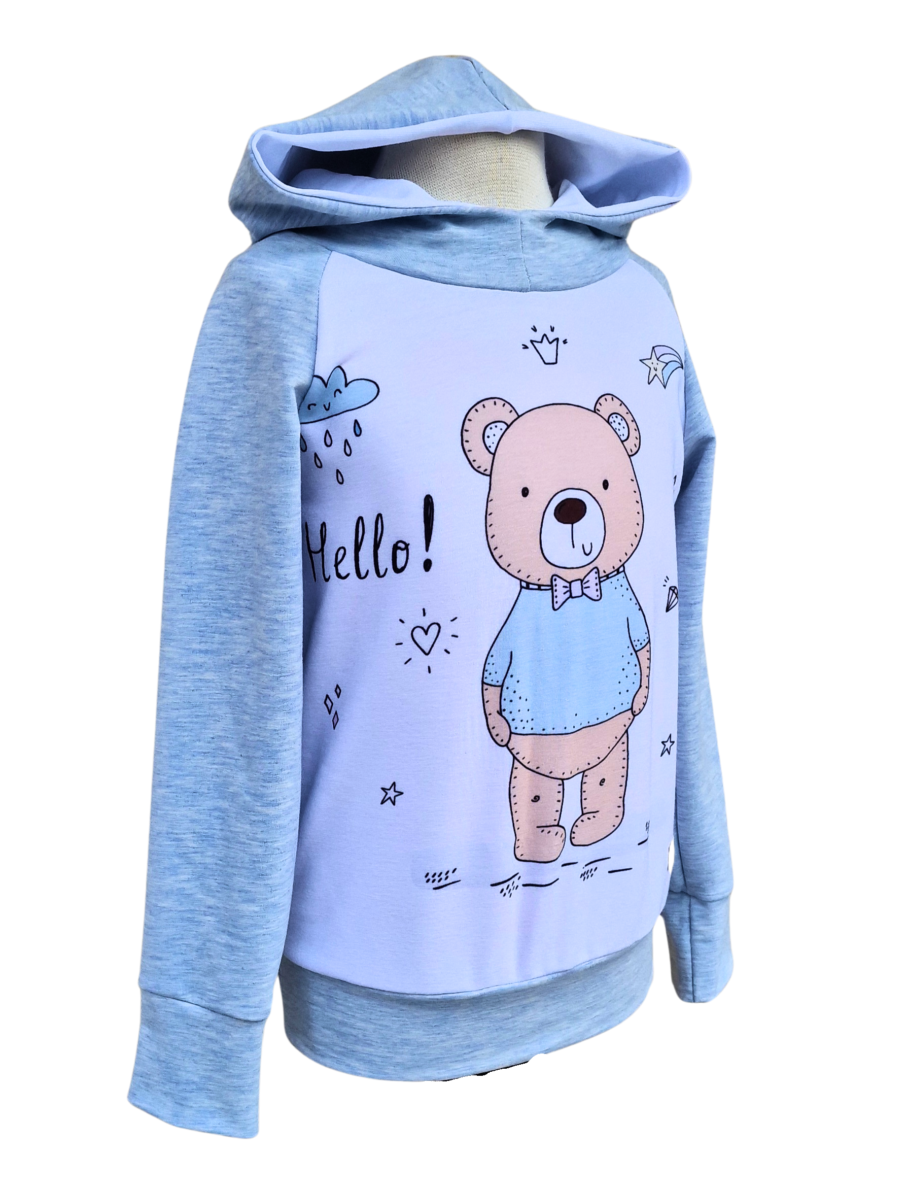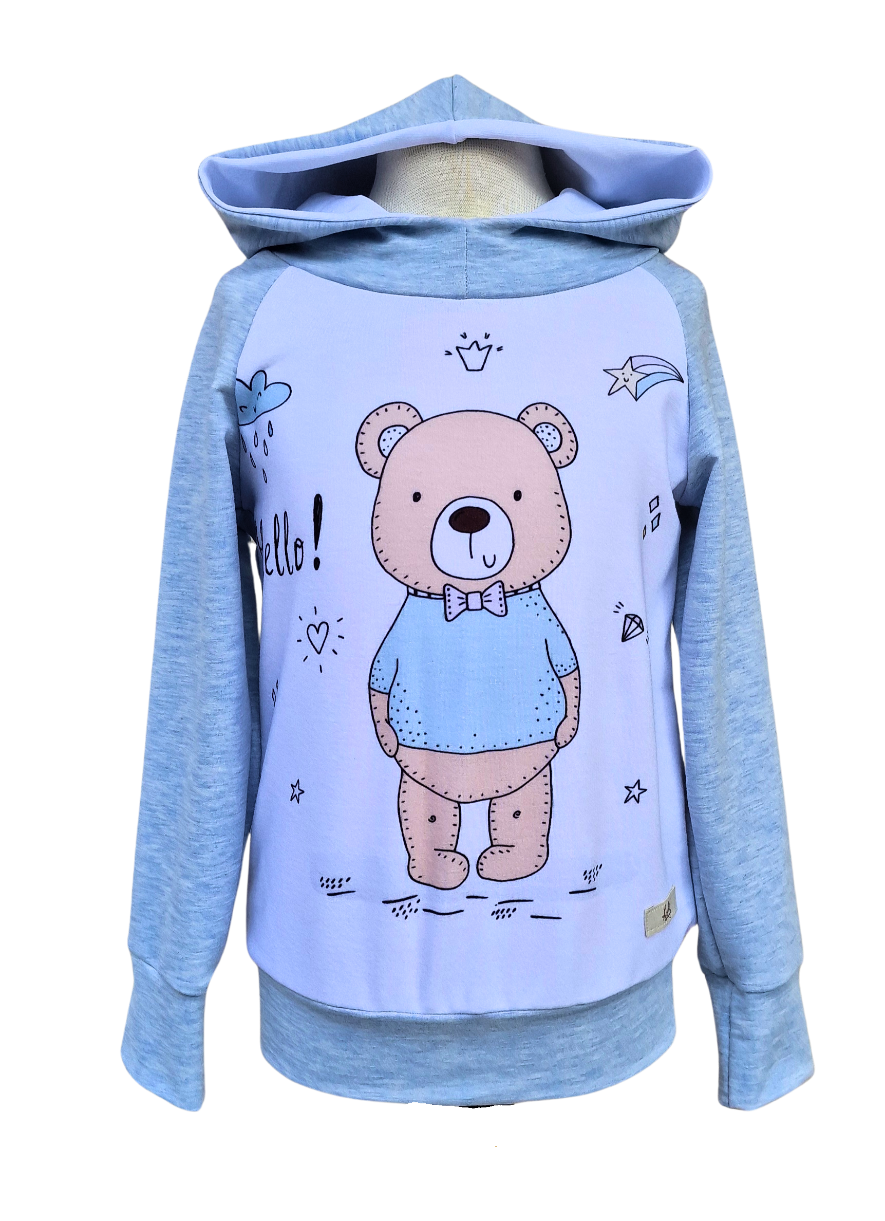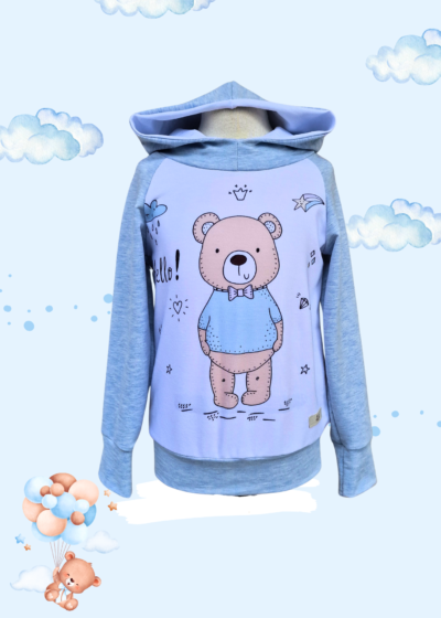 Pulover s simaptičnim medvedkom, sešit iz nežega bomažnega pletiva v sinje modri barvi in s kapuco.