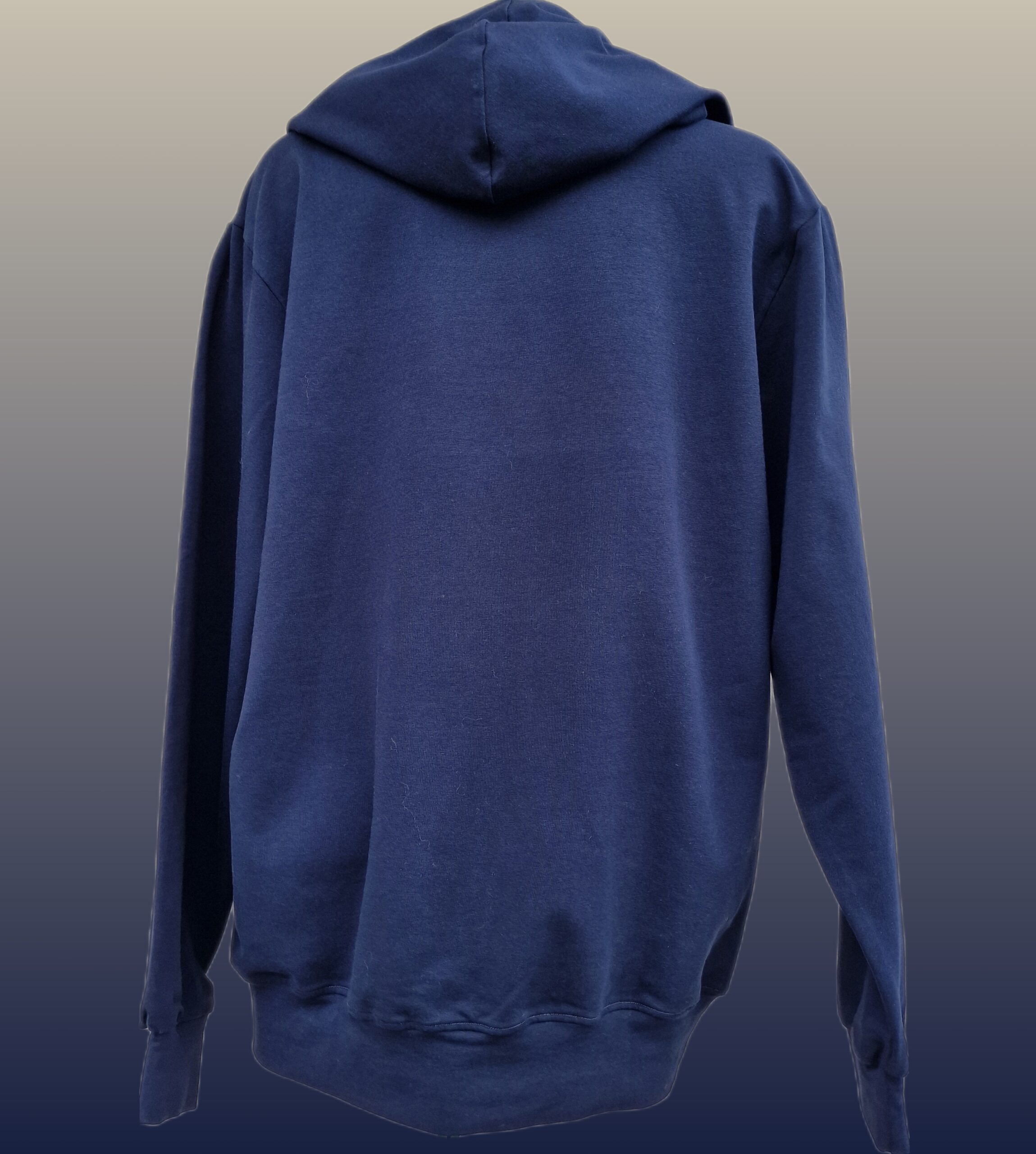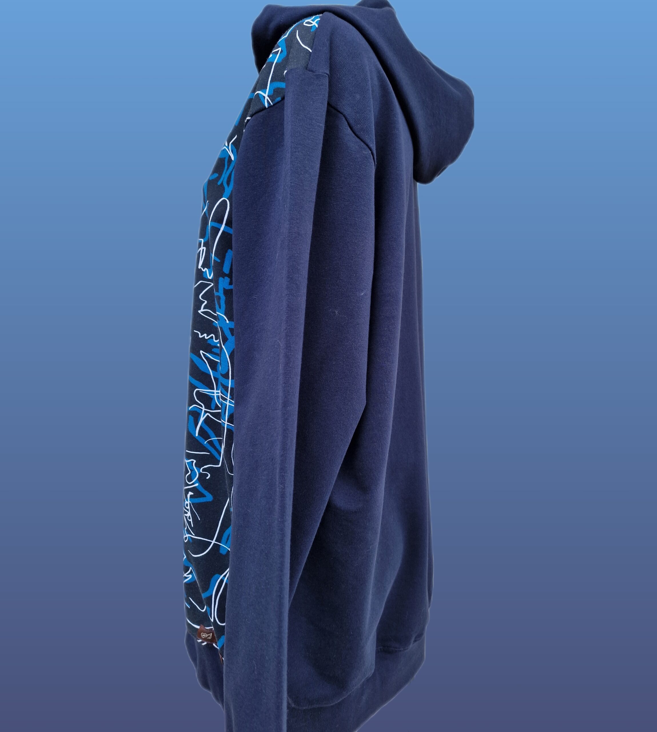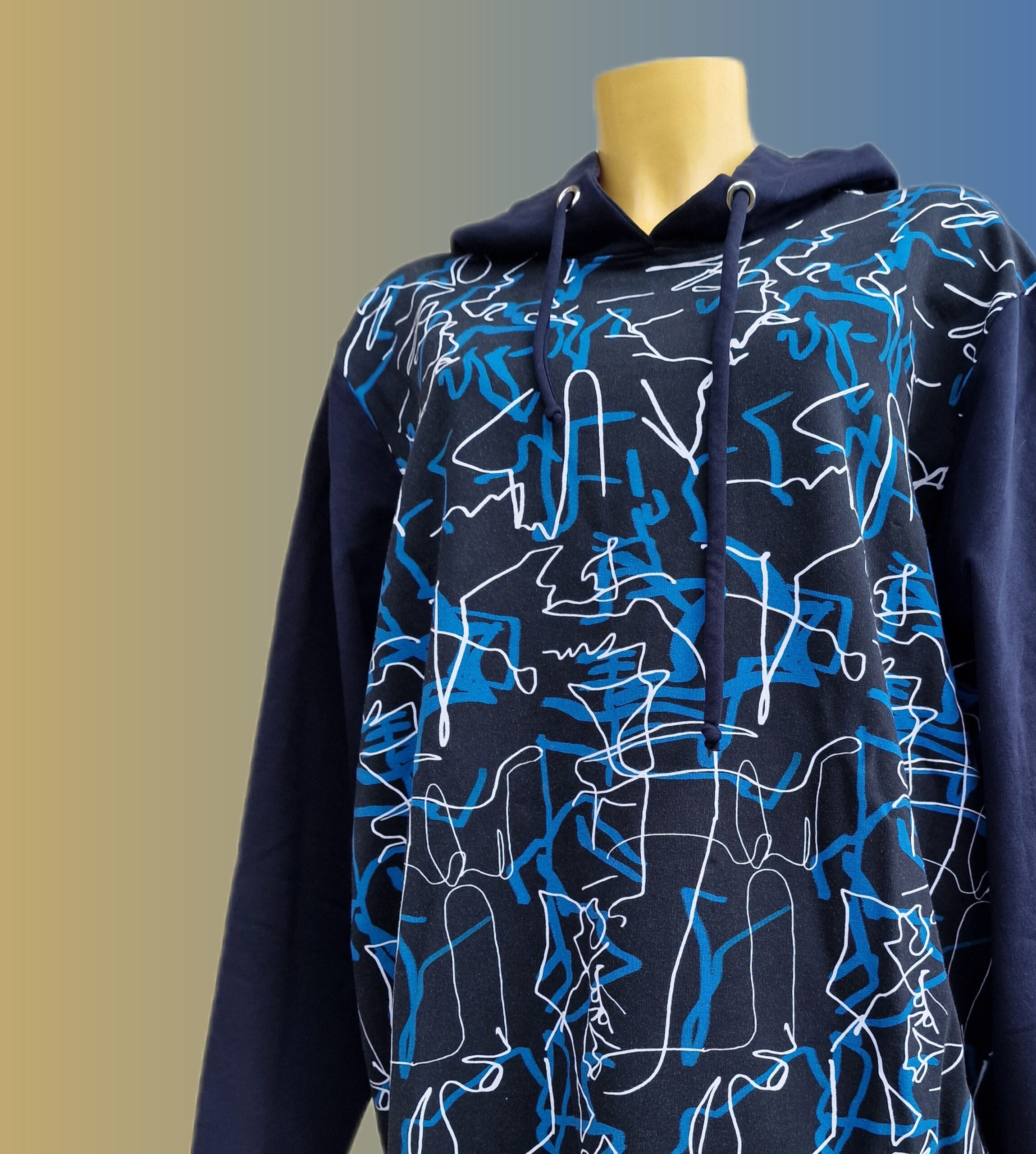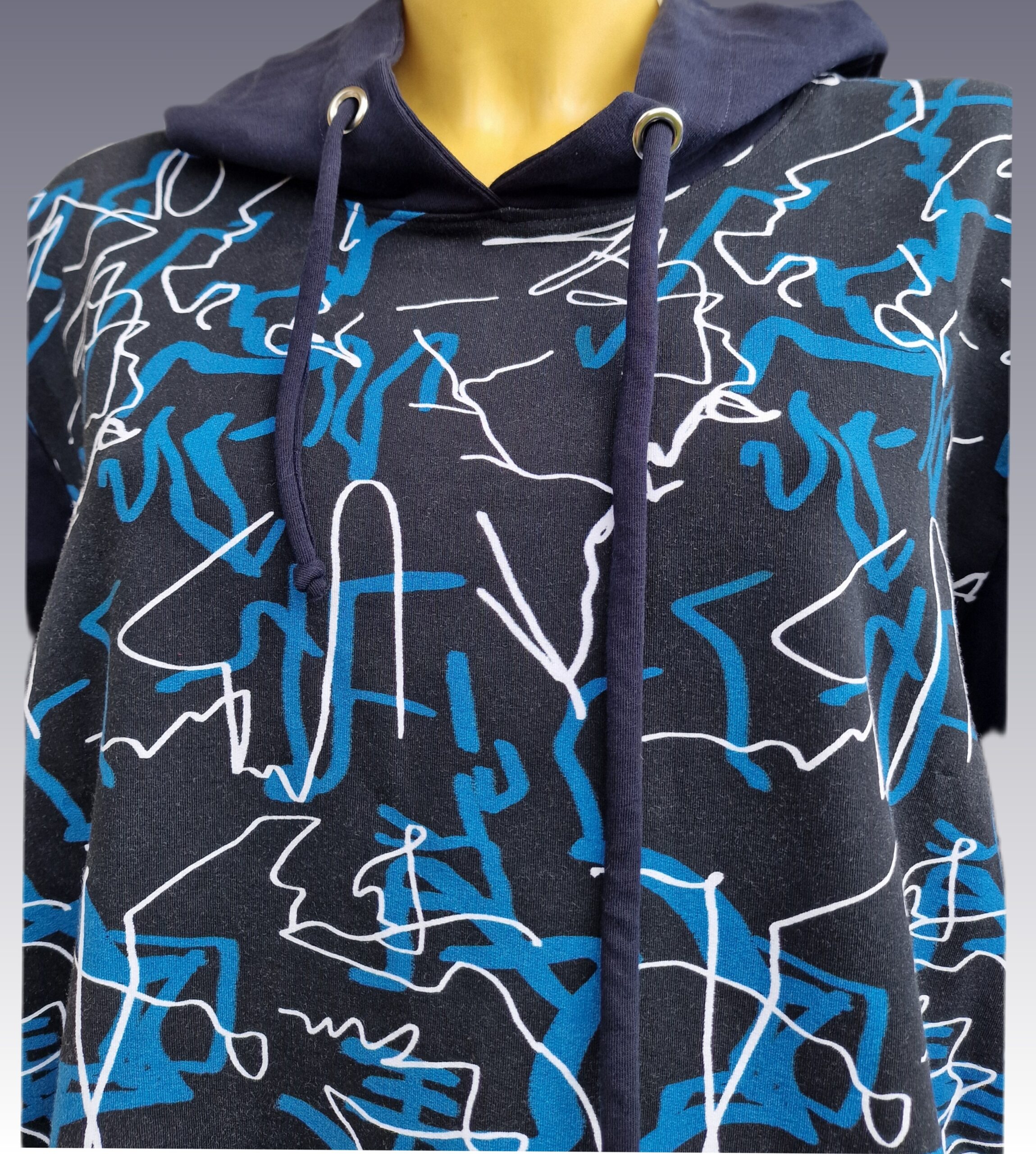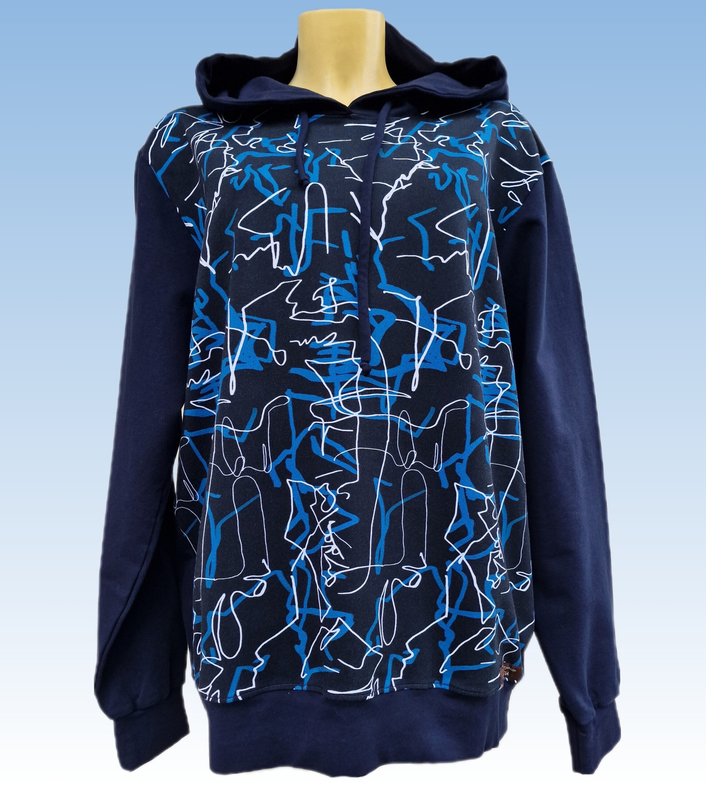 Pulover v modri barvi s kapuco s funkcionalno vrvico.