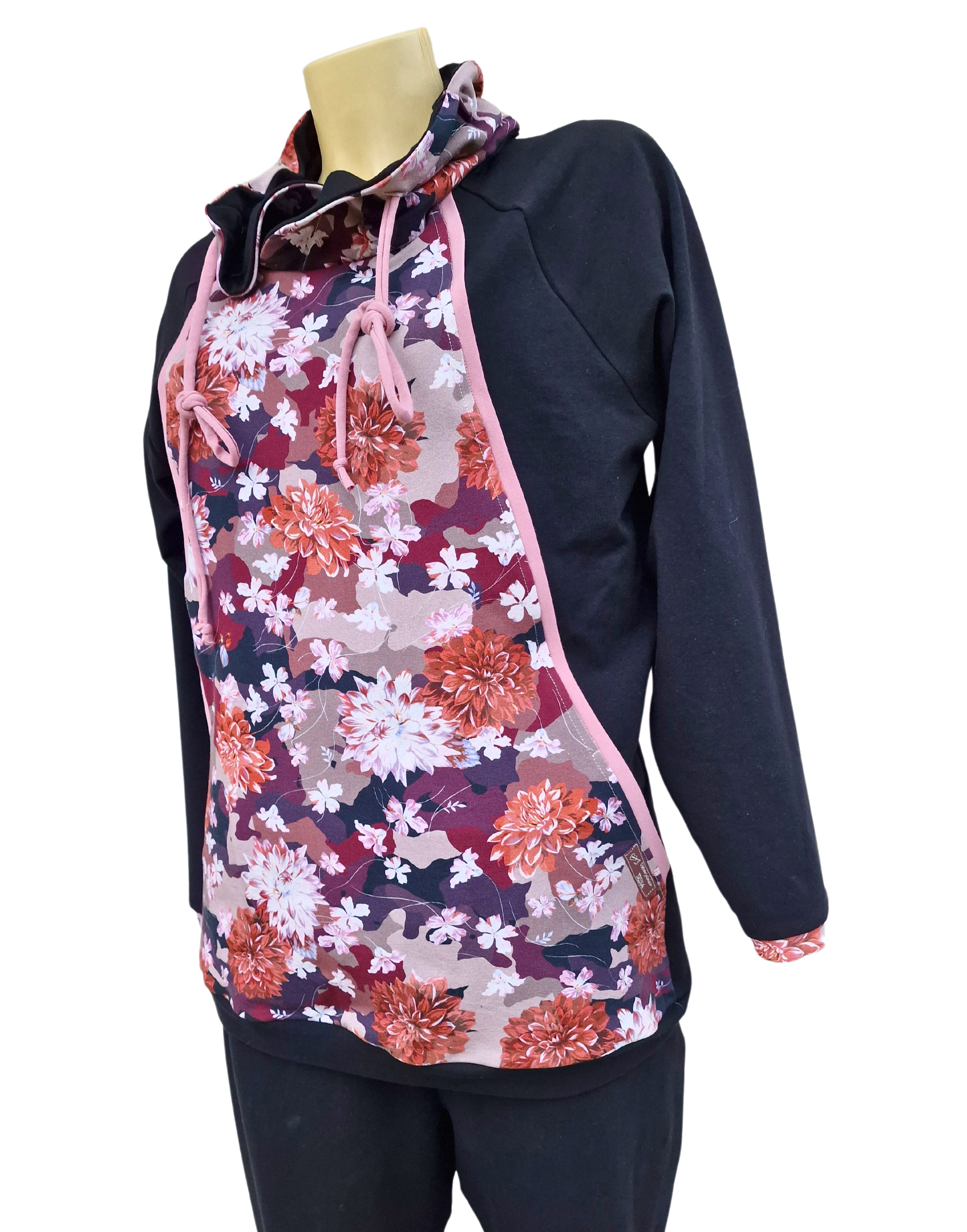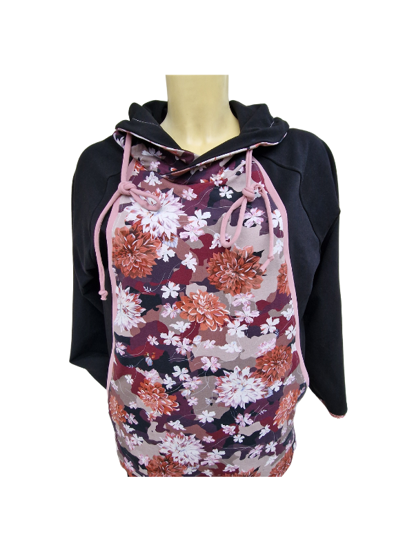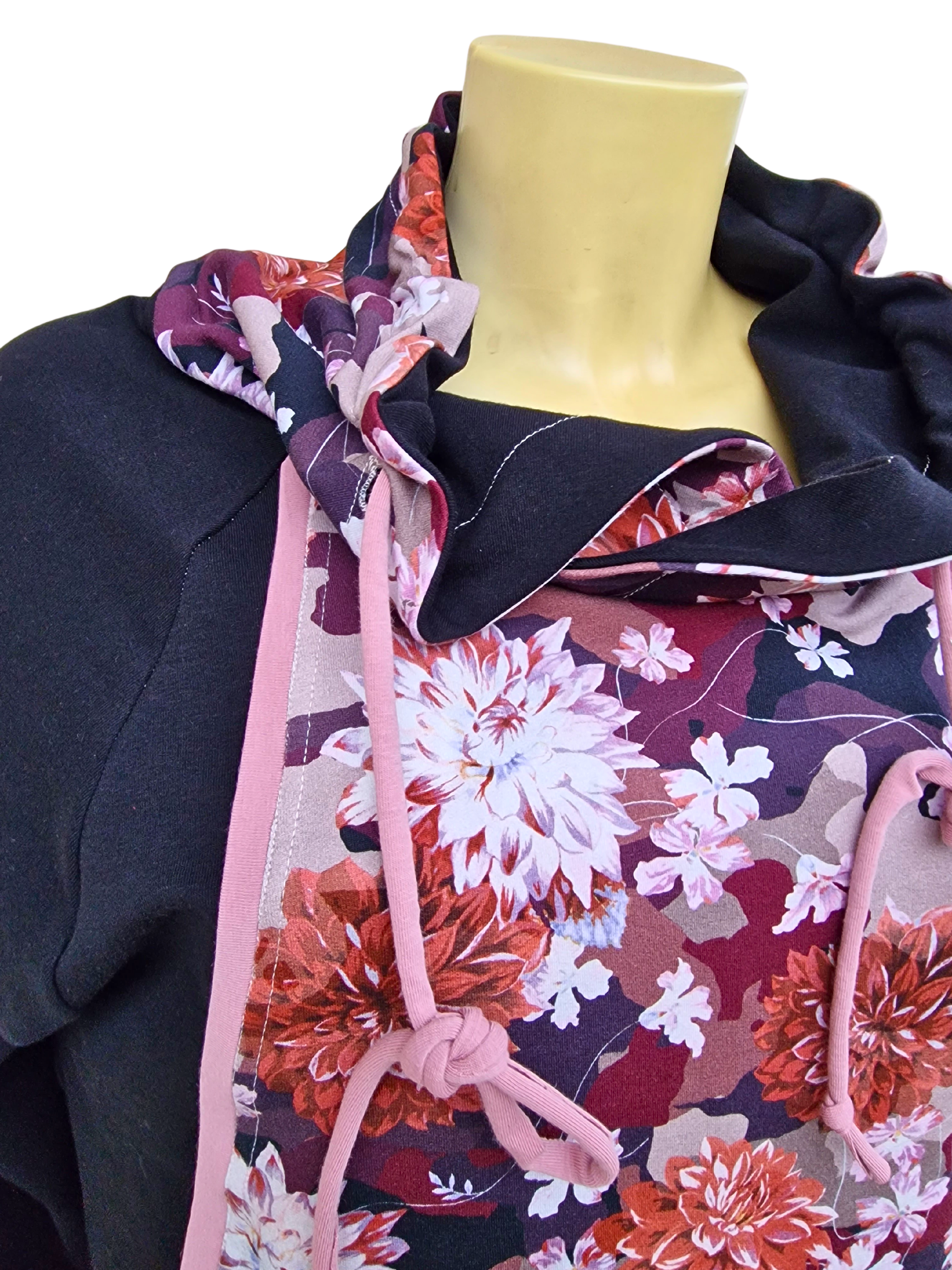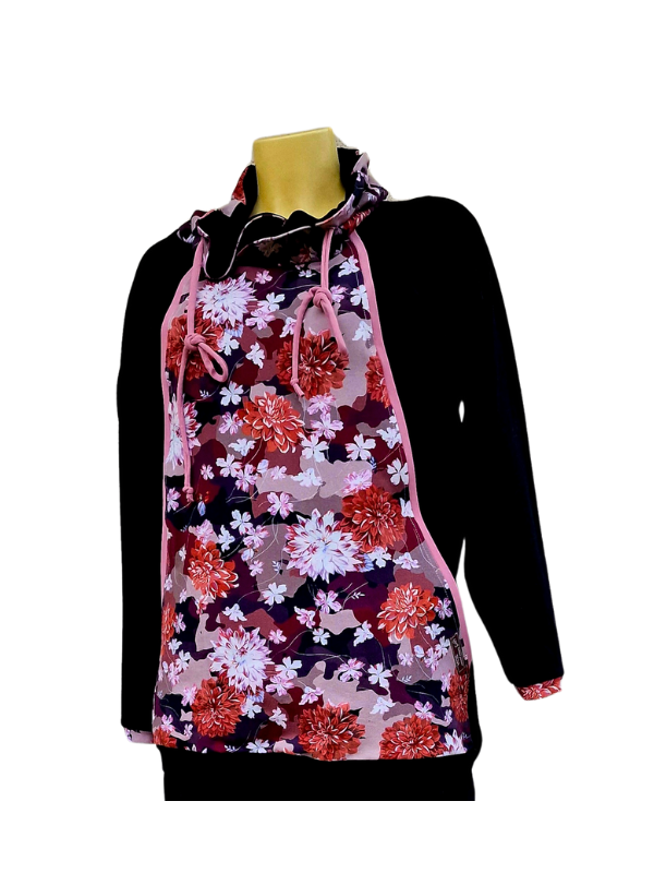 Pulover v zanimivem kroju z žepi, skritimi v prednjem delu. Pulover je črn z lepimi cveetovi v jesenskih barvah z dodatkom modne stare roza barve.