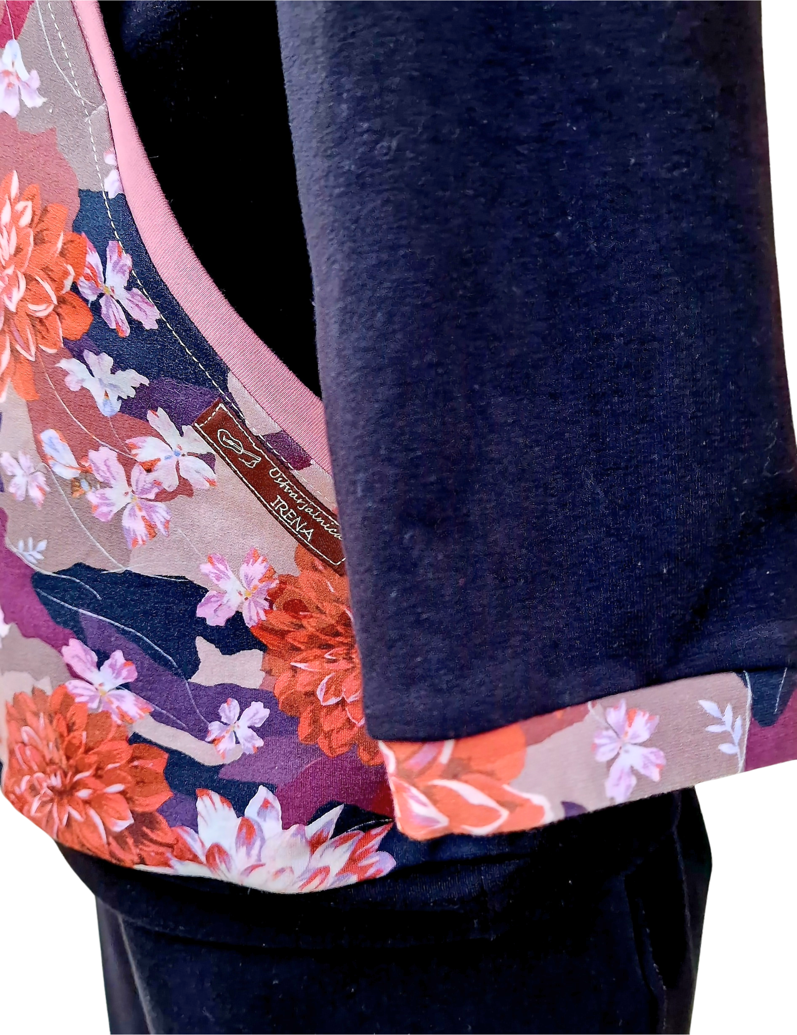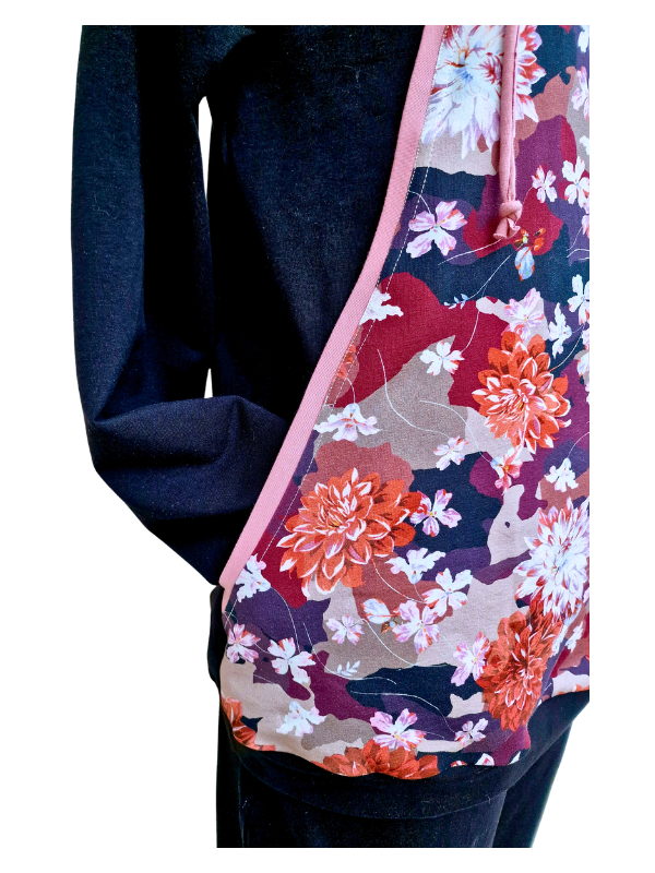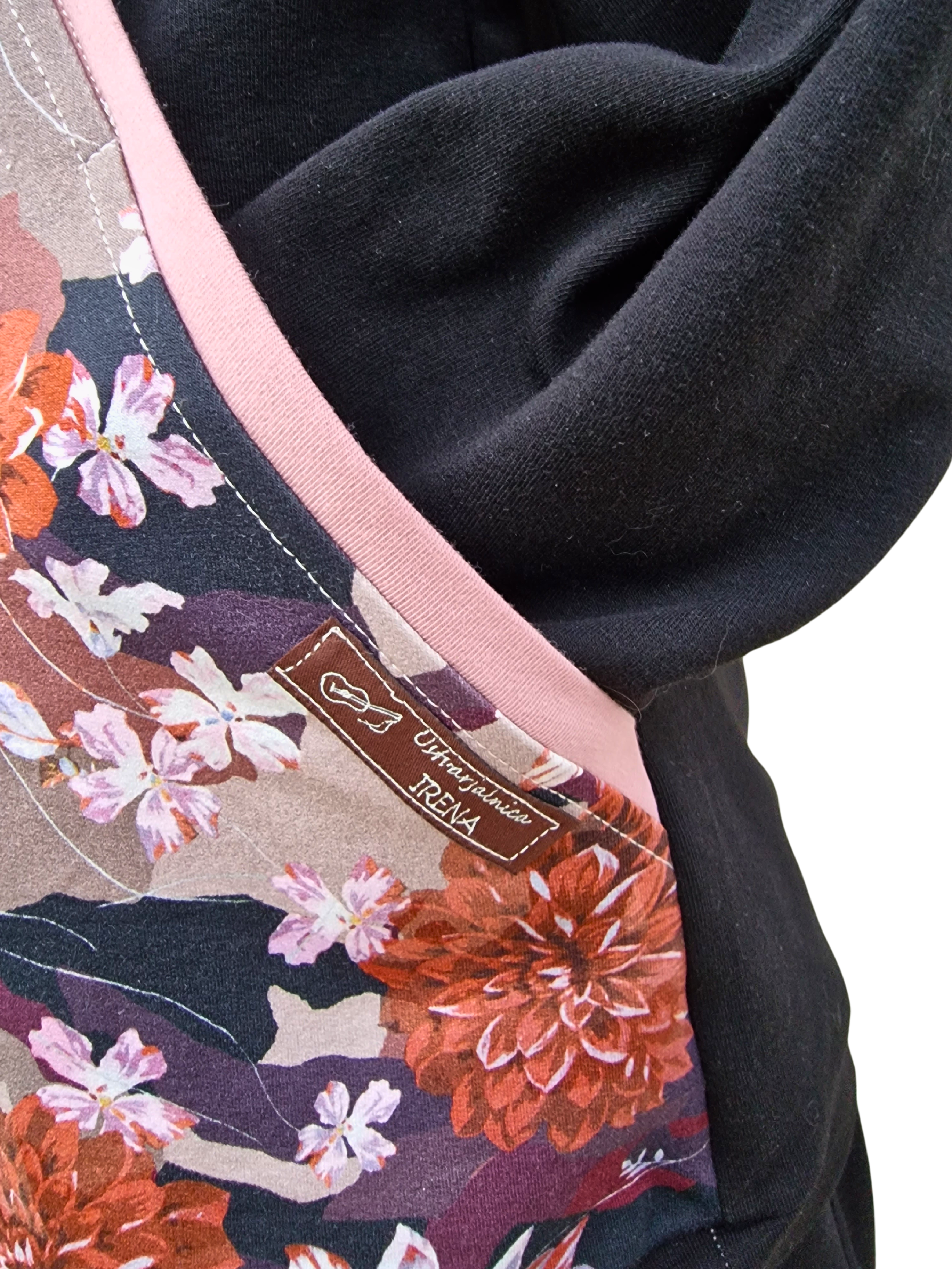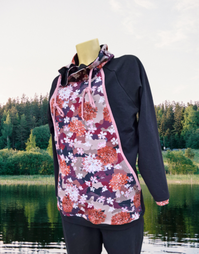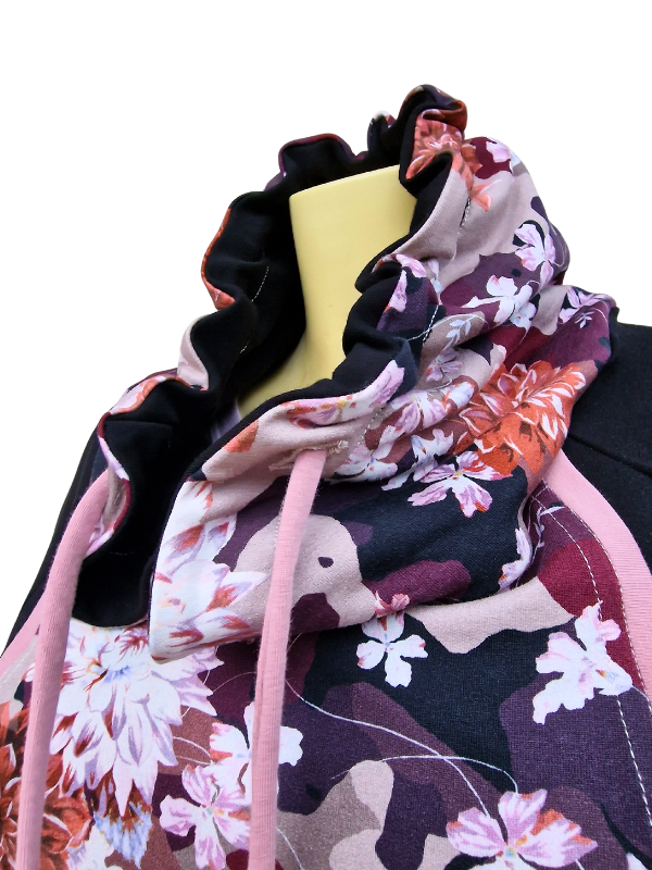 Pulover v zanimivem kroju z žepi, skritimi v prednjem delu. Pulover je črn z lepimi cveetovi v jesenskih barvah z dodatkom modne stare roza barve.