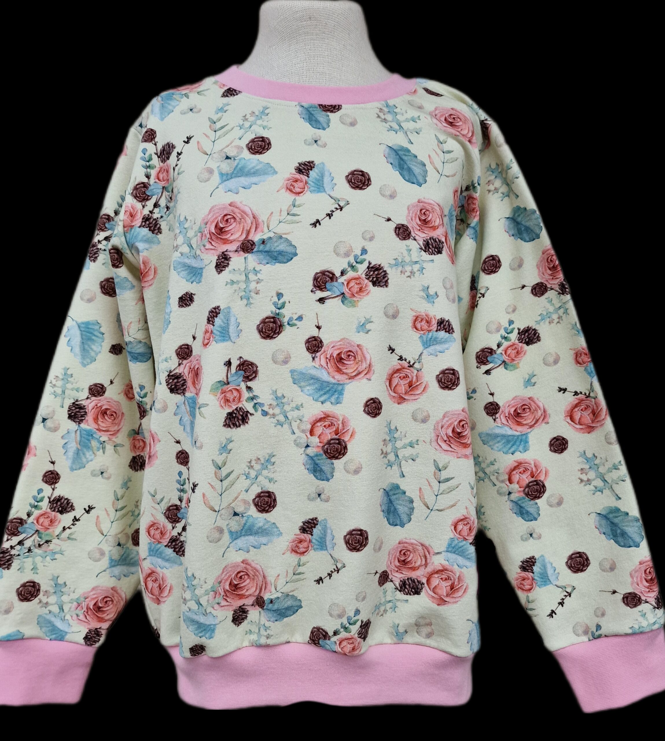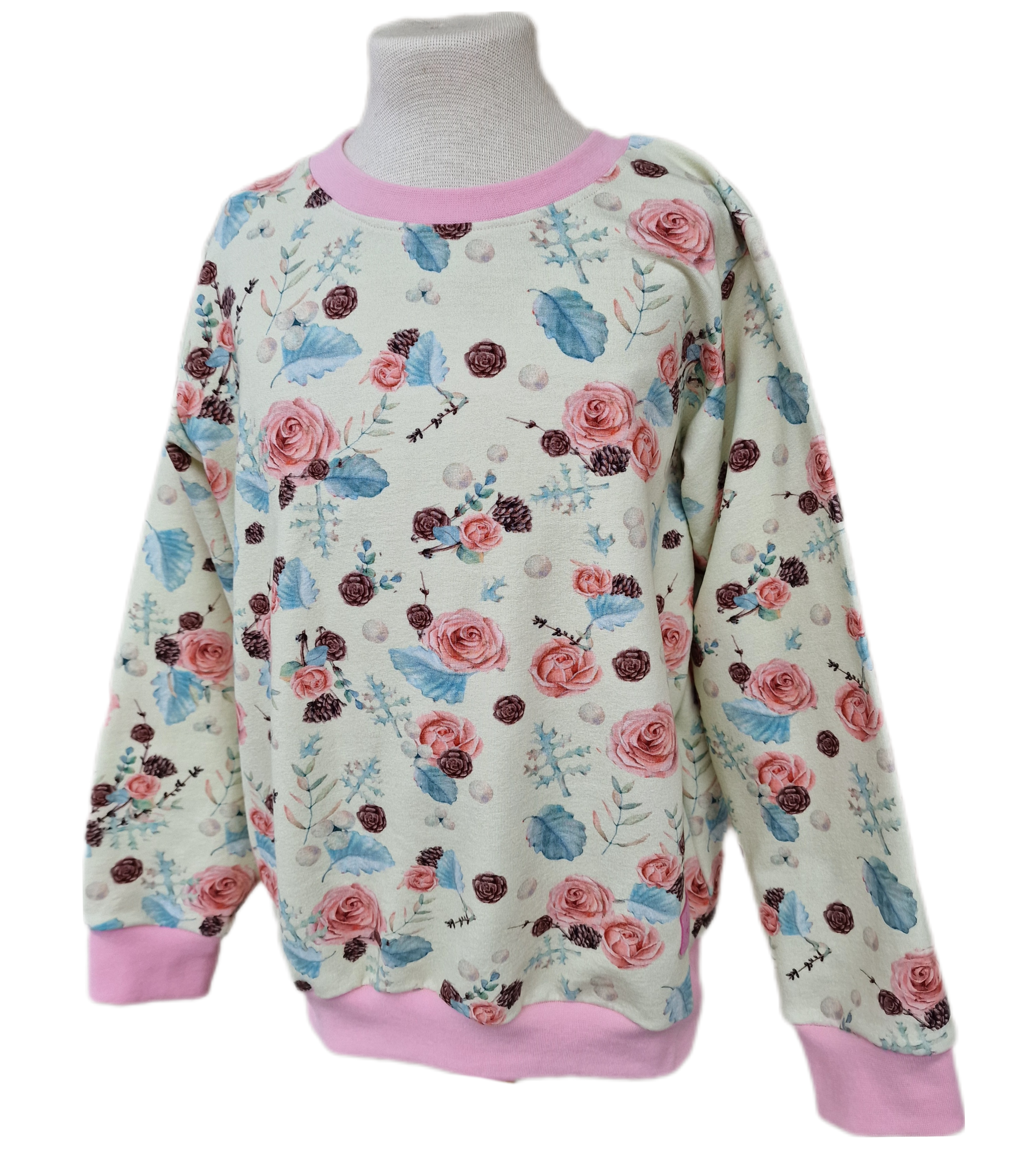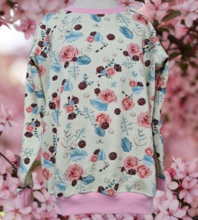 Pulover je sešit iz nežne bombažne pletenine, posute z lepimi vrtnicami.
