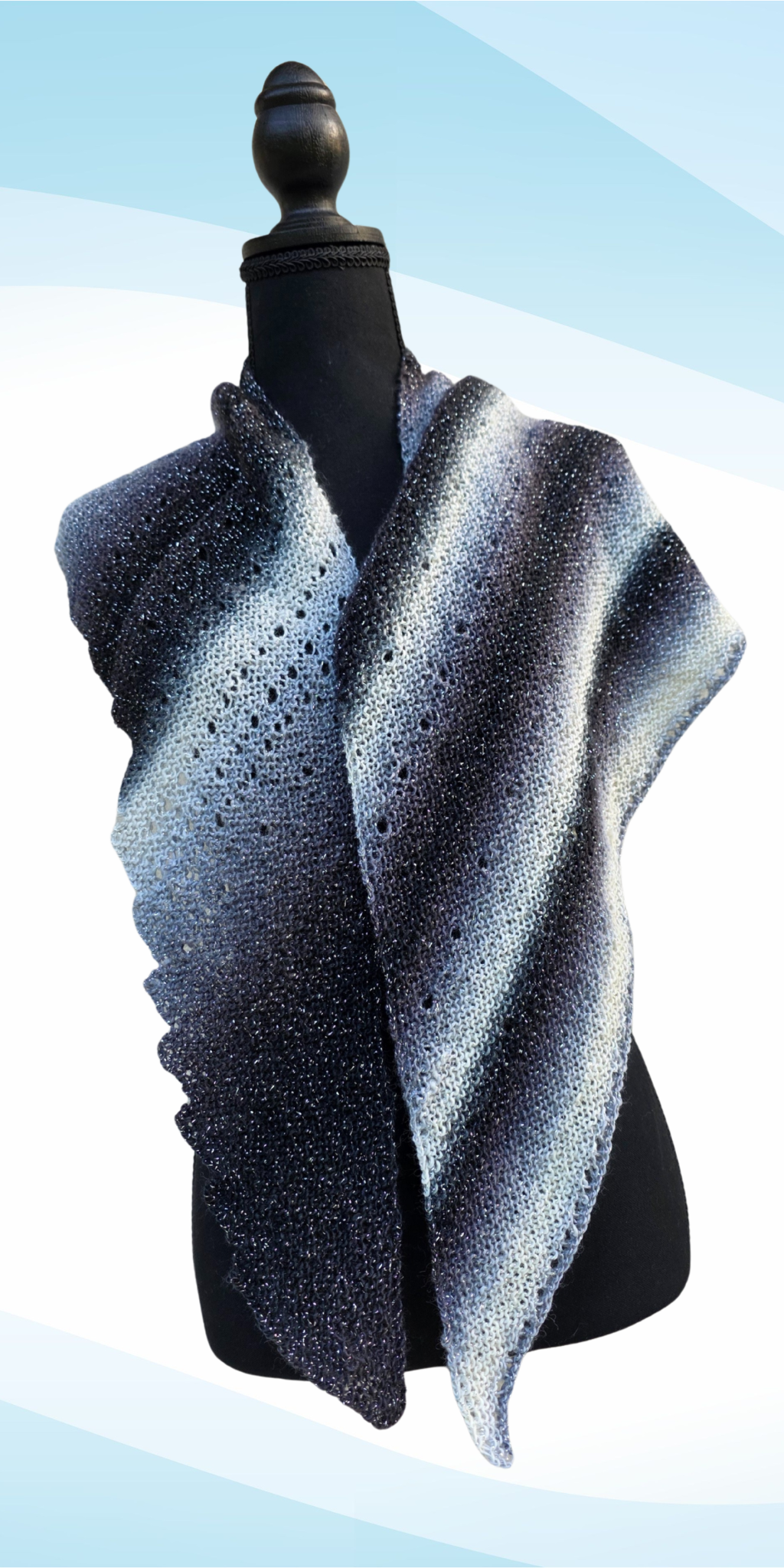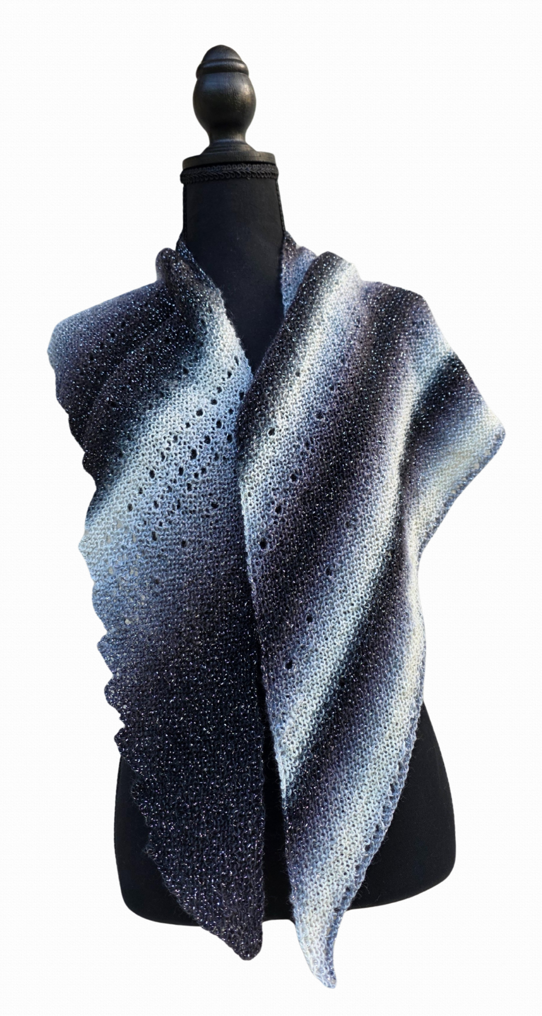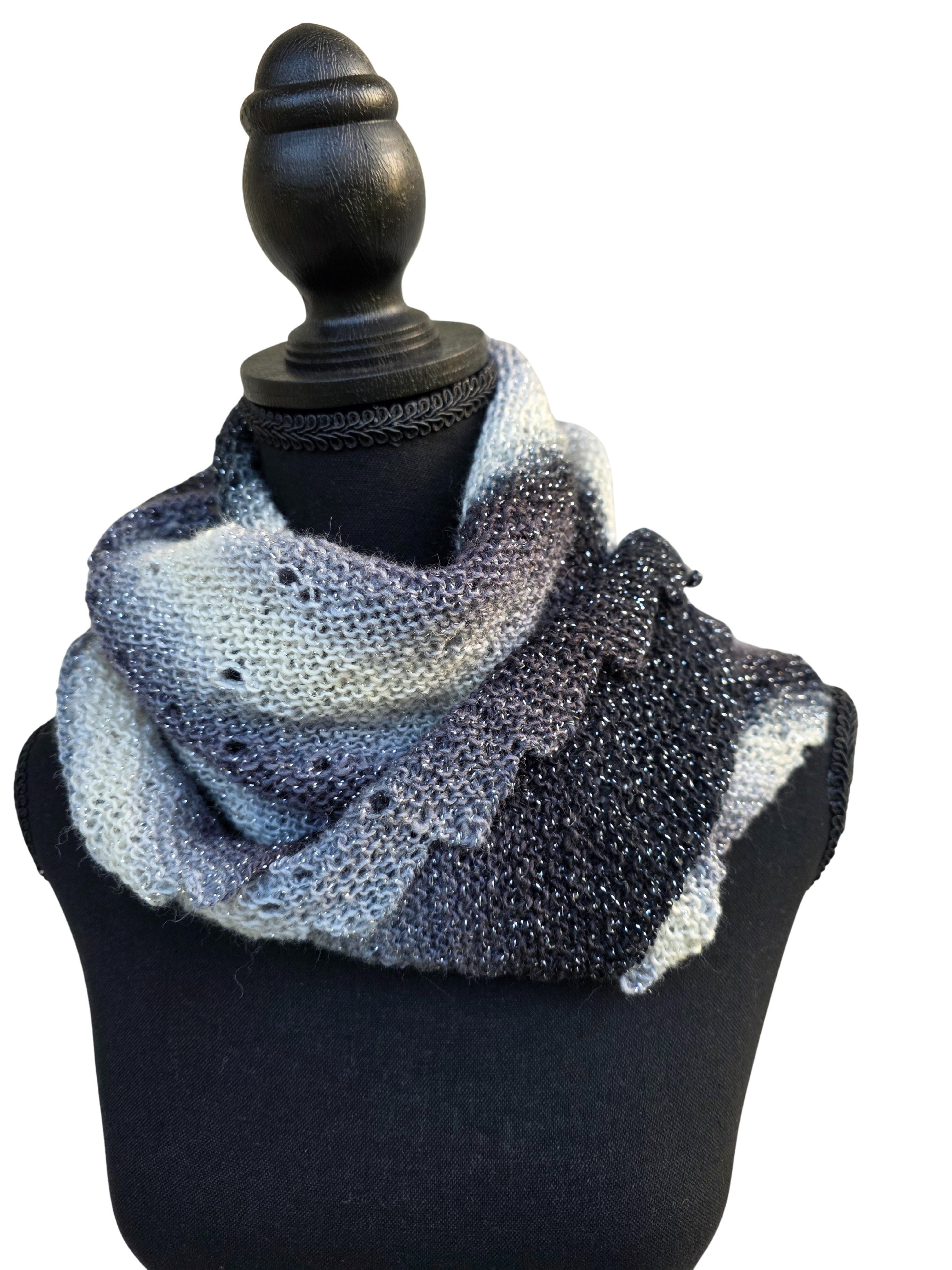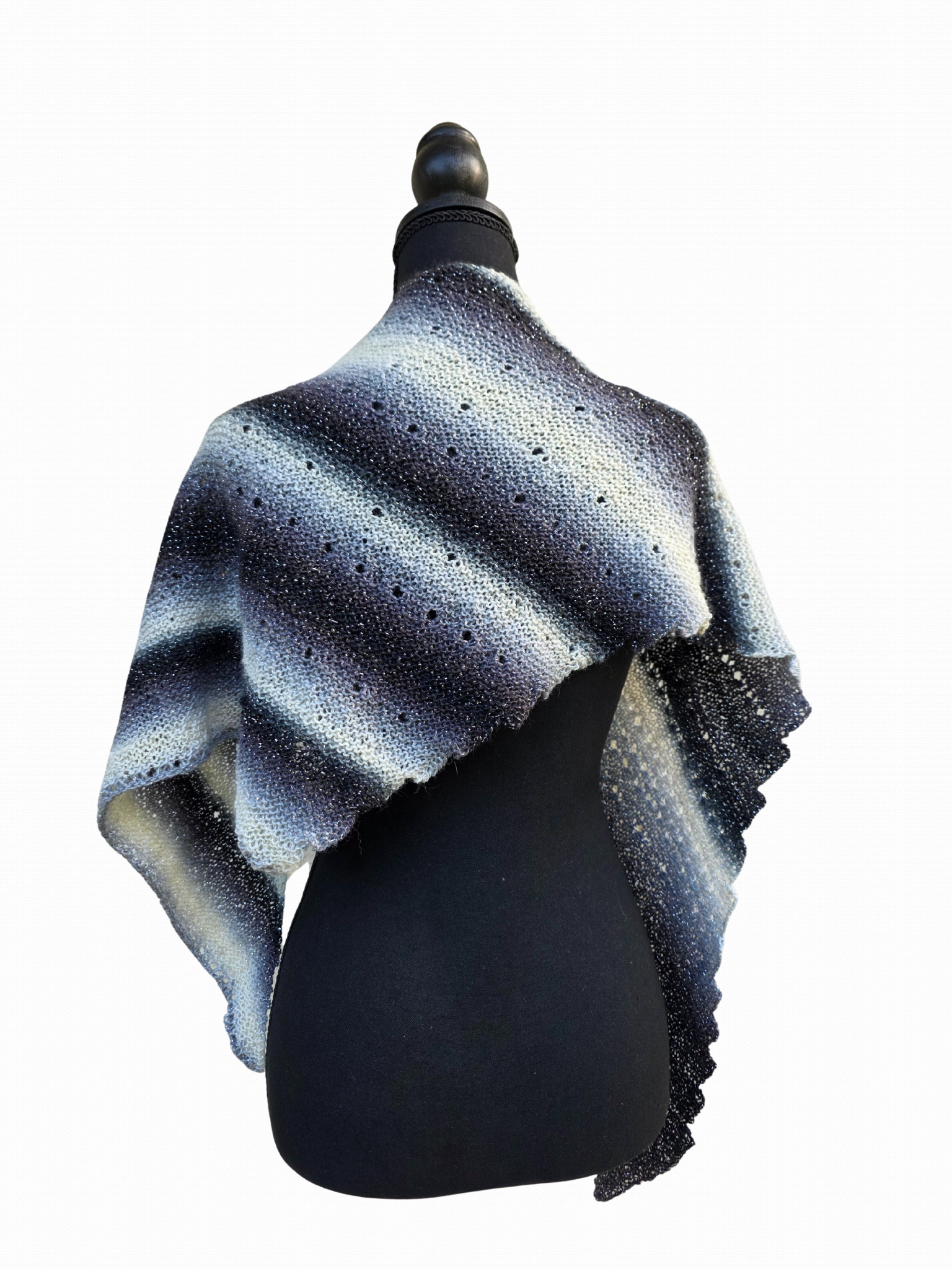 Šal v trikotni obliki v prelivajočih odtenkih od bele preko sive do črne barve. Preja je prepredena s tanko lurex nitko.