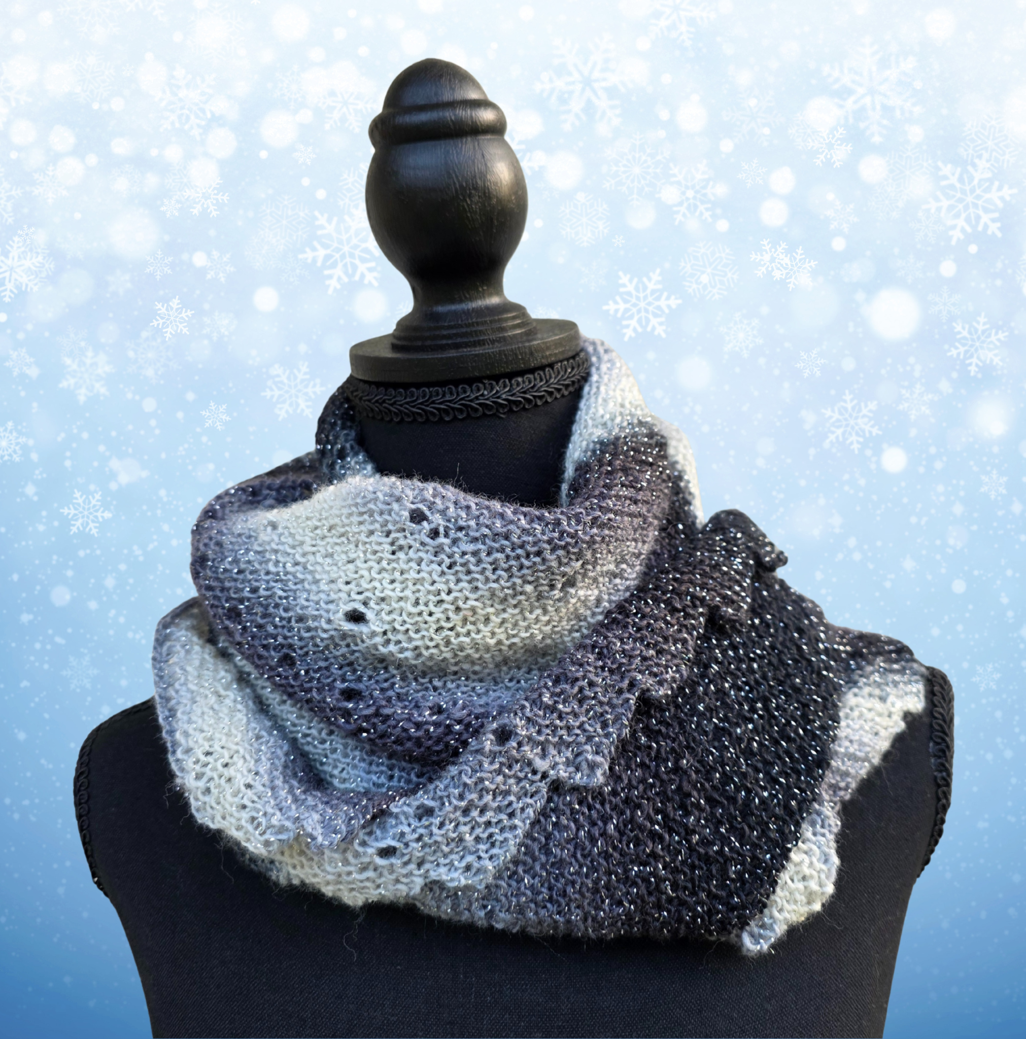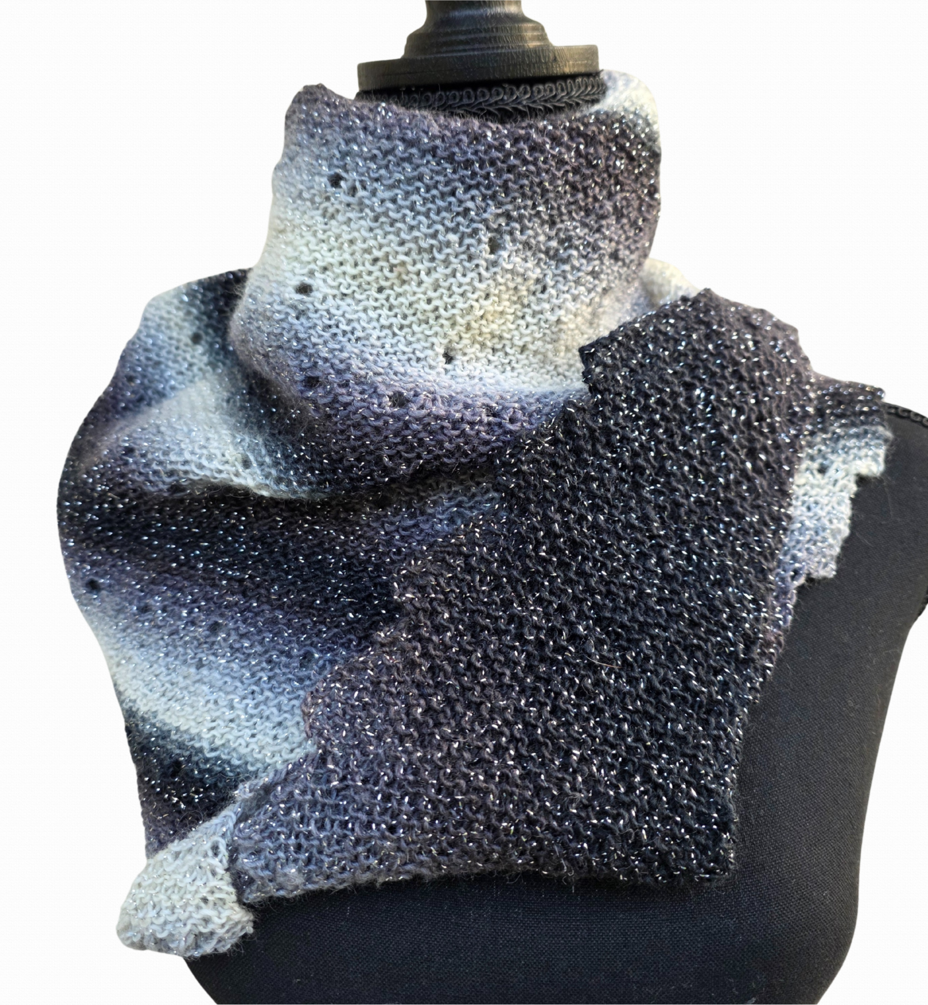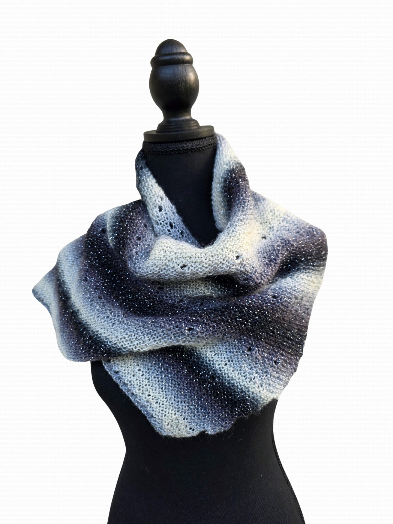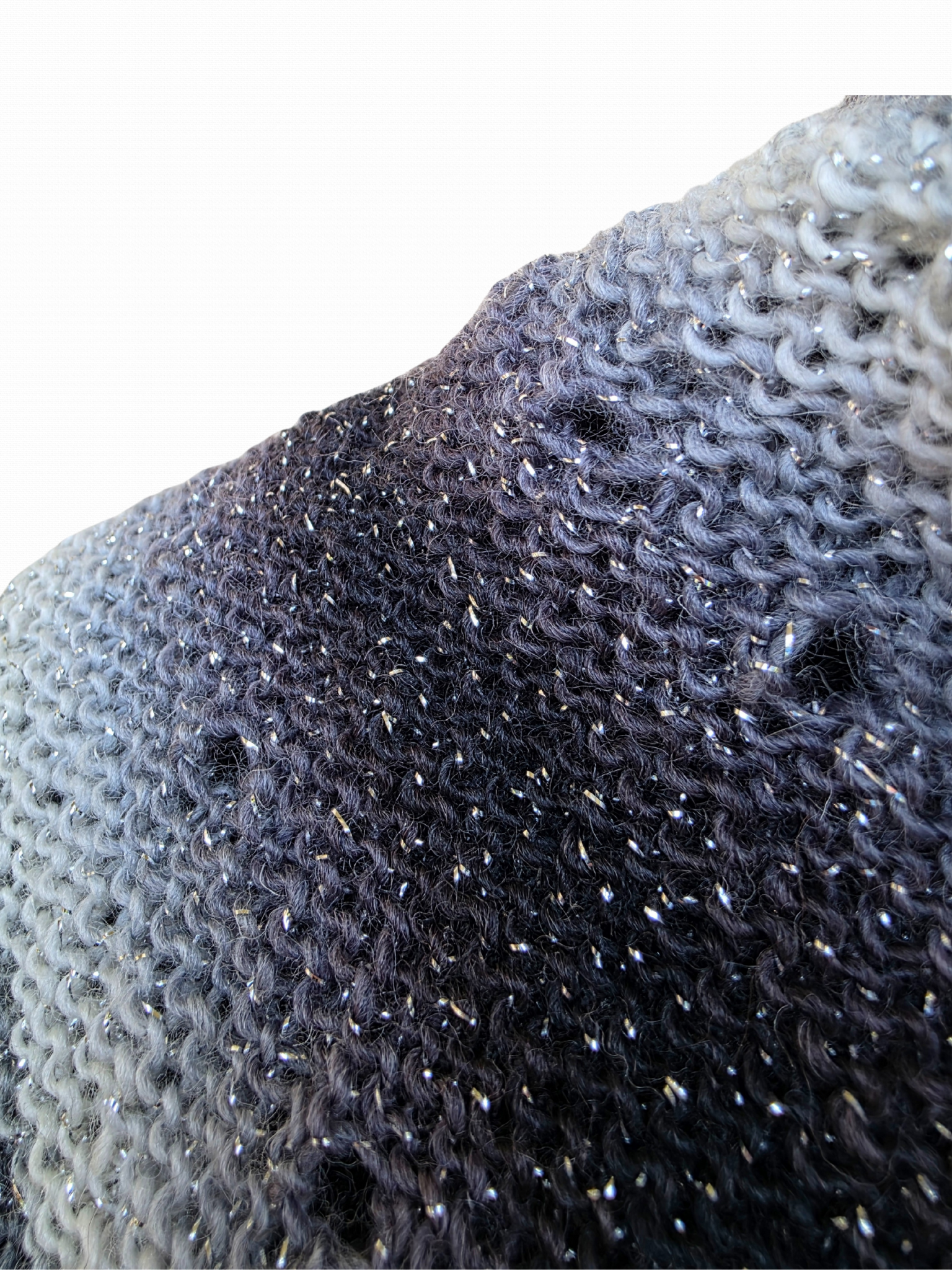 Šal v trikotni obliki v prelivajočih odtenkih od bele preko sive do črne barve. Preja je prepredena s tanko lurex nitko.