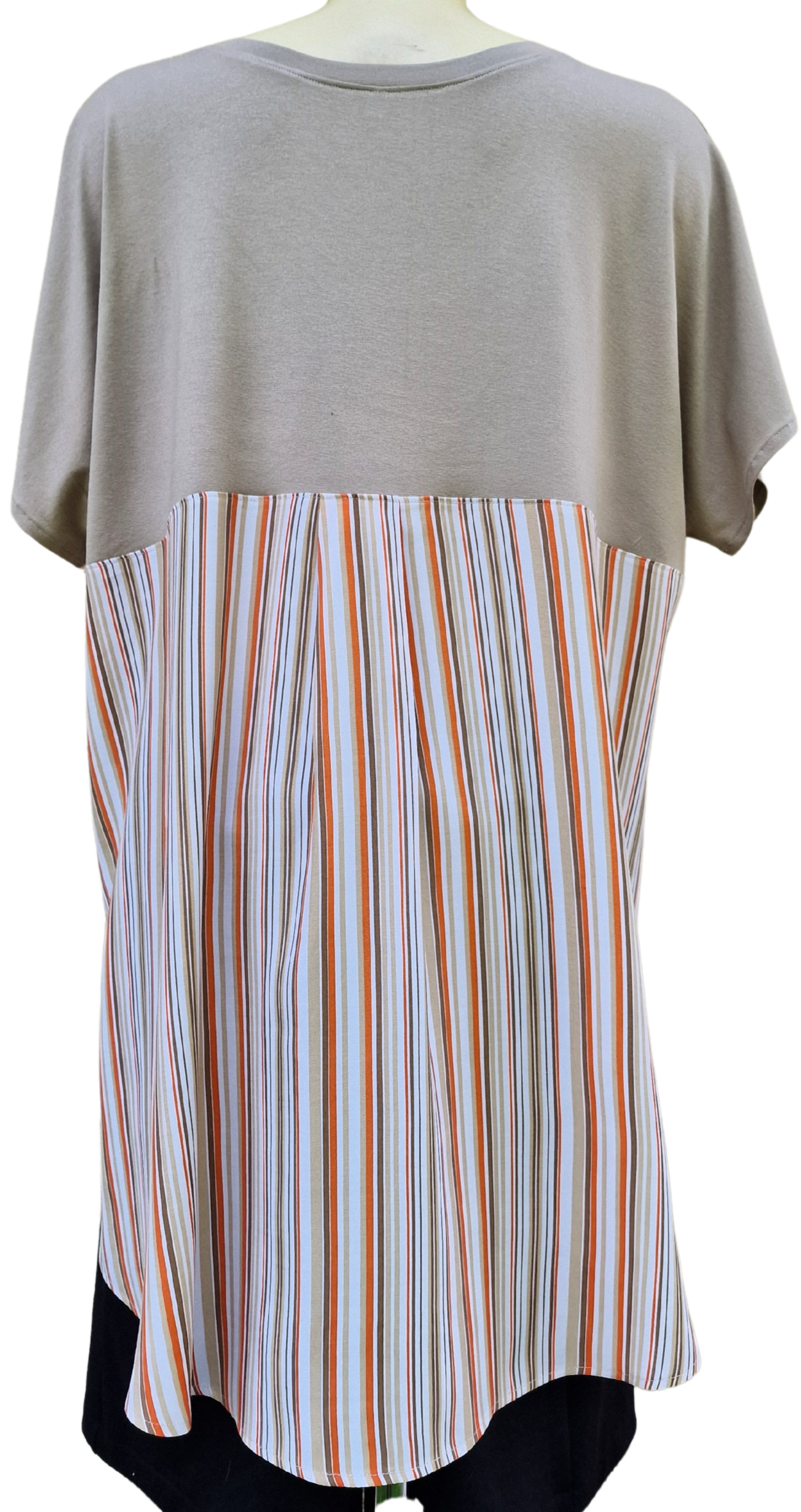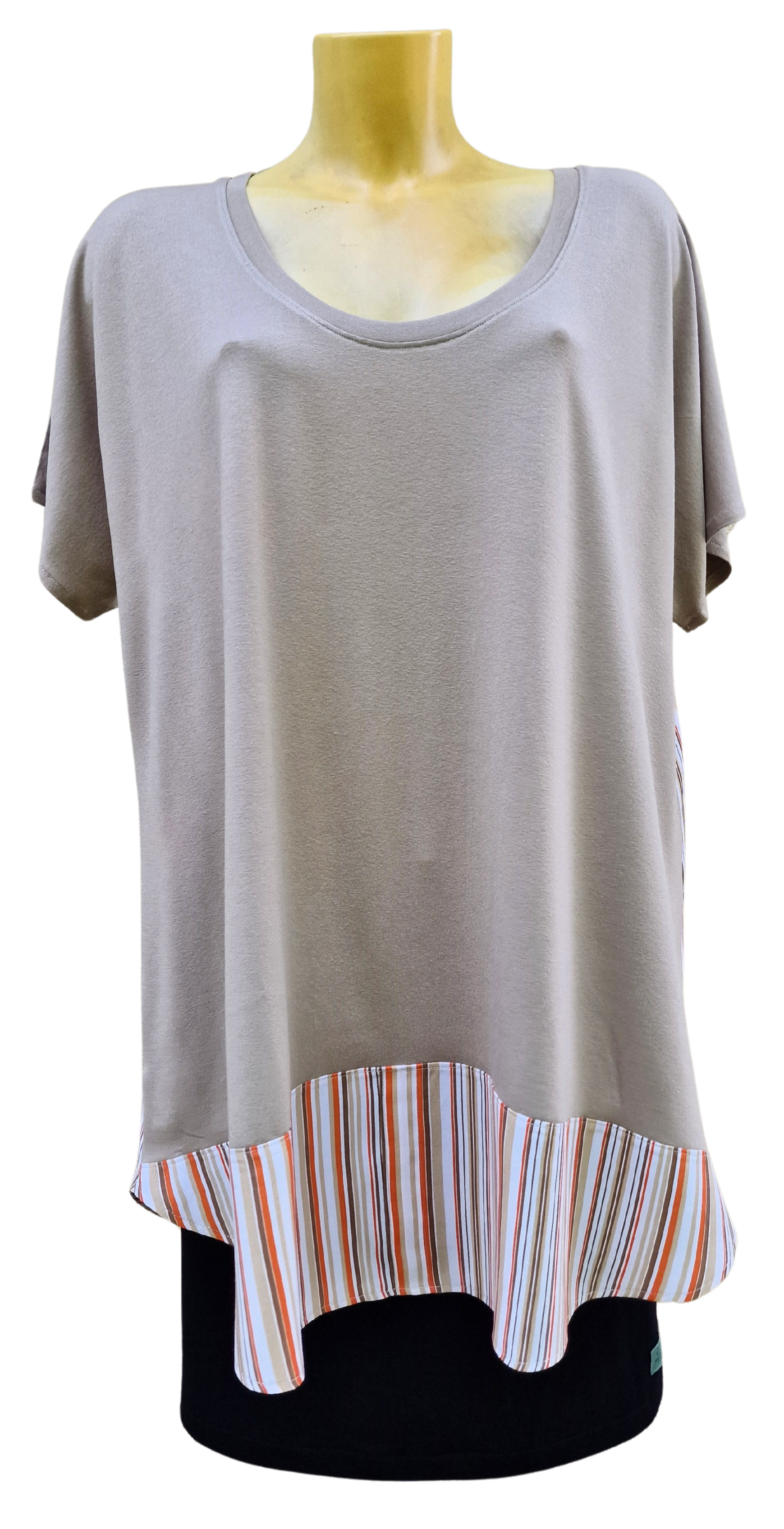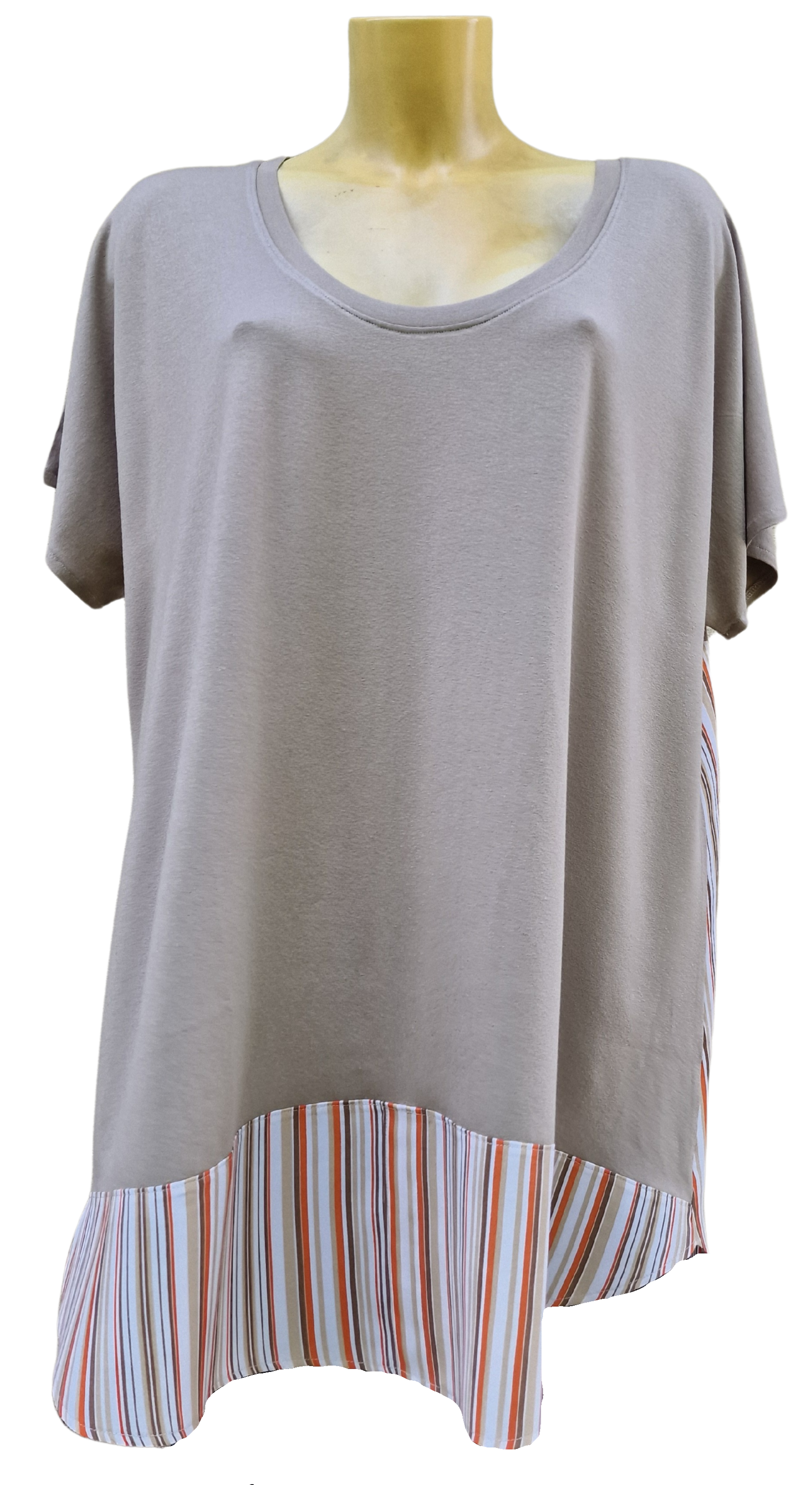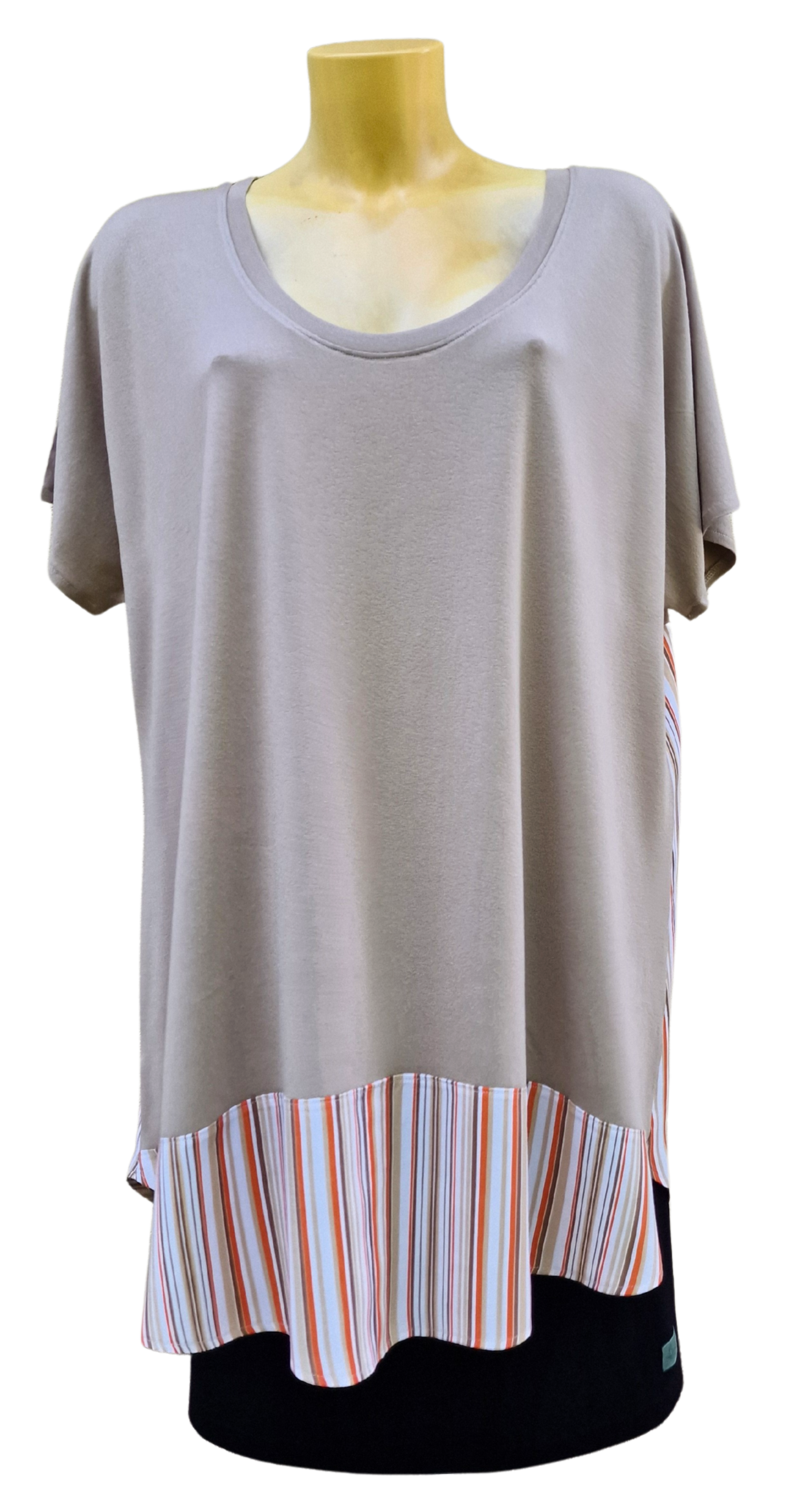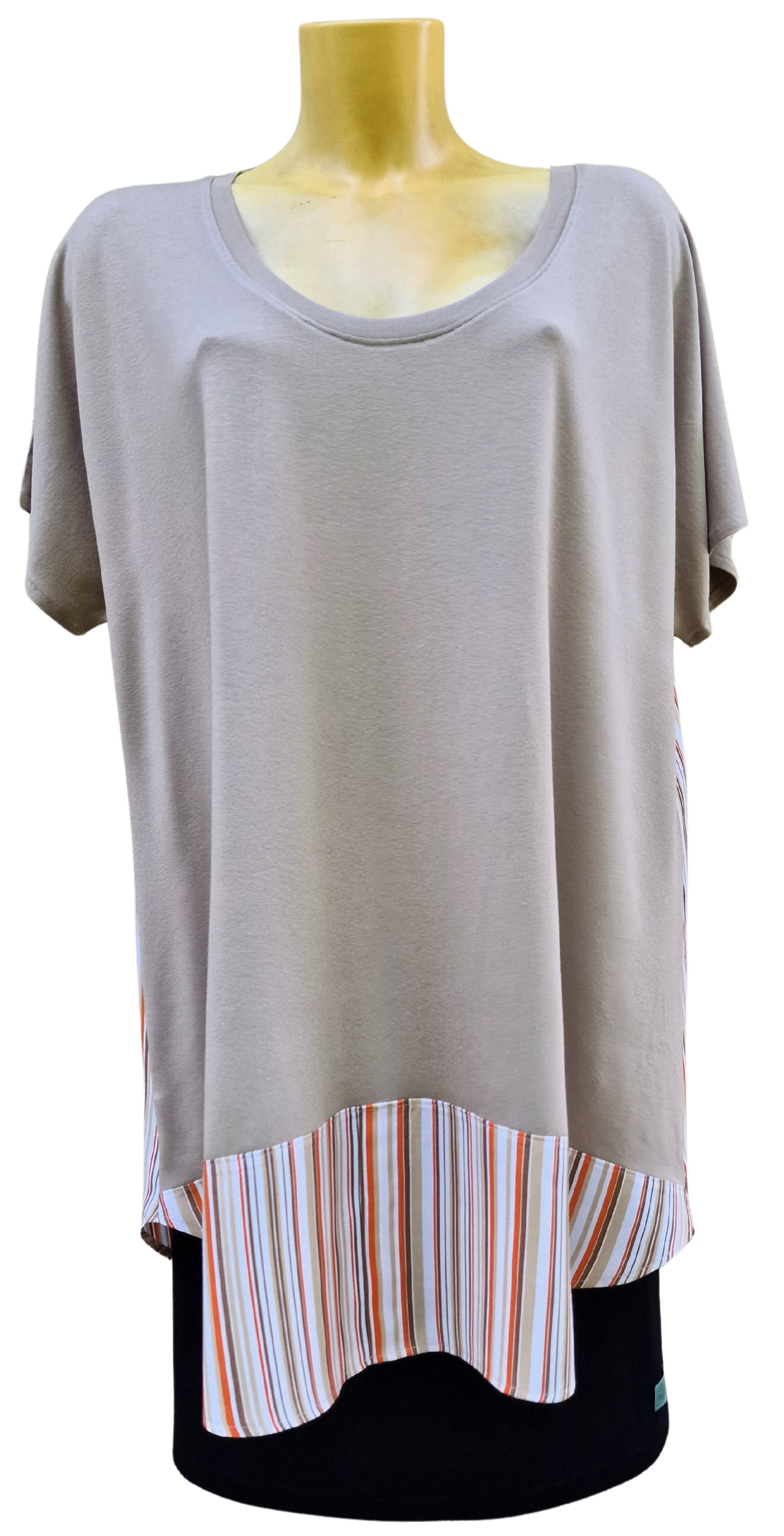 Tunika je sešita iz lahkega viskoznega jerseya in viskoze, primerna za vroče poletne dni. Sešita je v udobnem kroju, ki je zadaj podaljšan. Posebnost ji daje tudi kombinacija različnih materialov in vzorcev.