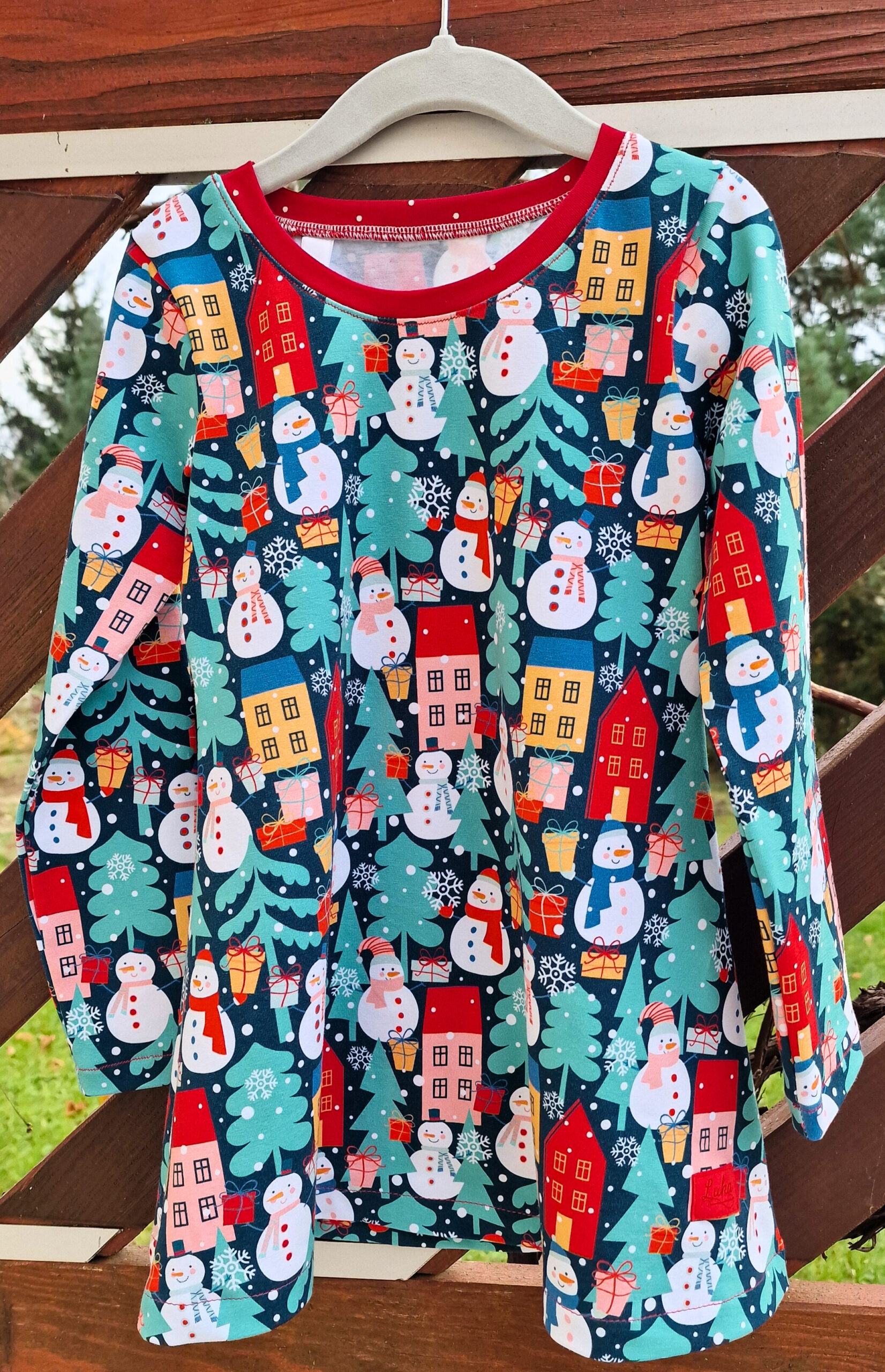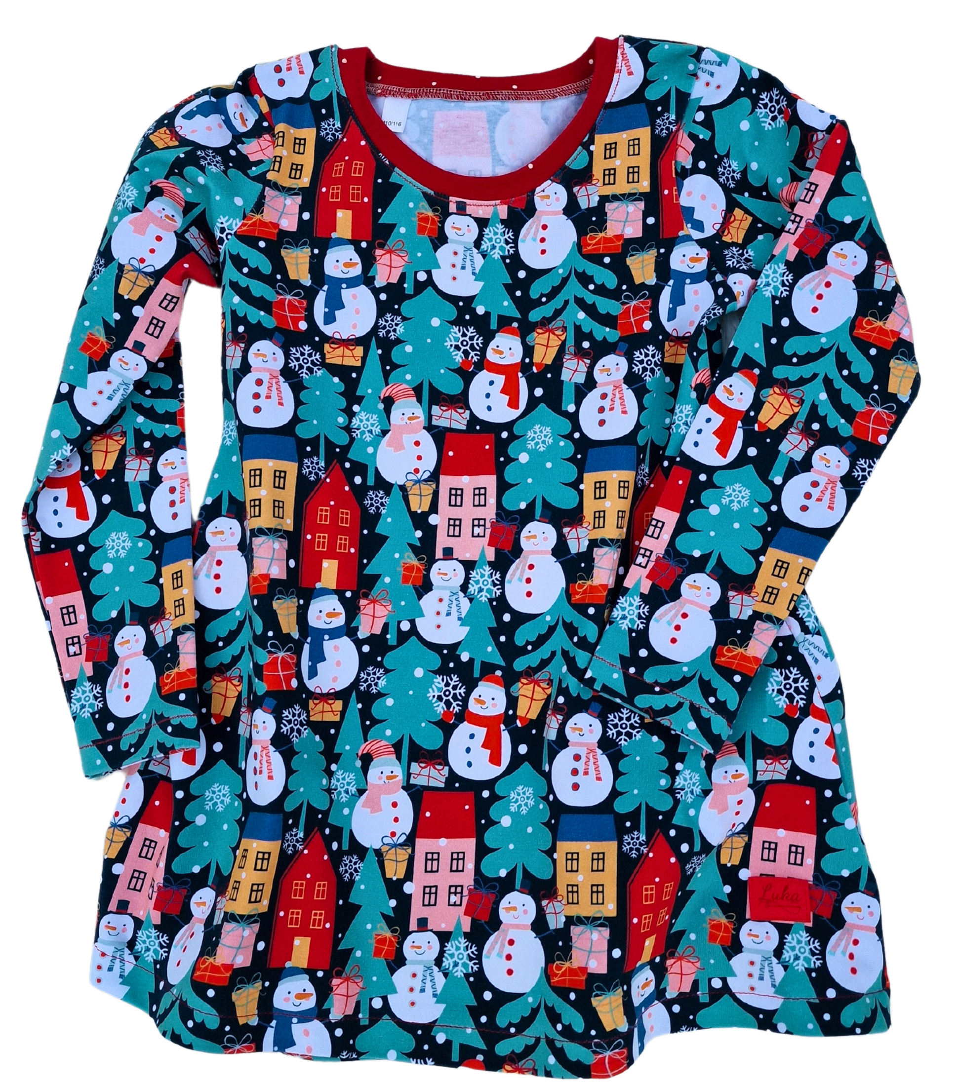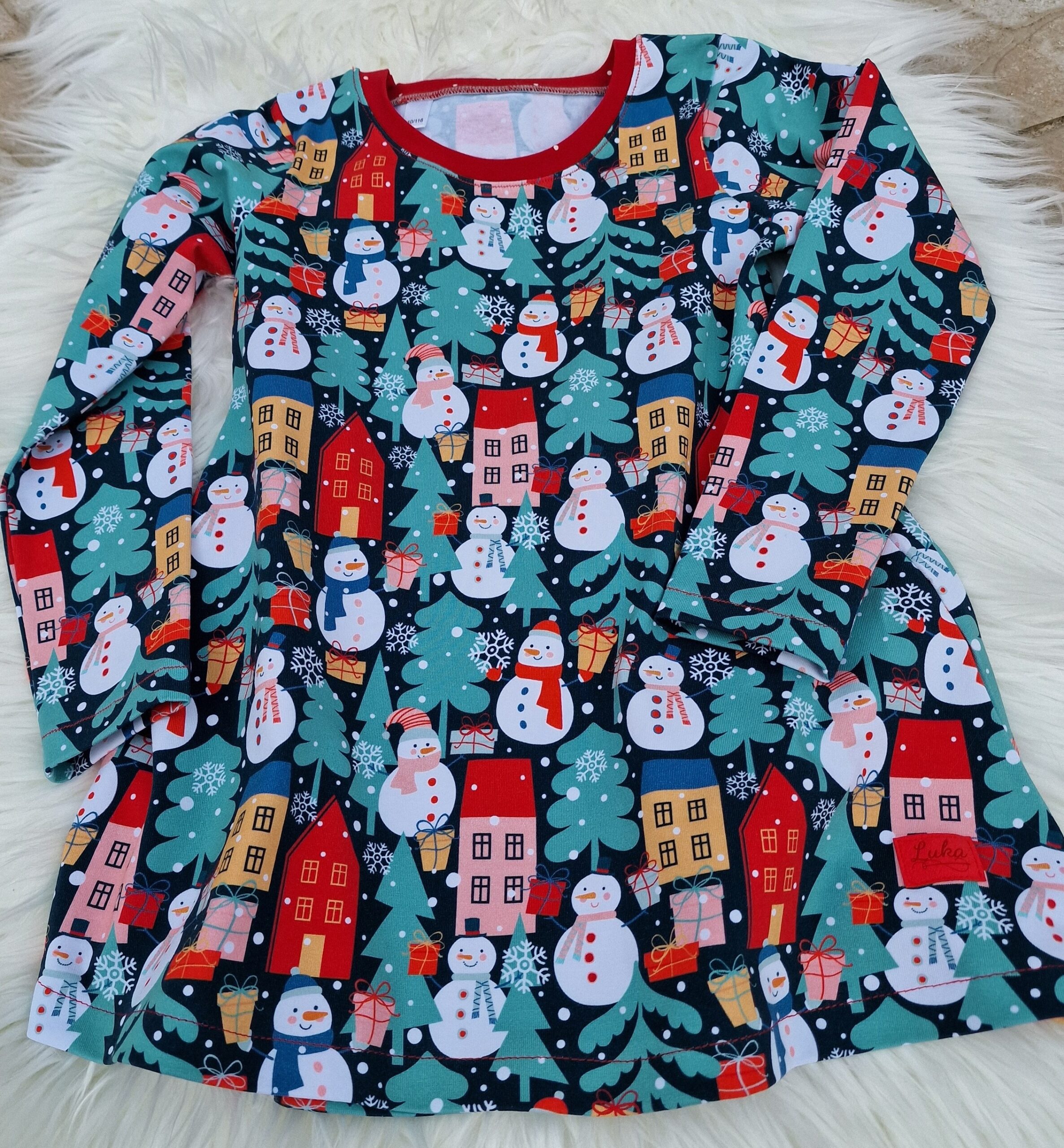 Otroška tunika z veselimi snežaki se lahko dolgo časa nosi – lahko je oblekica, lahko tunika preko pajkic ali pa majčka, ki lepo paše na hlače ali krilce.