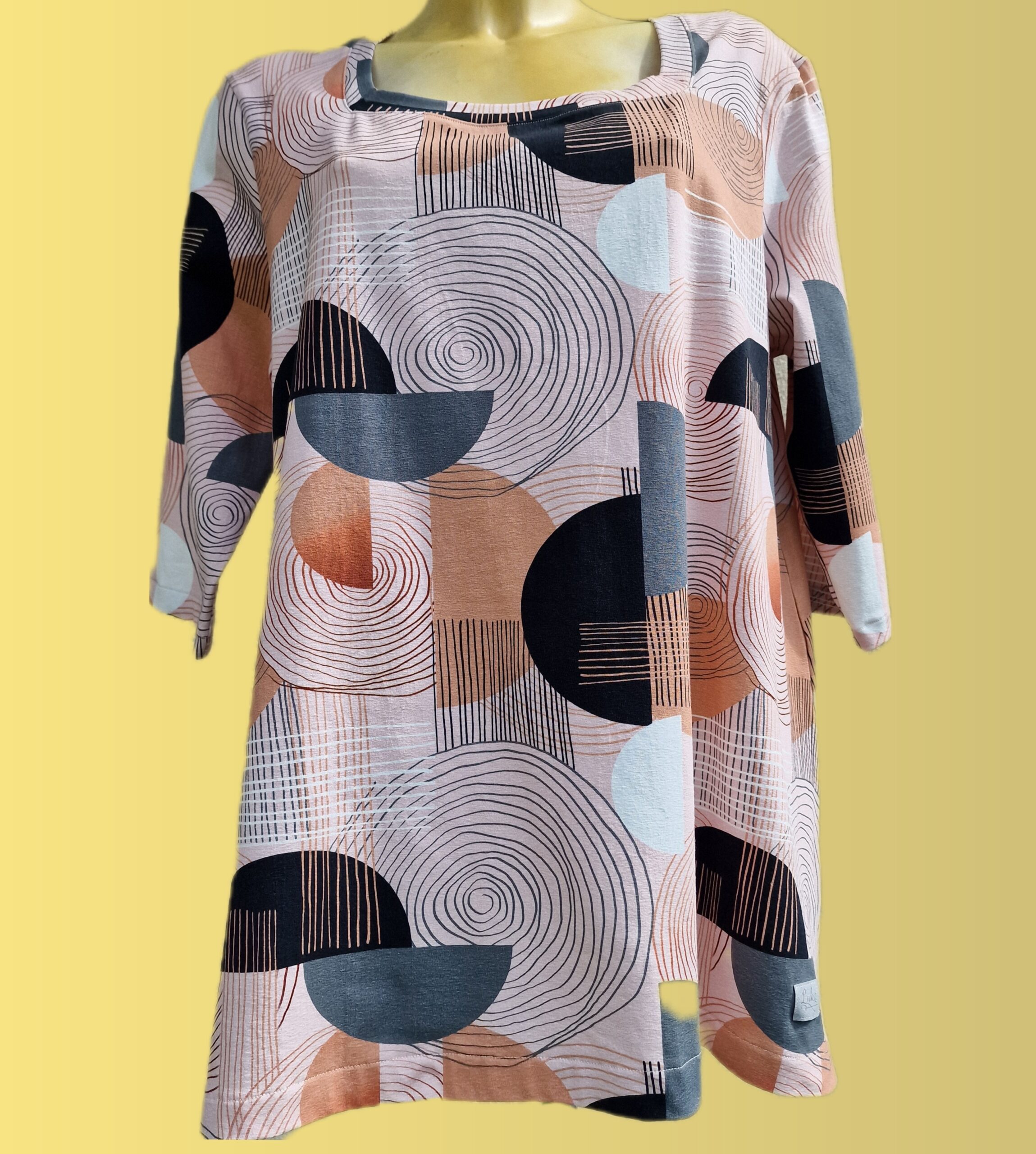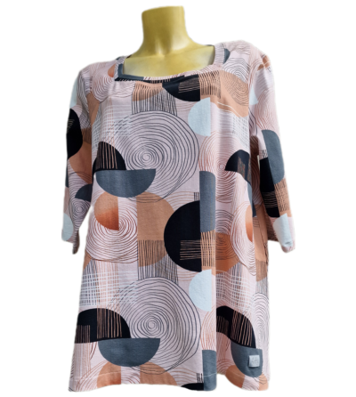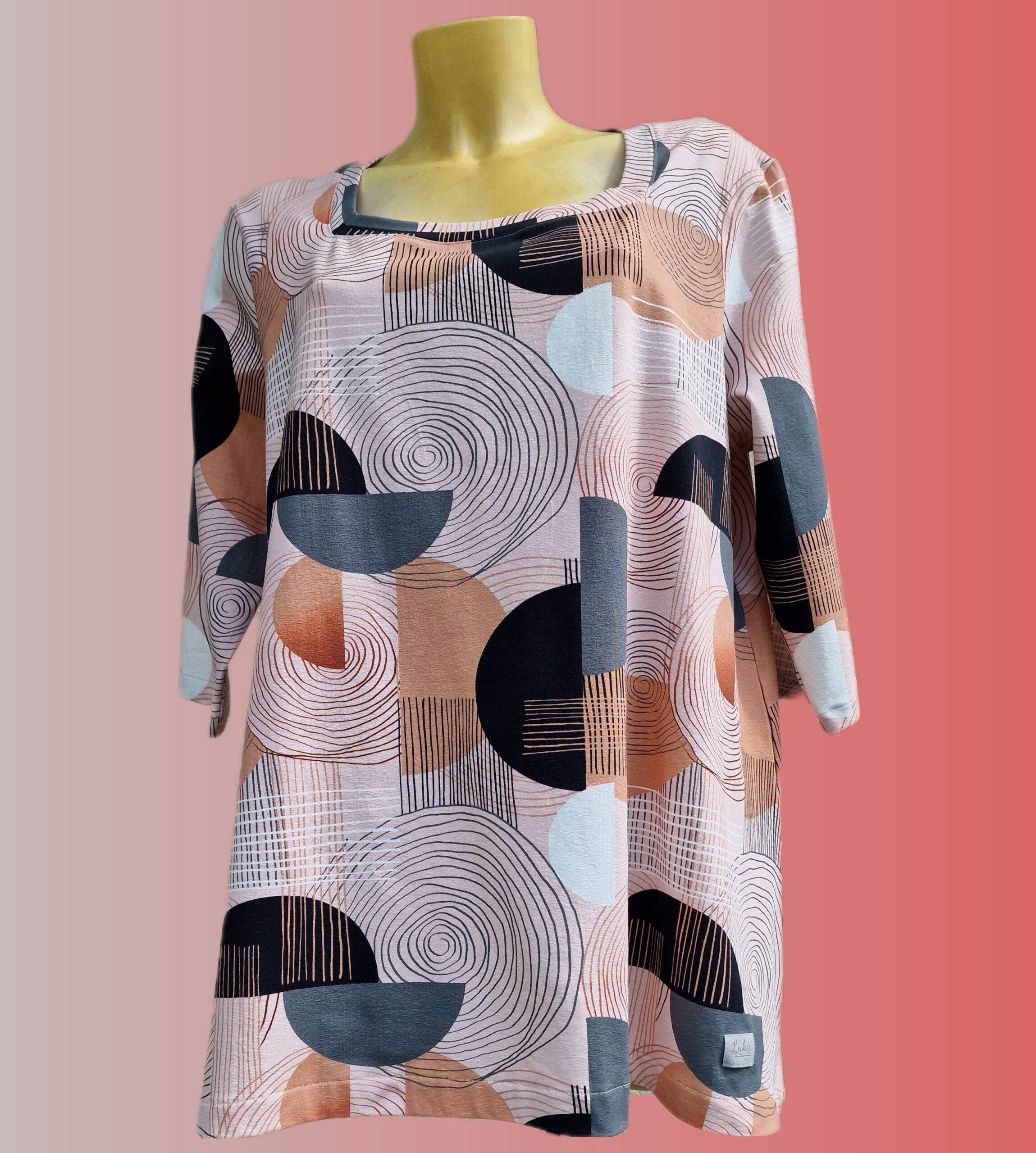 Tunika ima zanimiv geometrijski vzore, tričetrtinske rokave in vratni izrez, ki lepo pristaja postavi.